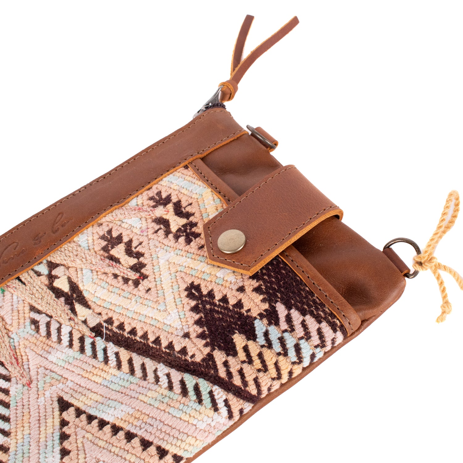 Many unique Maya symbols can be found in our One of a Kind Collection. The fabric we use for this collection is made from upcycled vintage huipiles (traditional attire worn by women in Guatemala) that were handwoven by Artisans up to 10 years ago, and they have lived a full life before being incorporated into your leather bag!