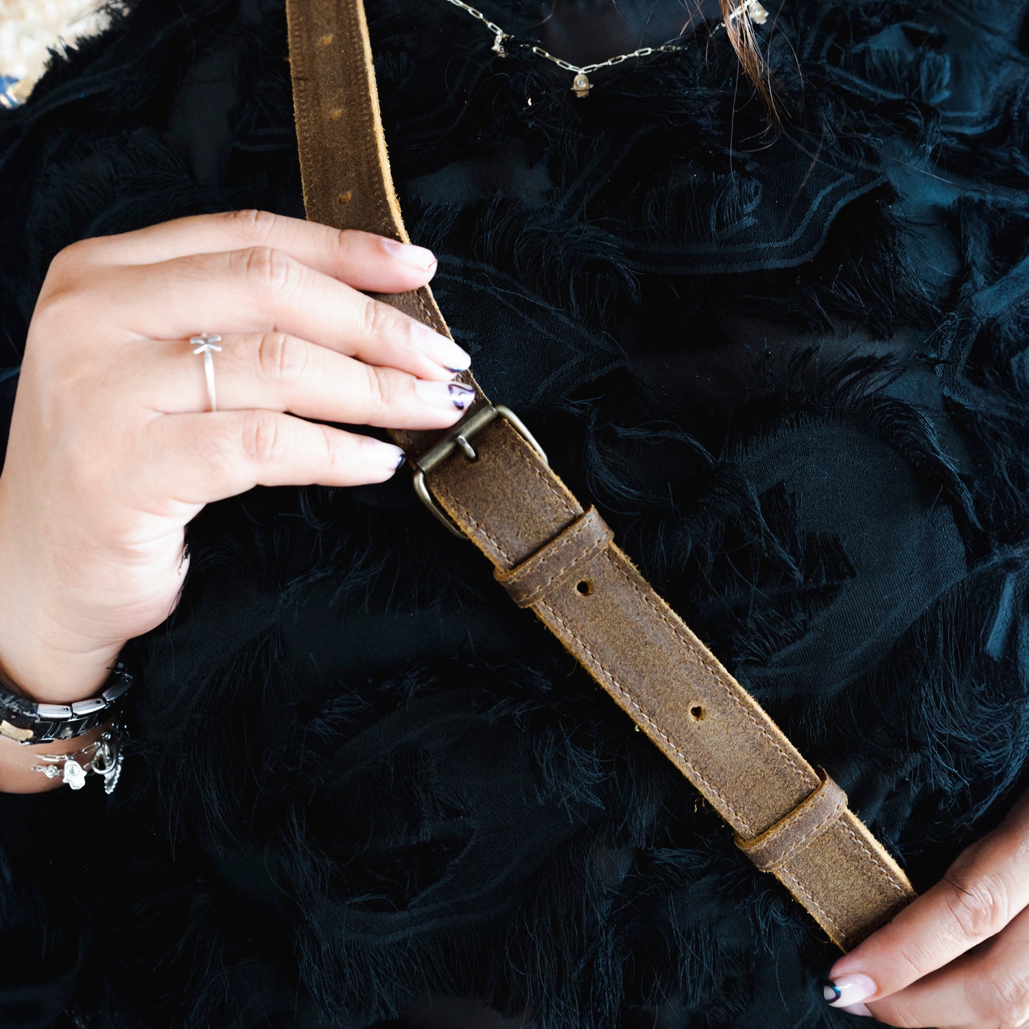 - Full grain leather body with adjustable and removable strap (Note: As it is made of a natural material, each bag varies slightly in texture and color)