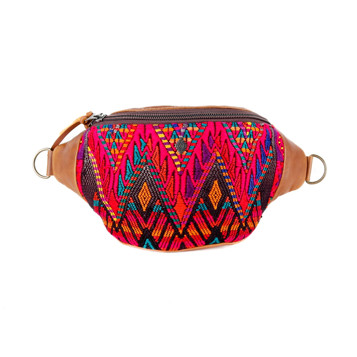 Many unique Maya symbols can be found in our One of a Kind Collection. The fabric we use for this collection is made from upcycled vintage huipiles (traditional attire worn by women in Guatemala) that were handwoven by Artisans up to 10 years ago, and they have lived a full life before being incorporated into your leather bag!