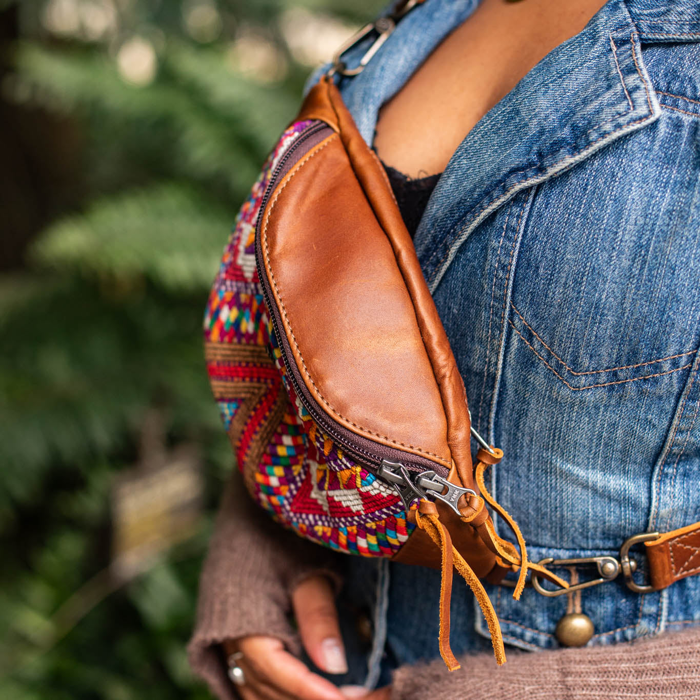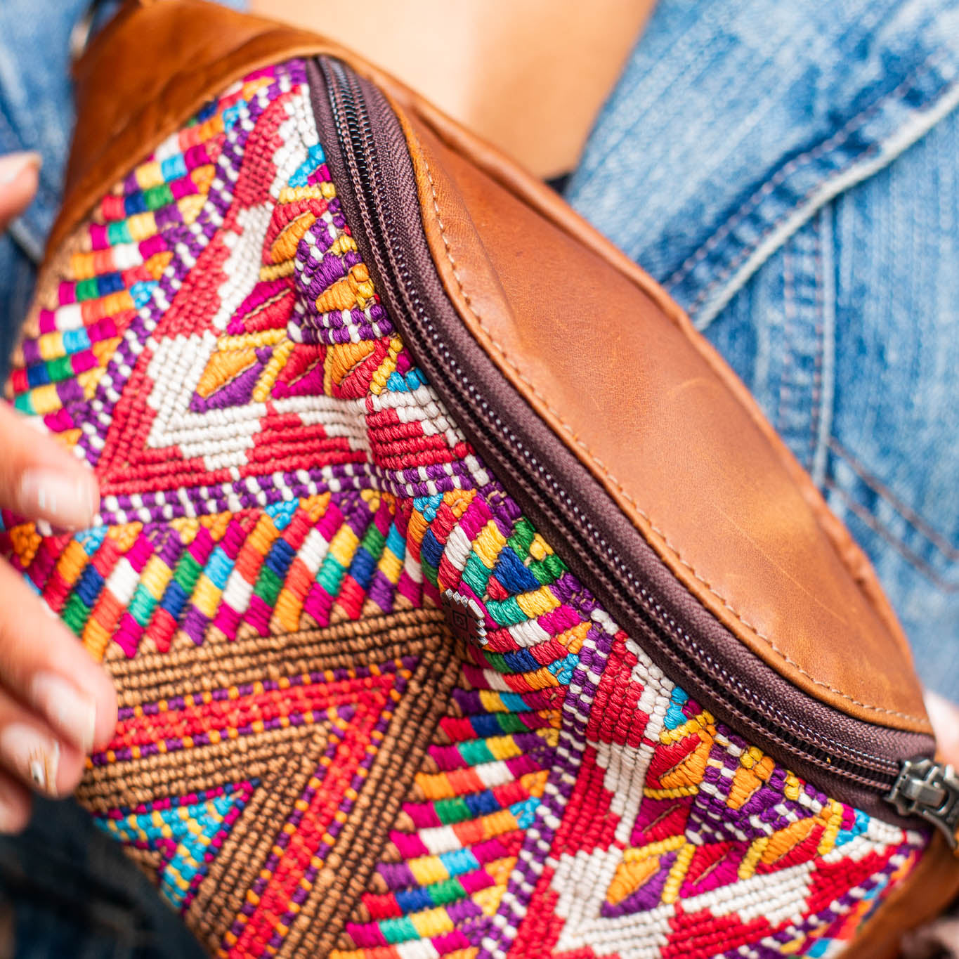 Many unique Maya symbols can be found in our One of a Kind Collection. The fabric we use for this collection is made from upcycled vintage huipiles (traditional attire worn by women in Guatemala) that were handwoven by Artisans up to 10 years ago, and they have lived a full life before being incorporated into your leather bag!
