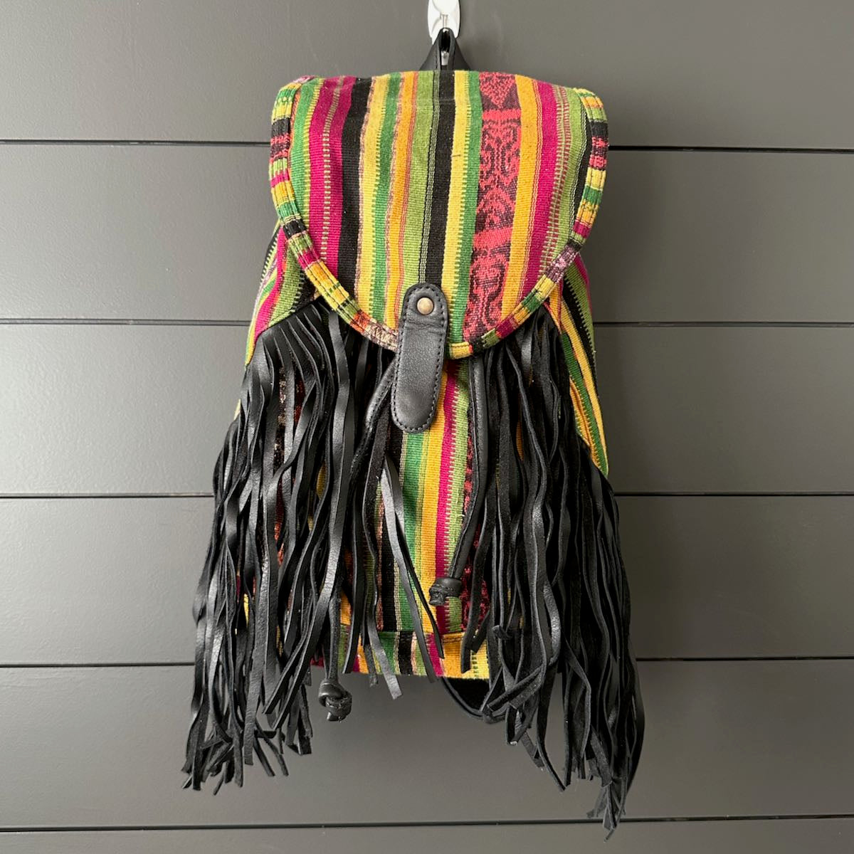 - Genuine leather fringe, base, hanging loop, shoulder straps, and bag opening