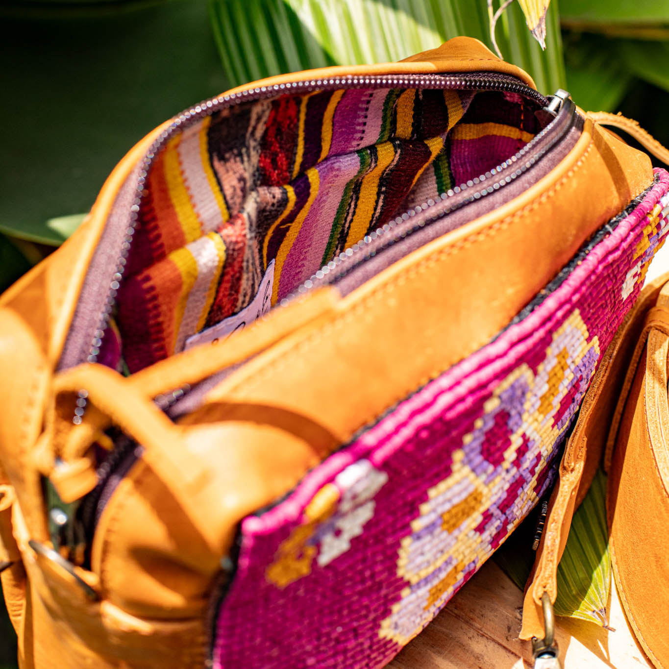 We make every effort to provide our customers with the best-handcrafted and high-quality bags. Please note that all our processes to make the bags are done by hand, from curing, cutting, and treating the leather to using up-cycled huipils. Our bags have natural characteristics and qualities that should not be considered as flaws or as damage because they do not interfere with the functionality of the bag. We up-cycle vintage Maya clothing to make beautiful one-of-a-kind products. Many times you will find snags in the pattern. This is normal. Should your patterned huipil snag you can snip the loose threads with scissors. Do not pull them.