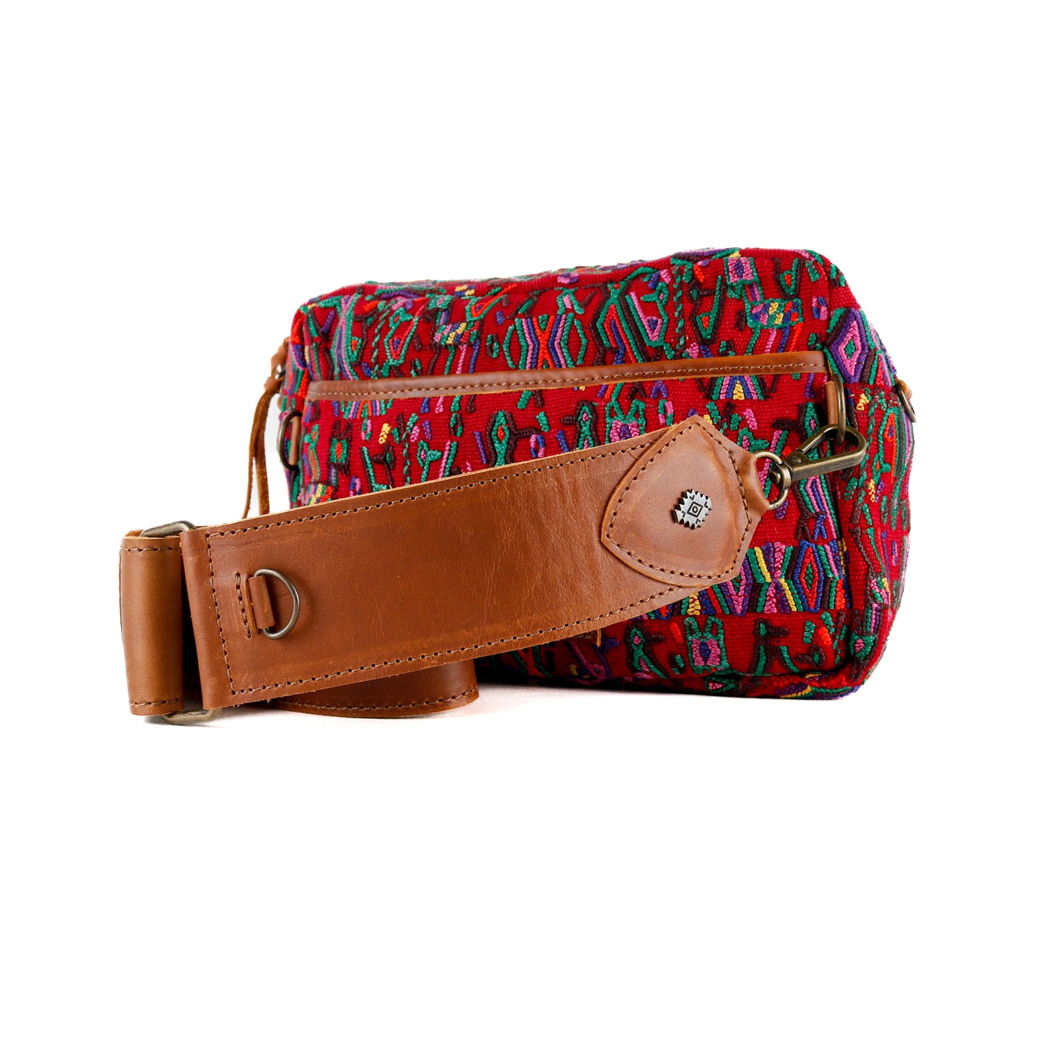 Many unique Maya symbols can be found in our One of a Kind Collection. The fabric we use for this collection is made from upcycled vintage huipiles (traditional attire worn by women in Guatemala) that were handwoven by Artisans up to 10 years ago, and they have lived a full life before being incorporated into your leather bag!