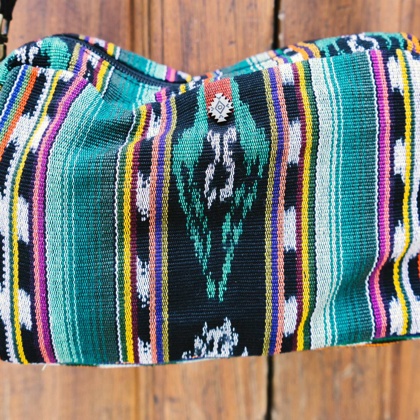 Many unique Maya symbols can be found in our One of a Kind Collection. The fabric we use for this collection is made from upcycled vintage huipiles (traditional attire worn by women in Guatemala) that were handwoven by Artisans up to 10 years ago, and they have lived a full life before being incorporated into your leather bag!