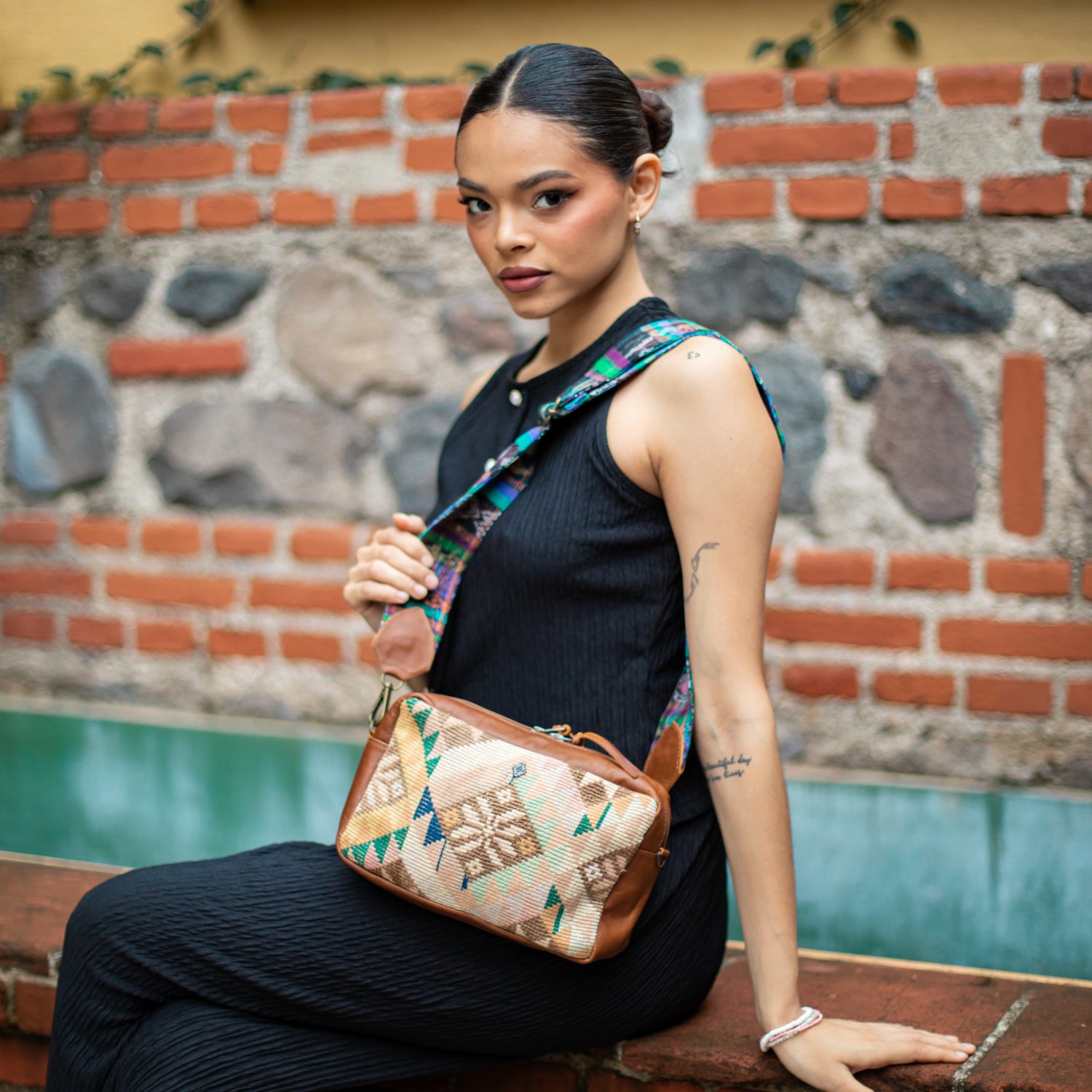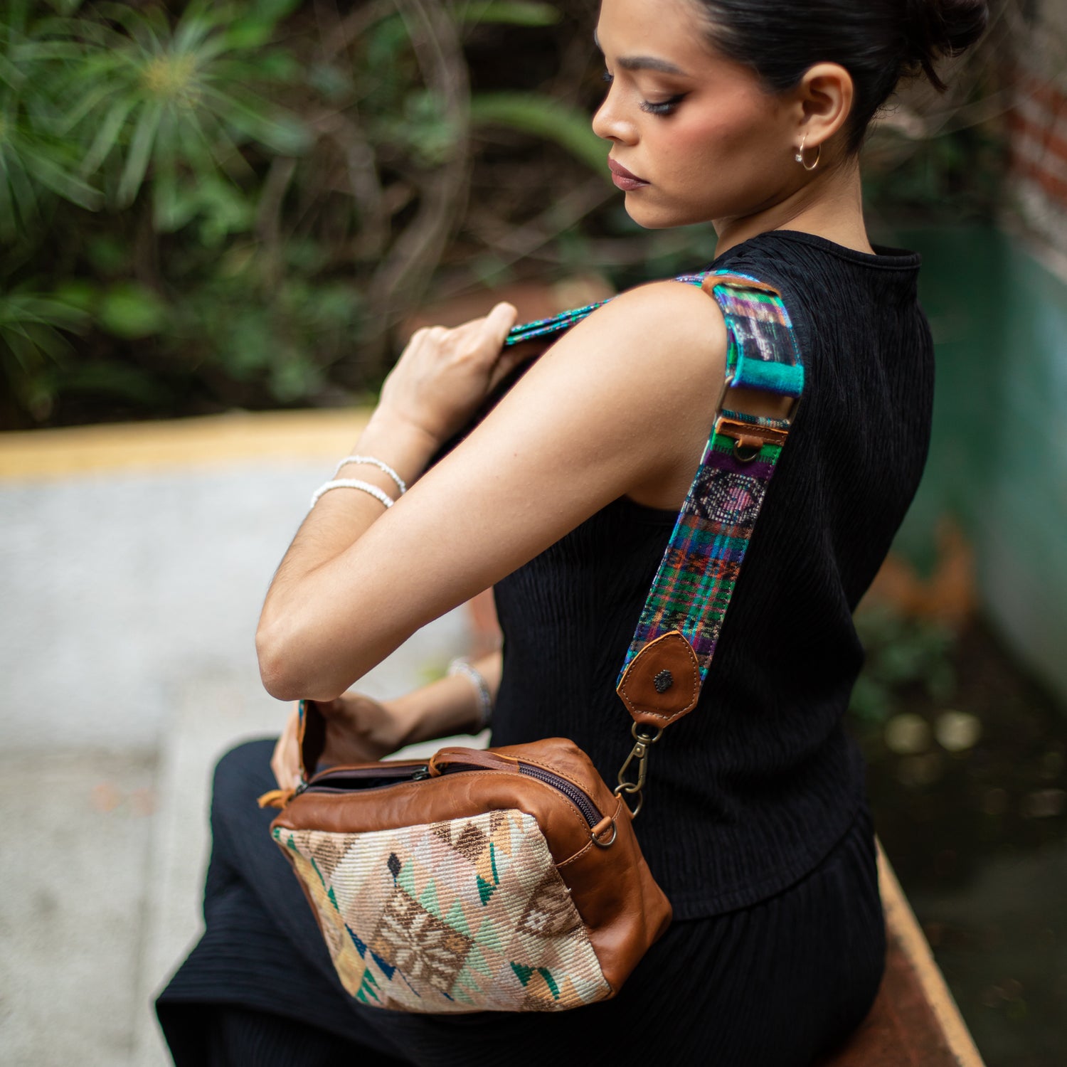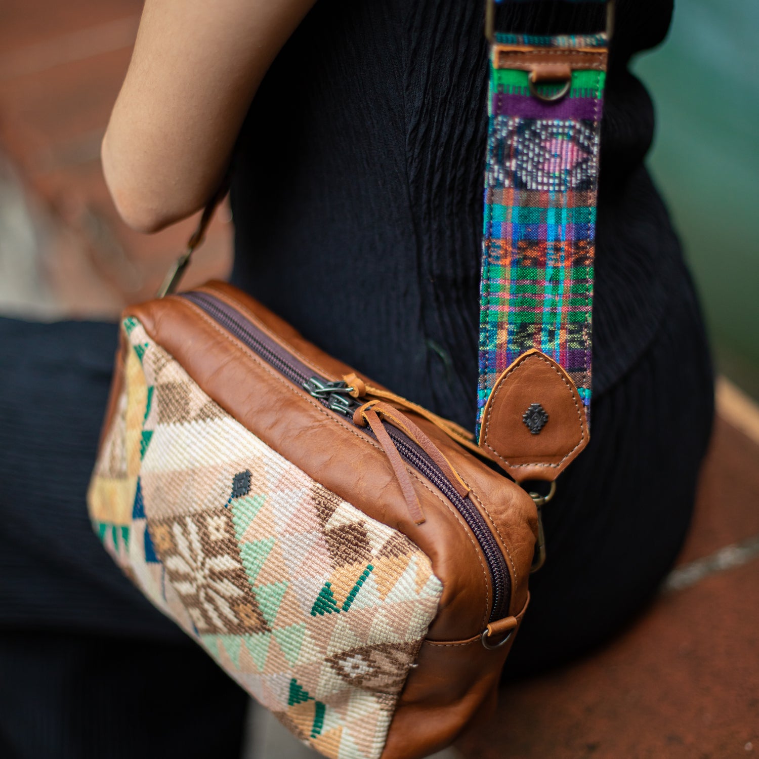 Many unique Maya symbols can be found in our One of a Kind Collection. The fabric we use for this collection is made from upcycled vintage huipiles (traditional attire worn by women in Guatemala) that were handwoven by Artisans up to 10 years ago, and they have lived a full life before being incorporated into your leather bag!