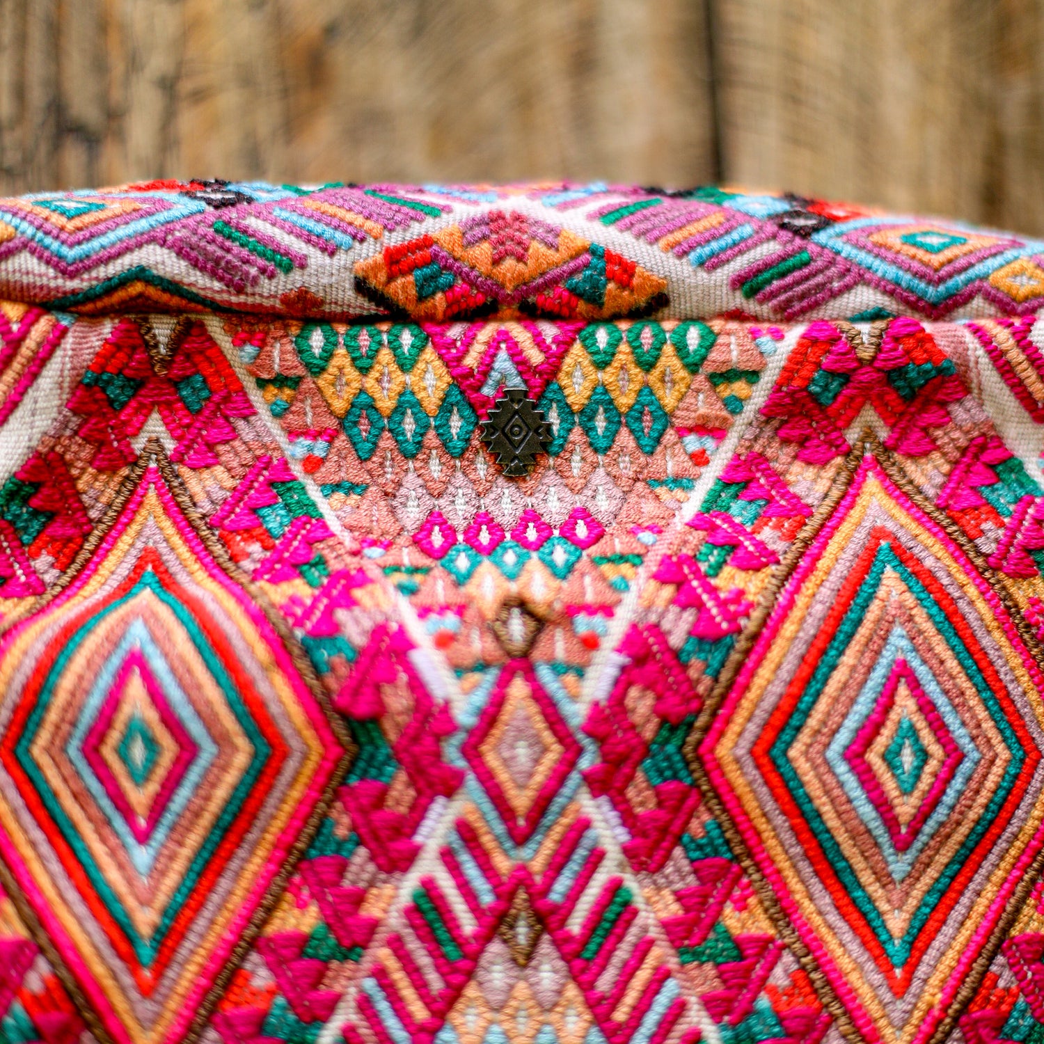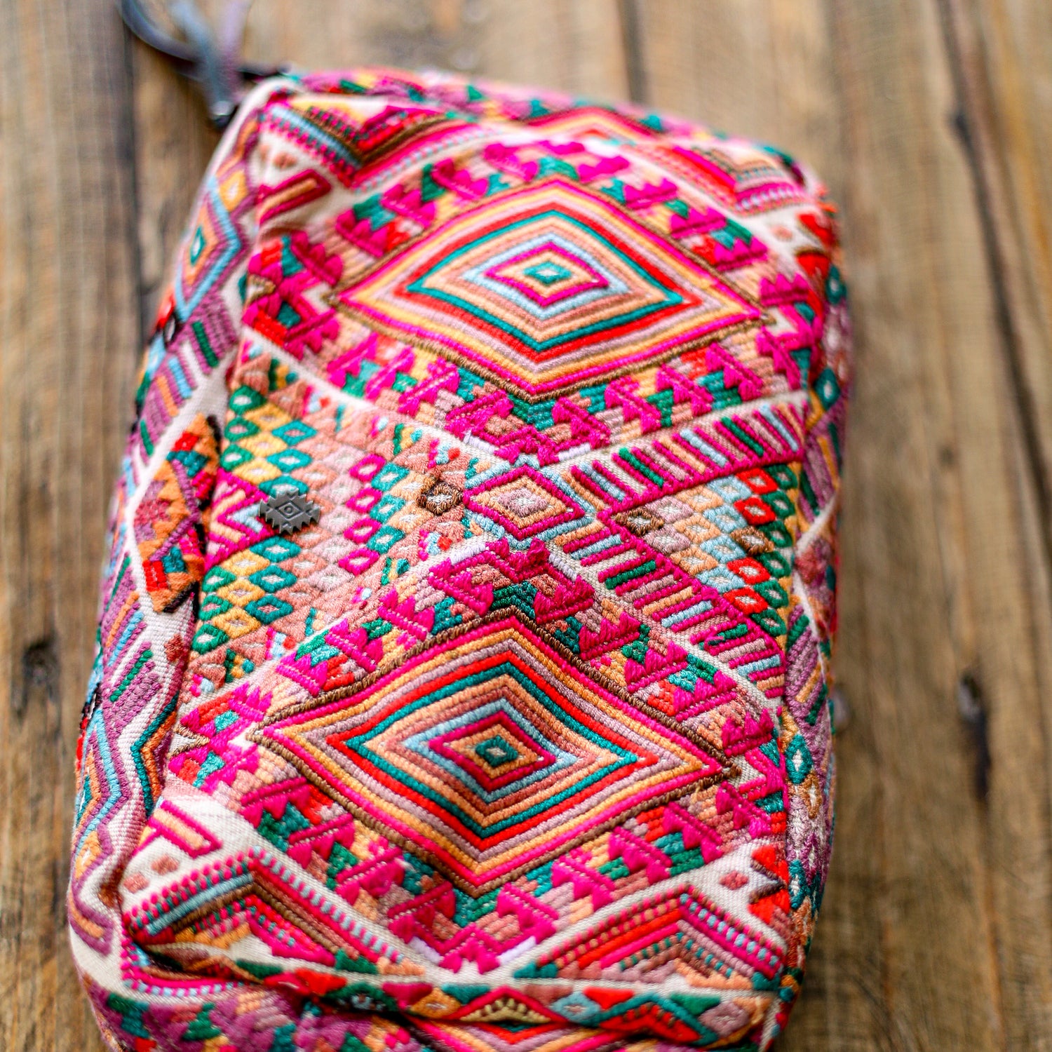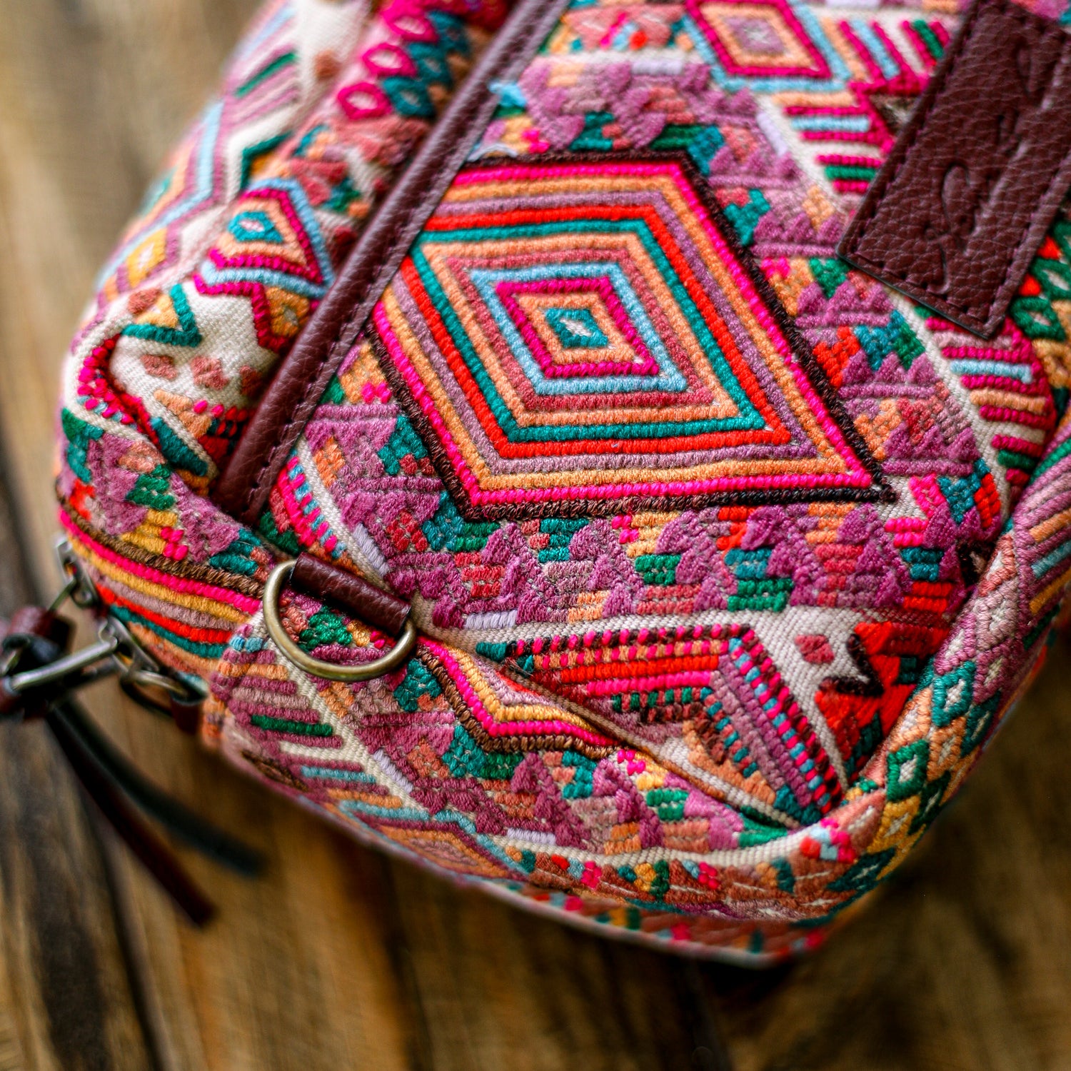 Many unique Maya symbols can be found in our One of a Kind Collection. The fabric we use for this collection is made from upcycled vintage huipiles (traditional attire worn by women in Guatemala) that were handwoven by Artisans up to 10 years ago, and they have lived a full life before being incorporated into your leather bag!