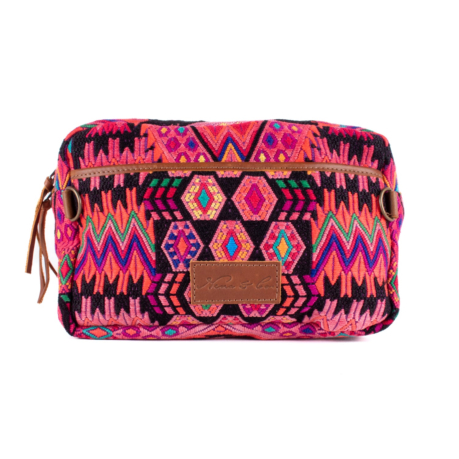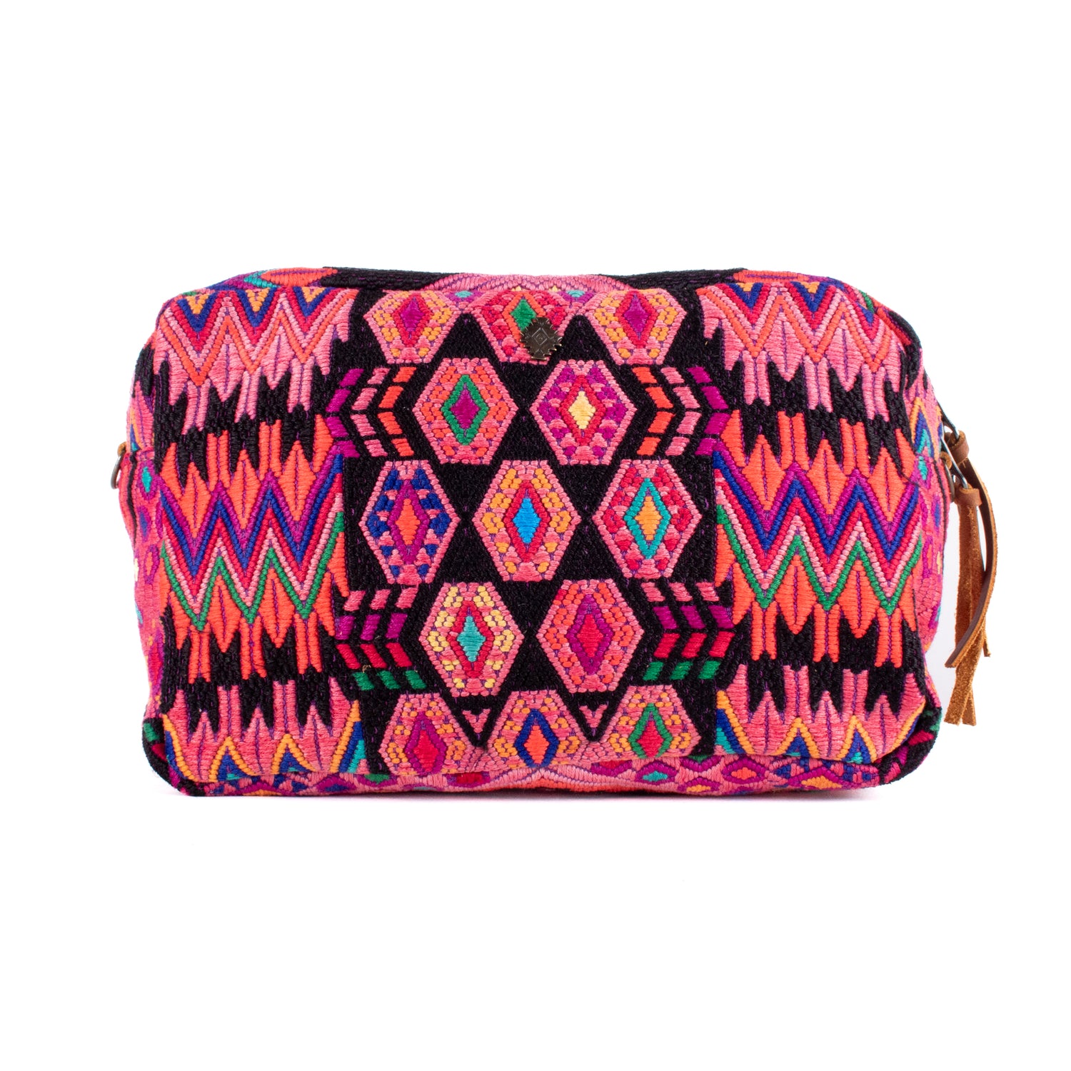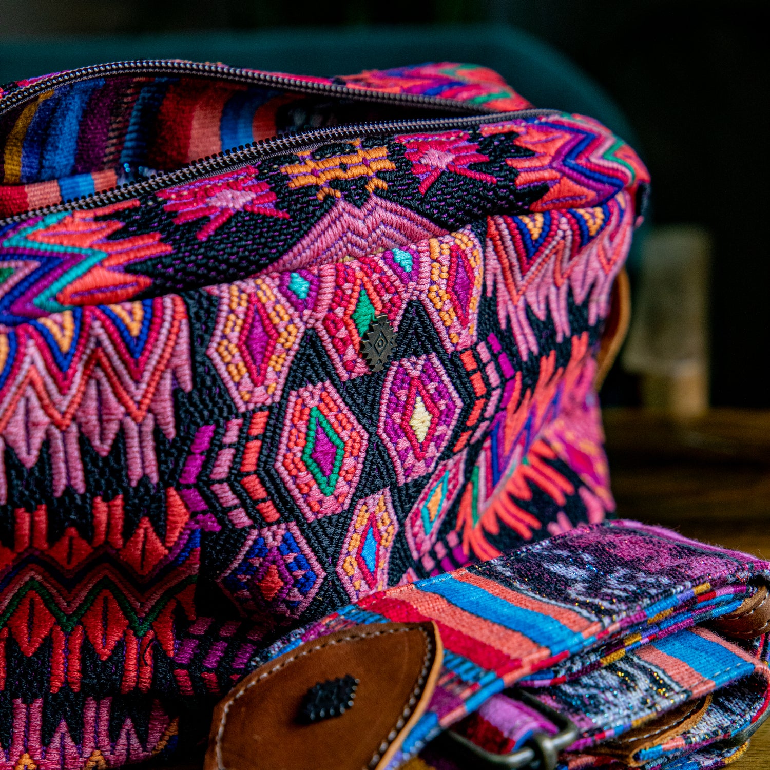 Many unique Maya symbols can be found in our One of a Kind Collection. The fabric we use for this collection is made from upcycled vintage huipiles (traditional attire worn by women in Guatemala) that were handwoven by Artisans up to 10 years ago, and they have lived a full life before being incorporated into your leather bag!