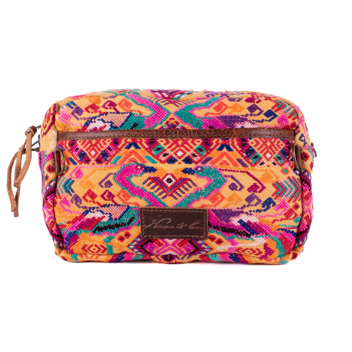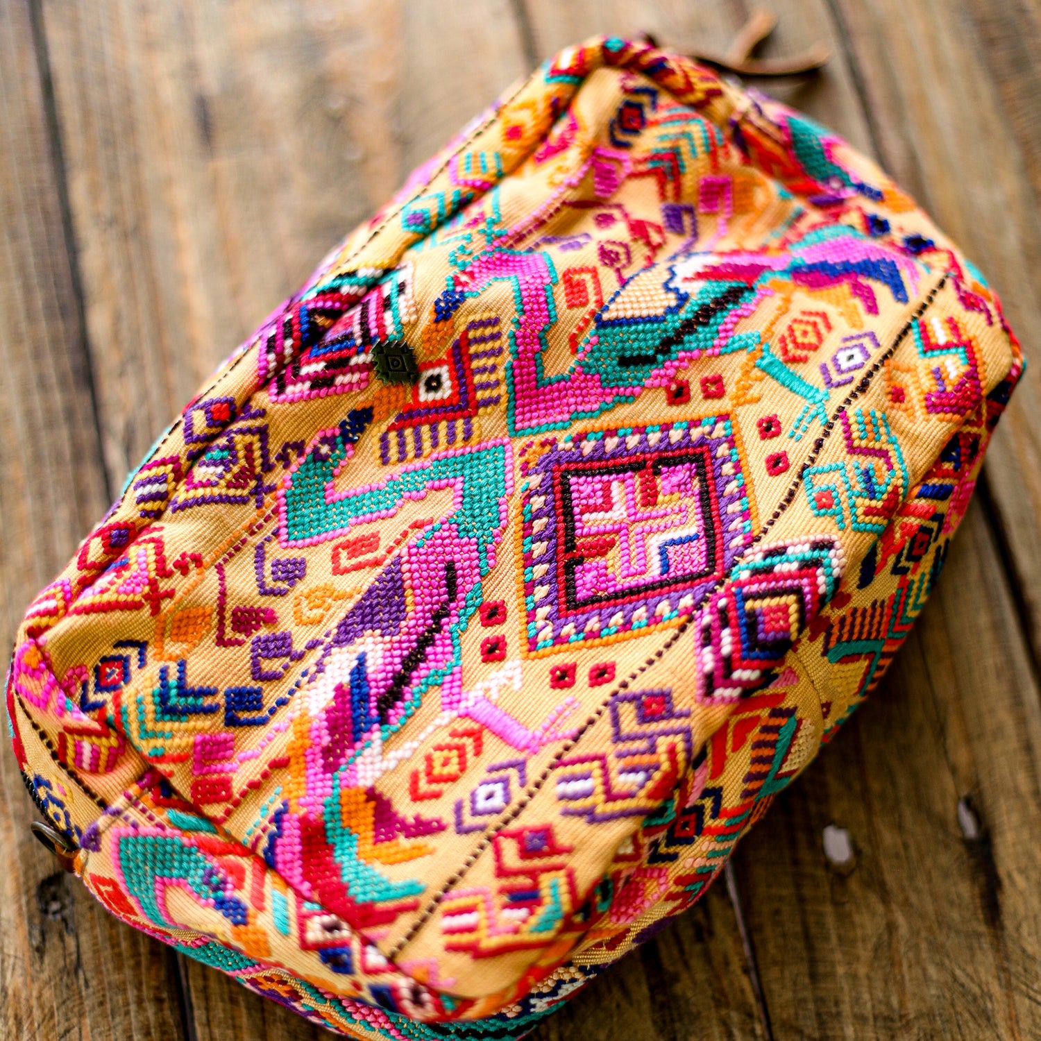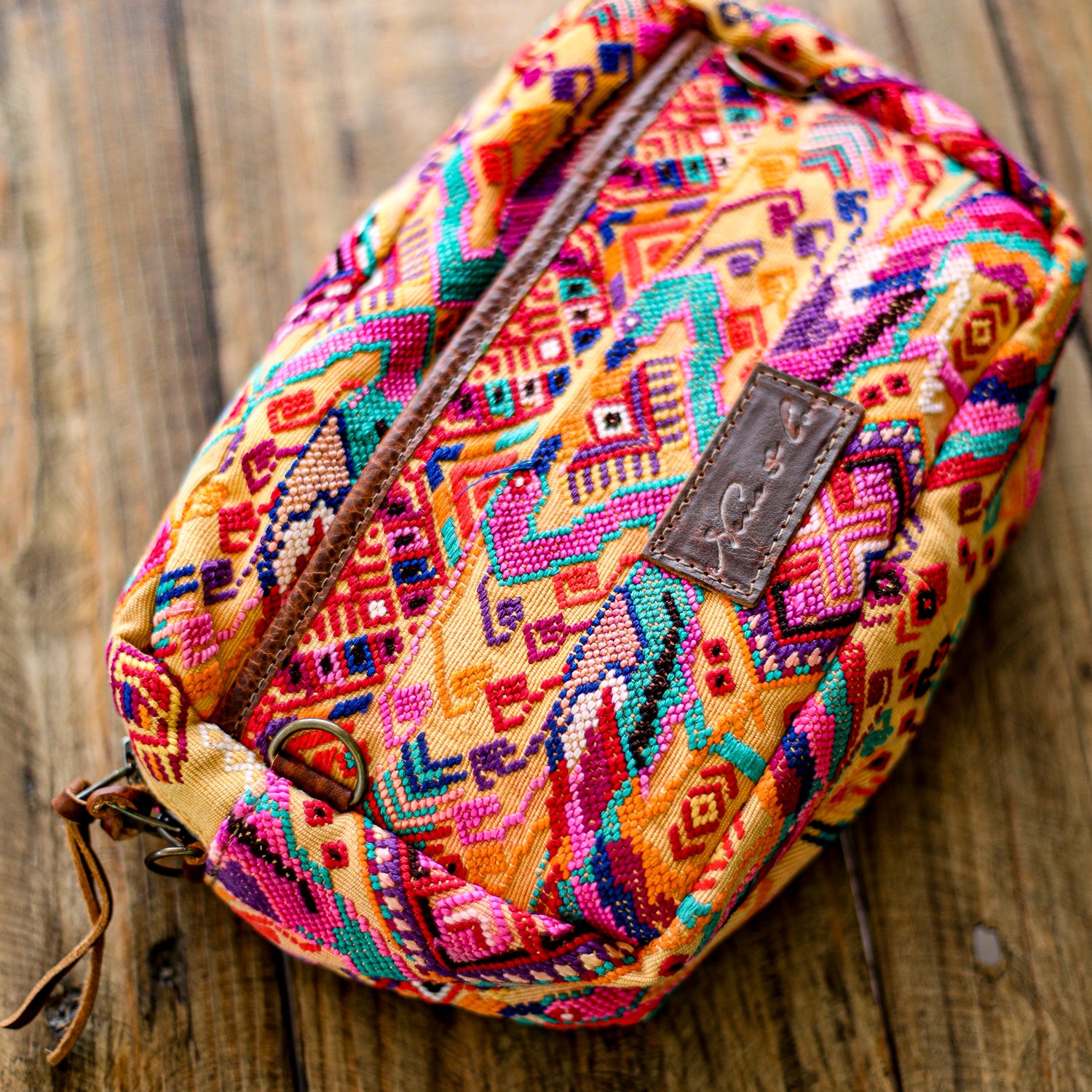 Many unique Maya symbols can be found in our One of a Kind Collection. The fabric we use for this collection is made from upcycled vintage huipiles (traditional attire worn by women in Guatemala) that were handwoven by Artisans up to 10 years ago, and they have lived a full life before being incorporated into your leather bag!