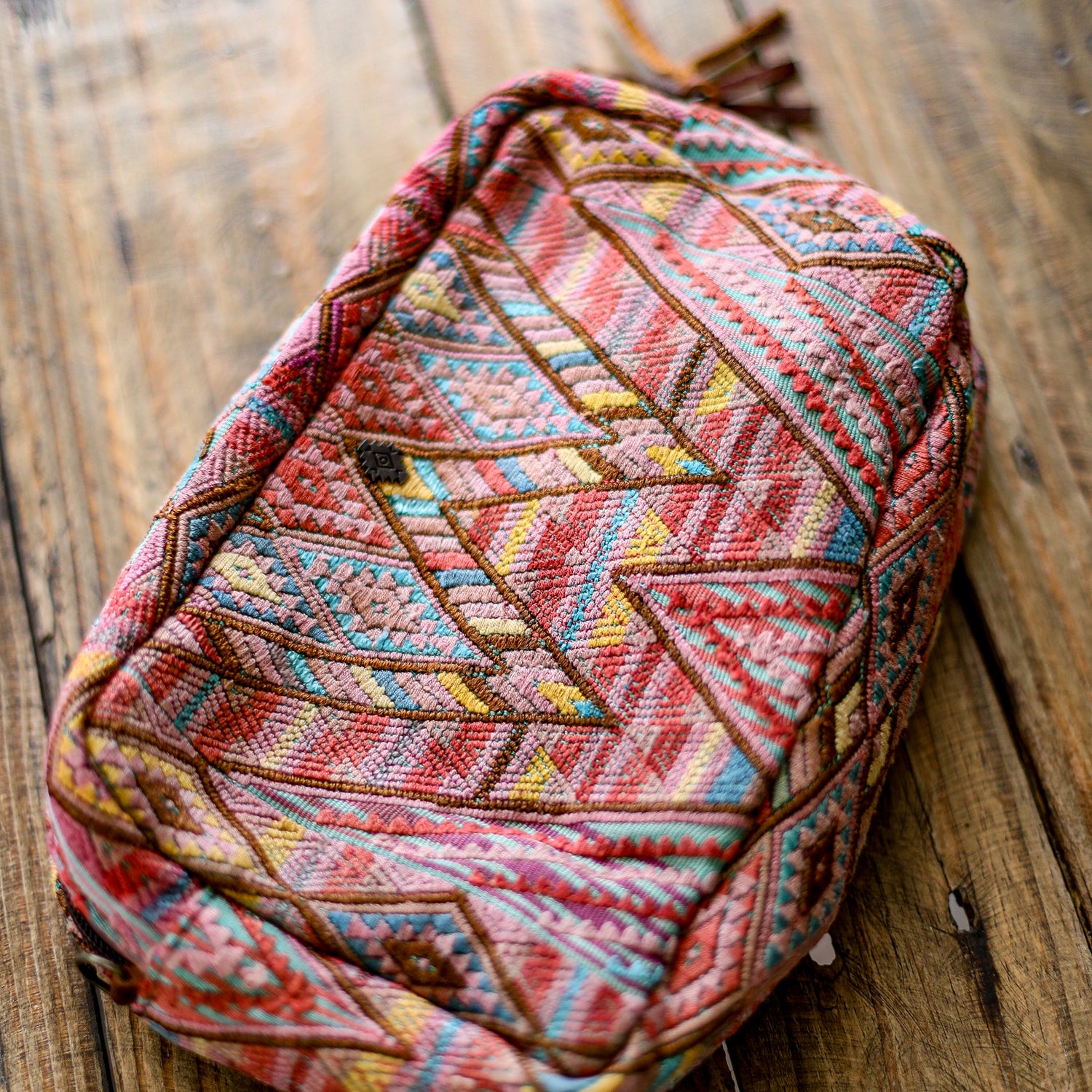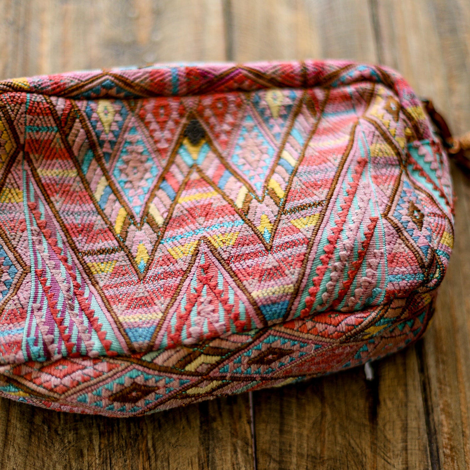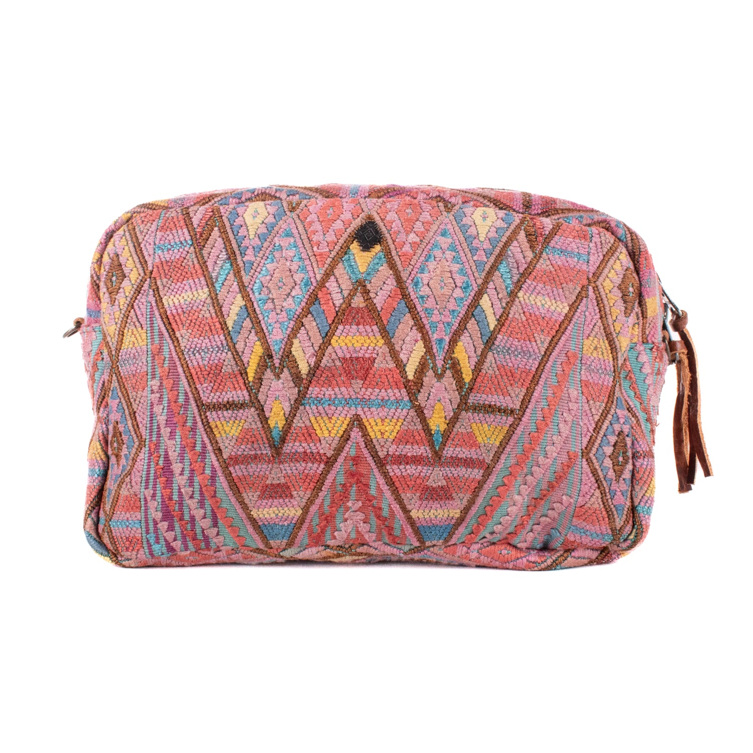 Many unique Maya symbols can be found in our One of a Kind Collection. The fabric we use for this collection is made from upcycled vintage huipiles (traditional attire worn by women in Guatemala) that were handwoven by Artisans up to 10 years ago, and they have lived a full life before being incorporated into your leather bag!