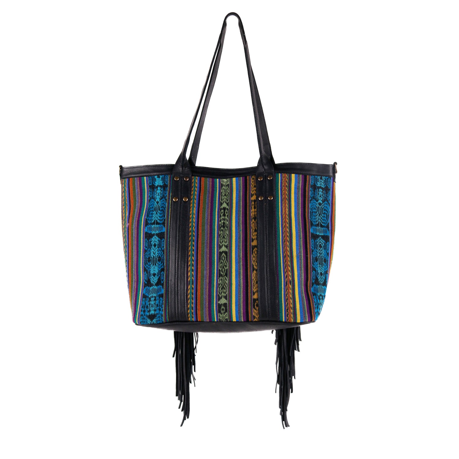- Full grain leather base, fringe, handles, trim, and cross body strap