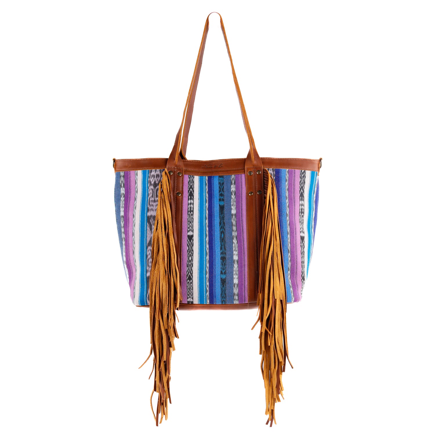- Full grain leather base, fringe, handles, trim, and cross body strap