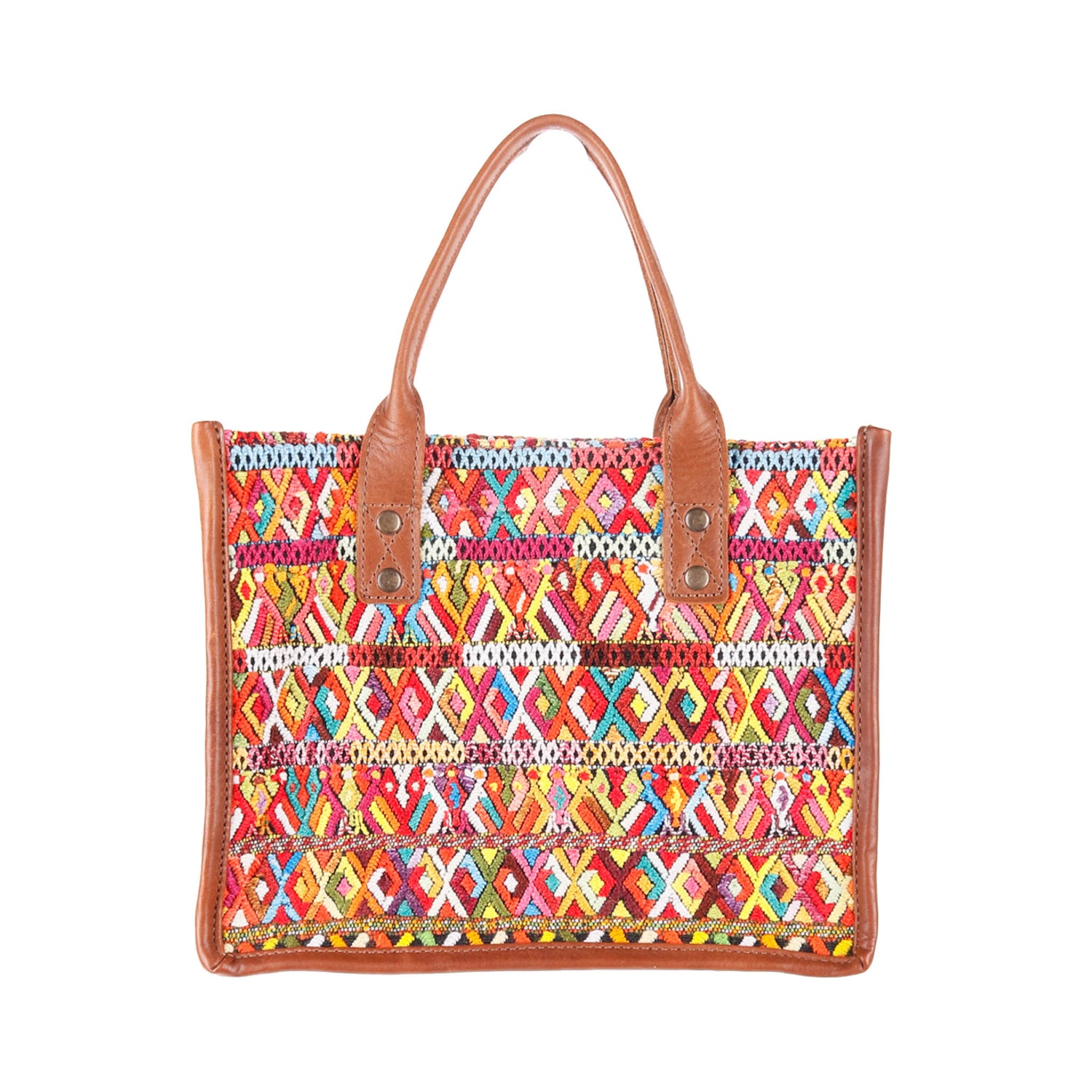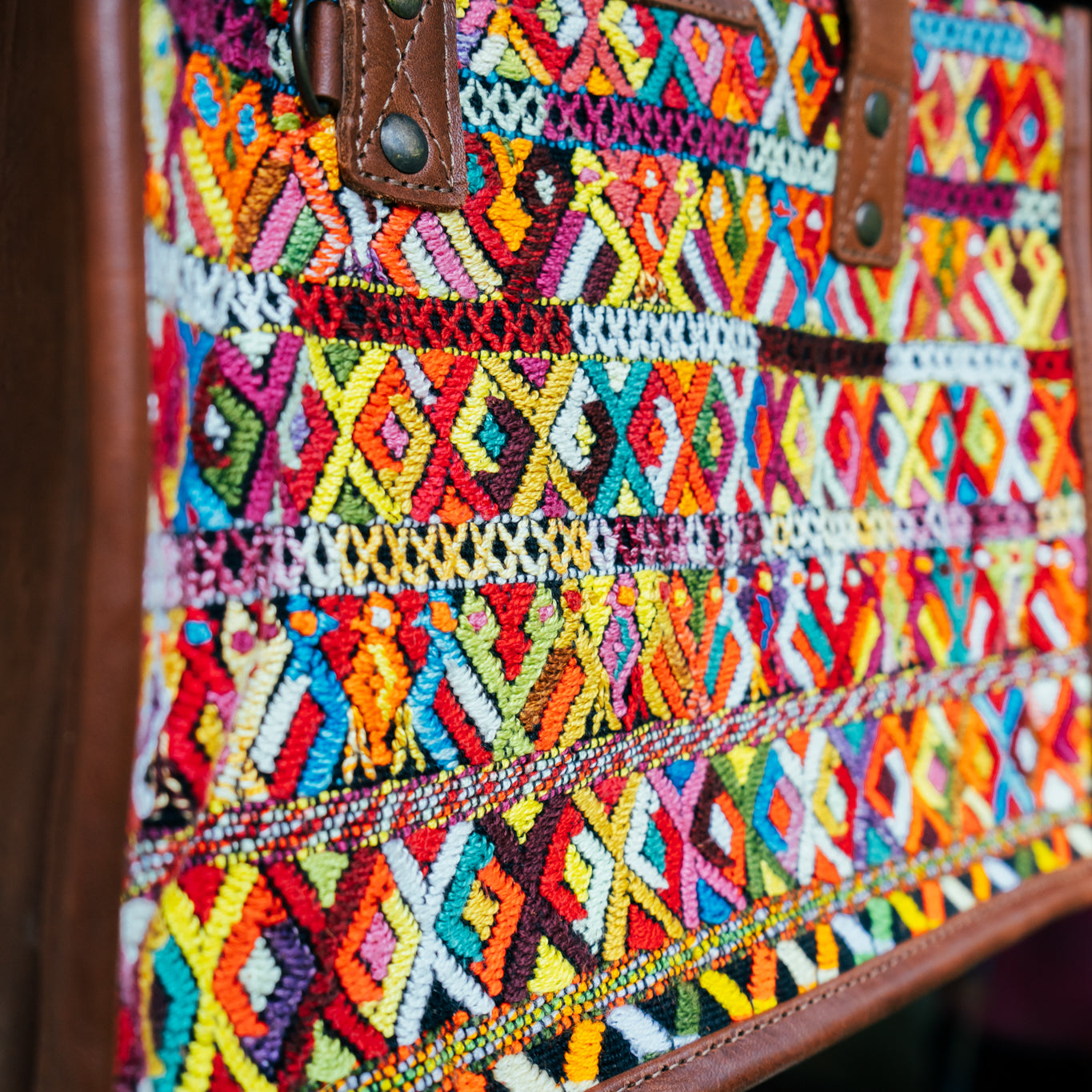 Many unique Maya symbols can be found in our One of a Kind Collection. The fabric we use for this collection is made from upcycled vintage huipiles (traditional attire worn by women in Guatemala) that were handwoven by Artisans up to 10 years ago, and they have lived a full life before being incorporated into your leather bag!