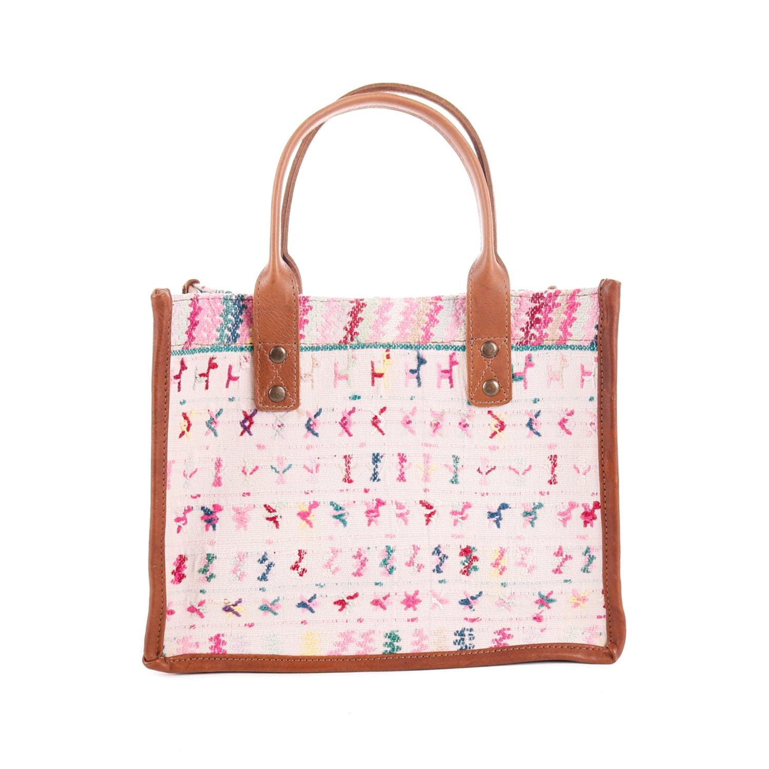 Many unique Maya symbols can be found in our One of a Kind Collection. The fabric we use for this collection is made from upcycled vintage huipiles (traditional attire worn by women in Guatemala) that were handwoven by Artisans up to 10 years ago, and they have lived a full life before being incorporated into your leather bag!