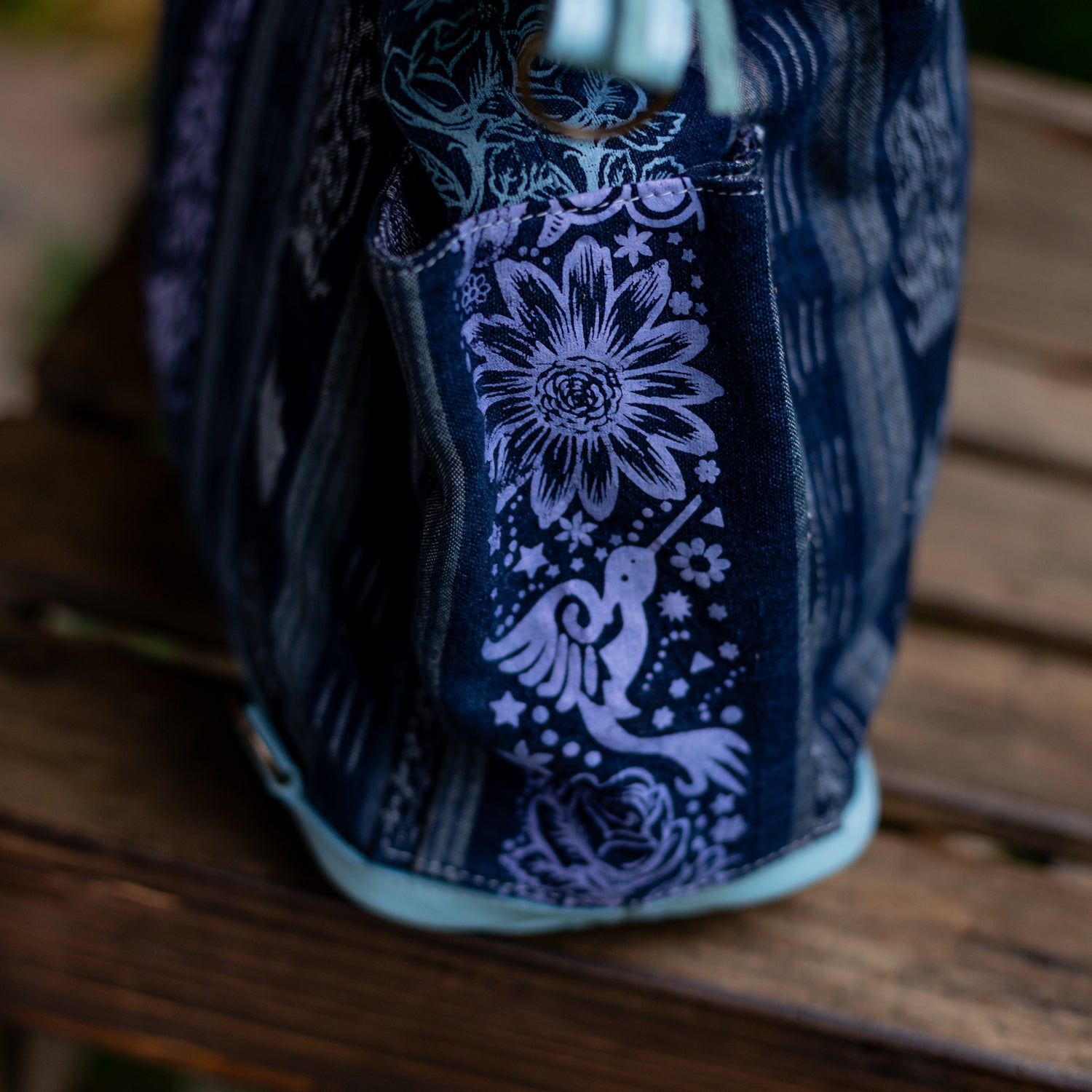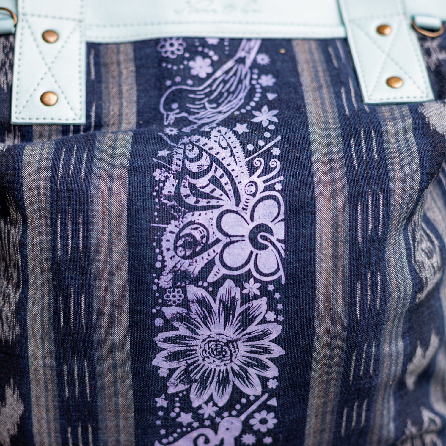 In Maya tradition, the Moon goddess Ixchel is the goddess of Womanhood. The Moon represents many aspects of womanhood, including the cycles of life, fertility, healing, and the textile arts. Appearing on a bag, the Moon means something different to every wearer, because no two women experience Womanhood the same way.