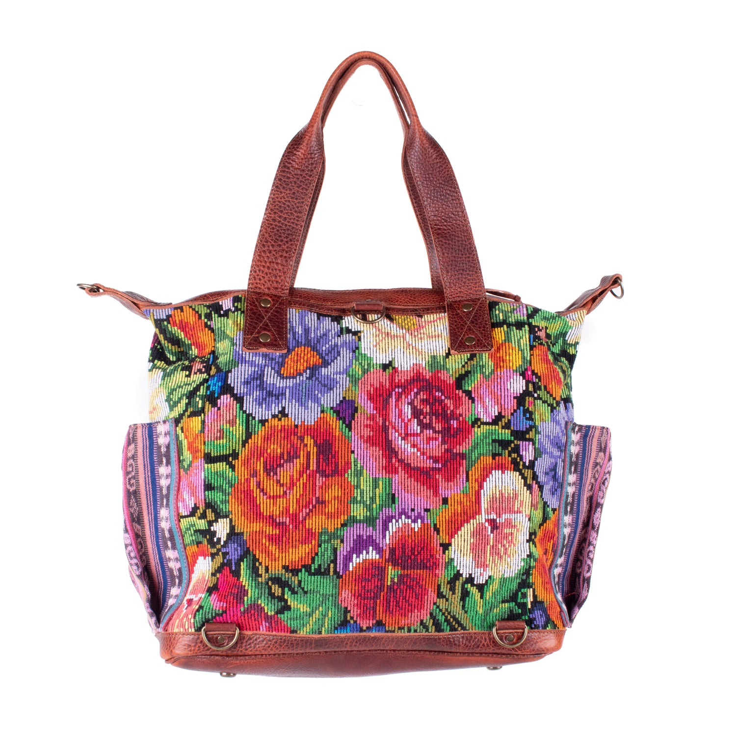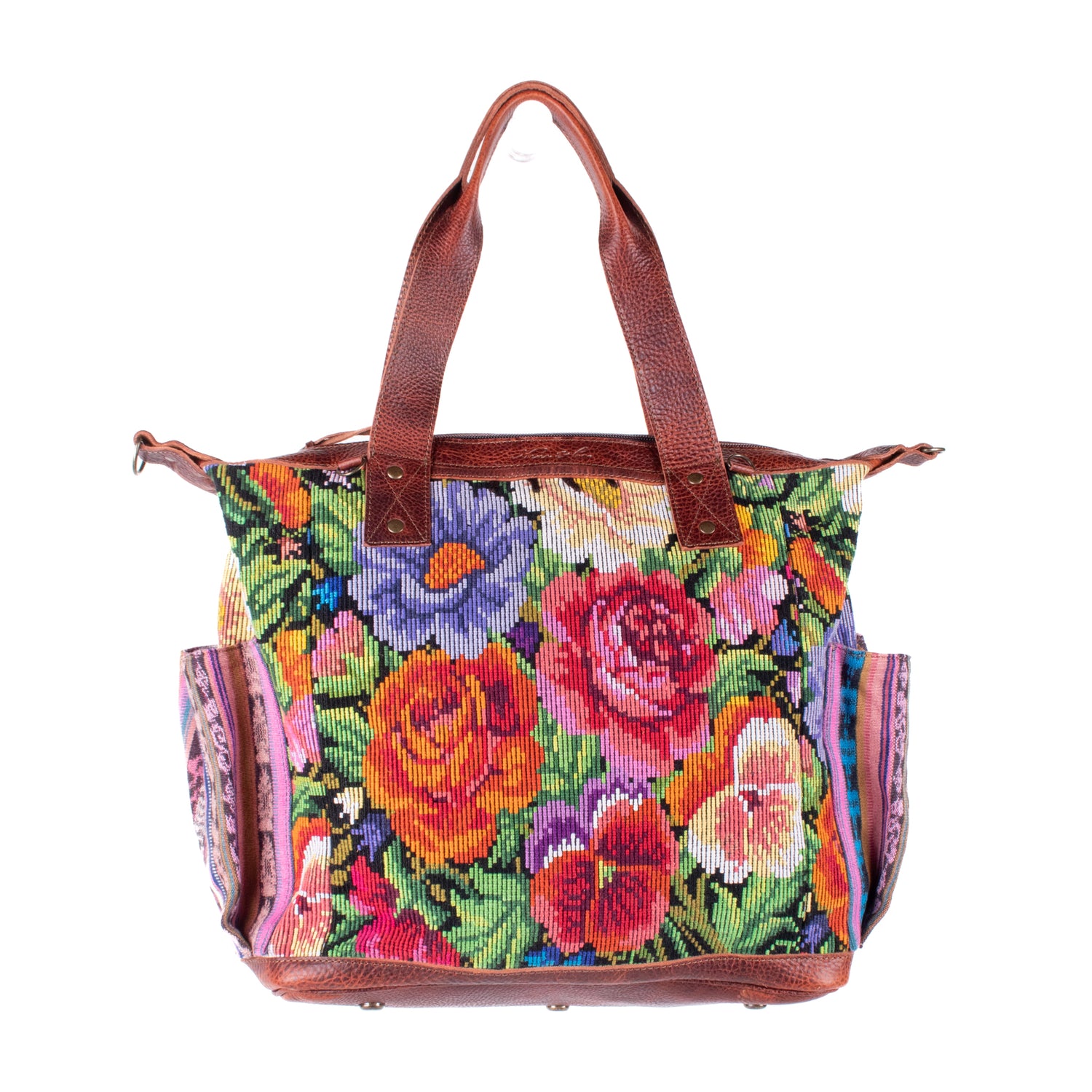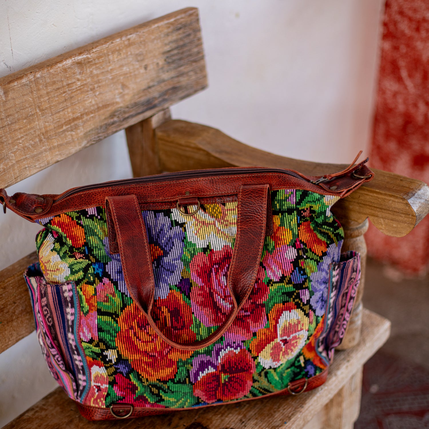 Many unique Maya symbols can be found in our One of a Kind Collection. The fabric we use for this collection is made from upcycled vintage huipiles (traditional attire worn by women in Guatemala) that were handwoven by Artisans up to 10 years ago, and they have lived a full life before being incorporated into your leather bag!