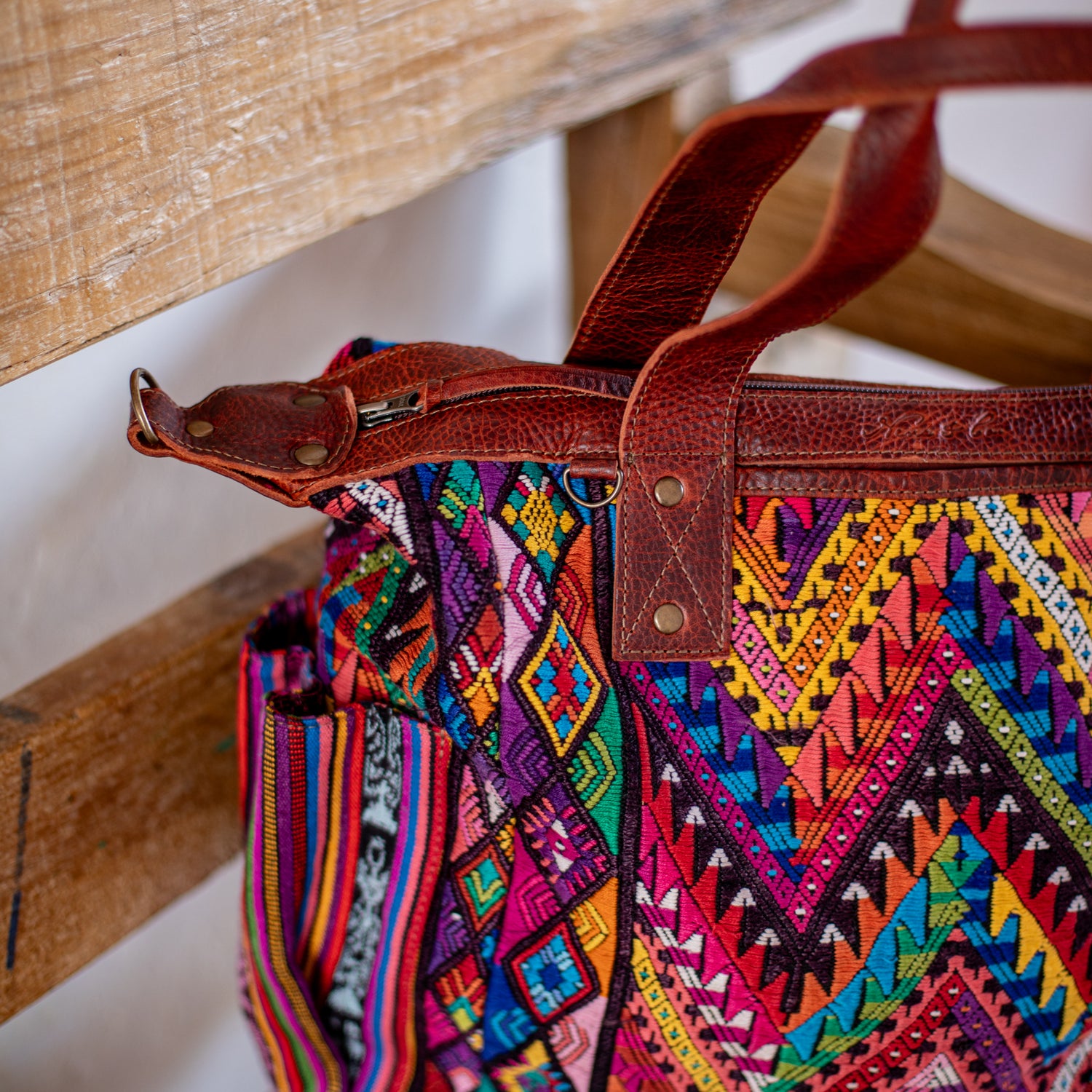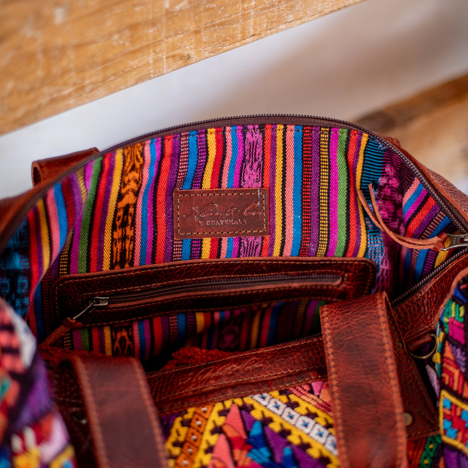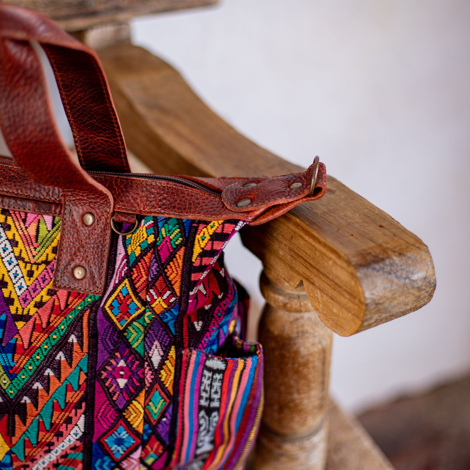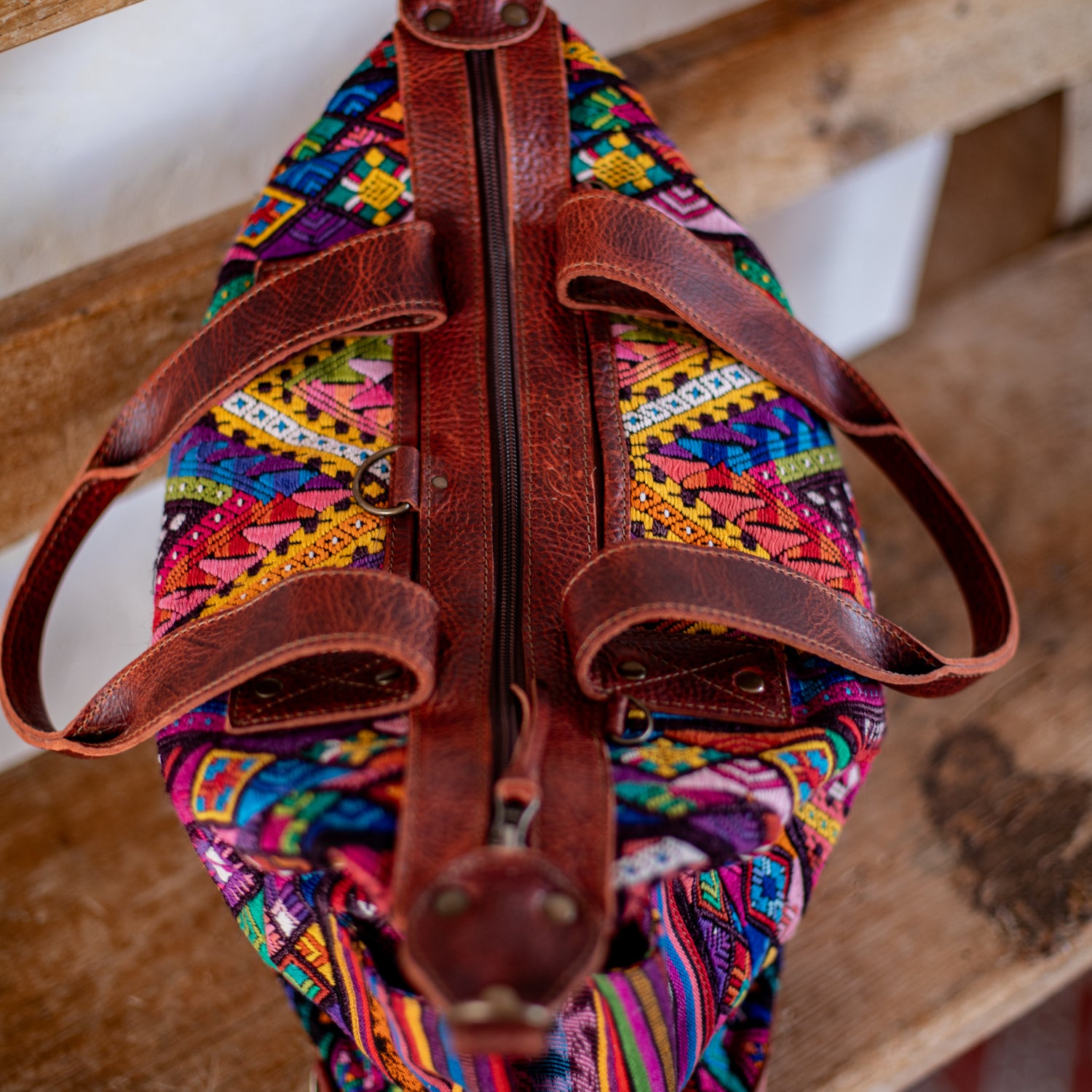 Many unique Maya symbols can be found in our One of a Kind Collection. The fabric we use for this collection is made from upcycled vintage huipiles (traditional attire worn by women in Guatemala) that were handwoven by Artisans up to 10 years ago, and they have lived a full life before being incorporated into your leather bag!