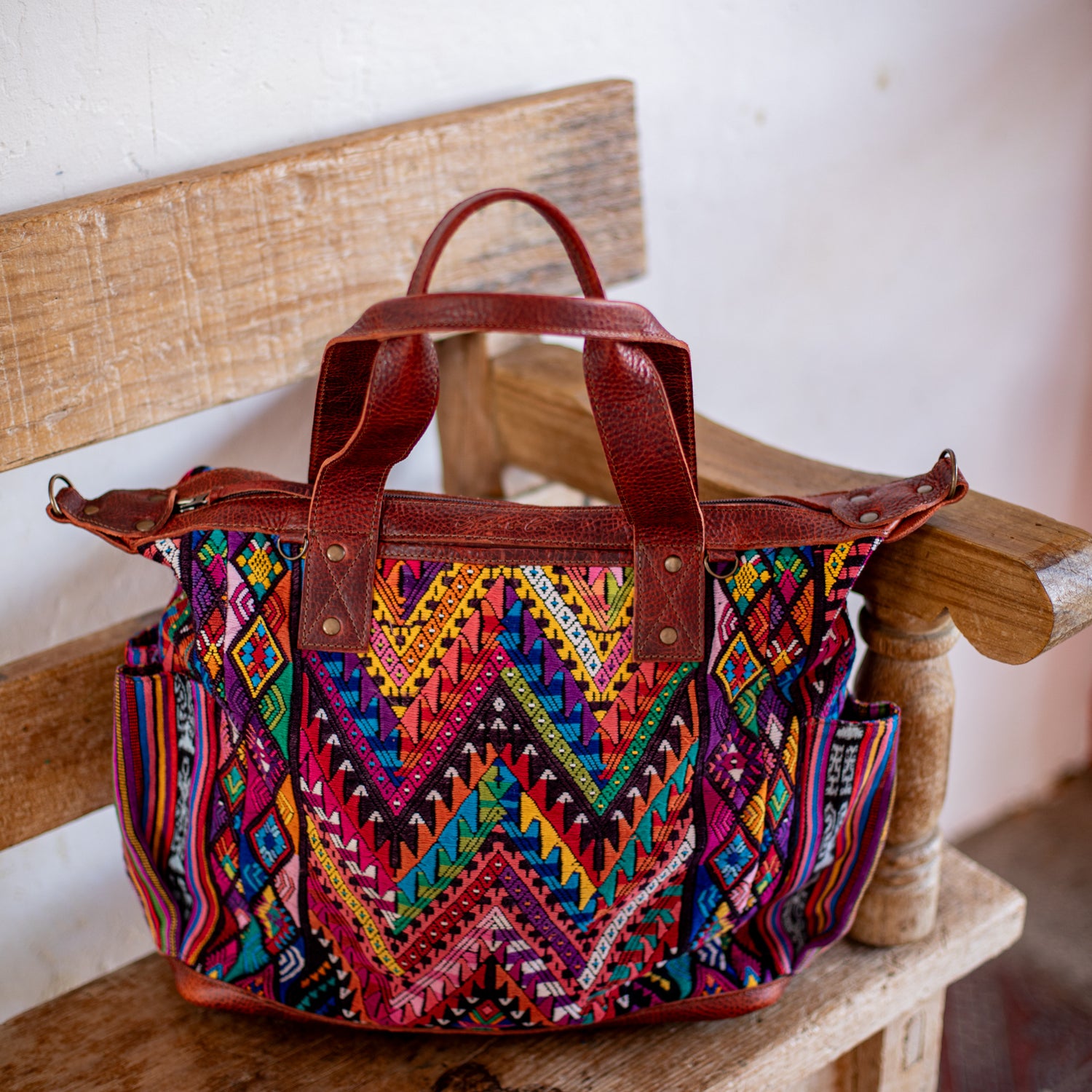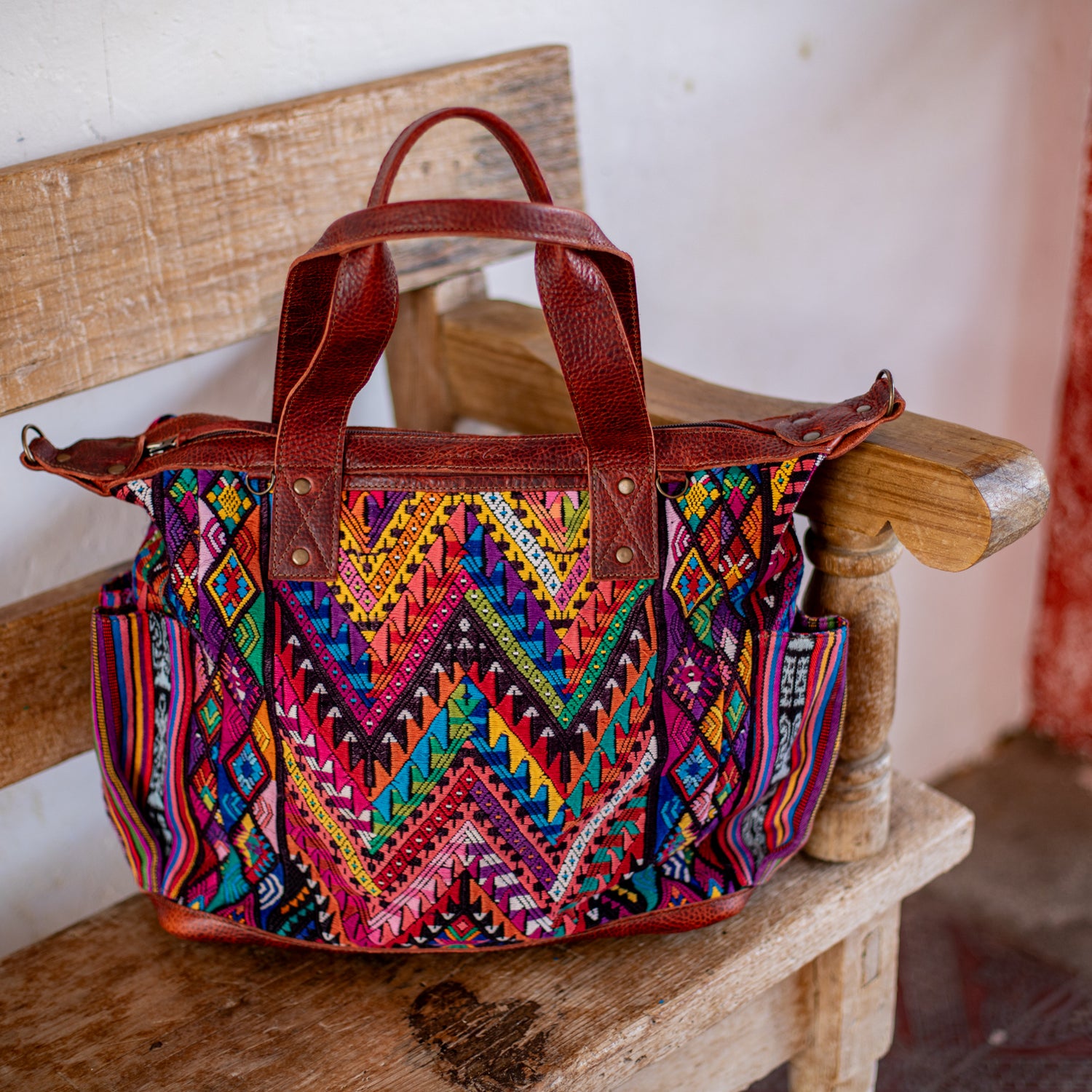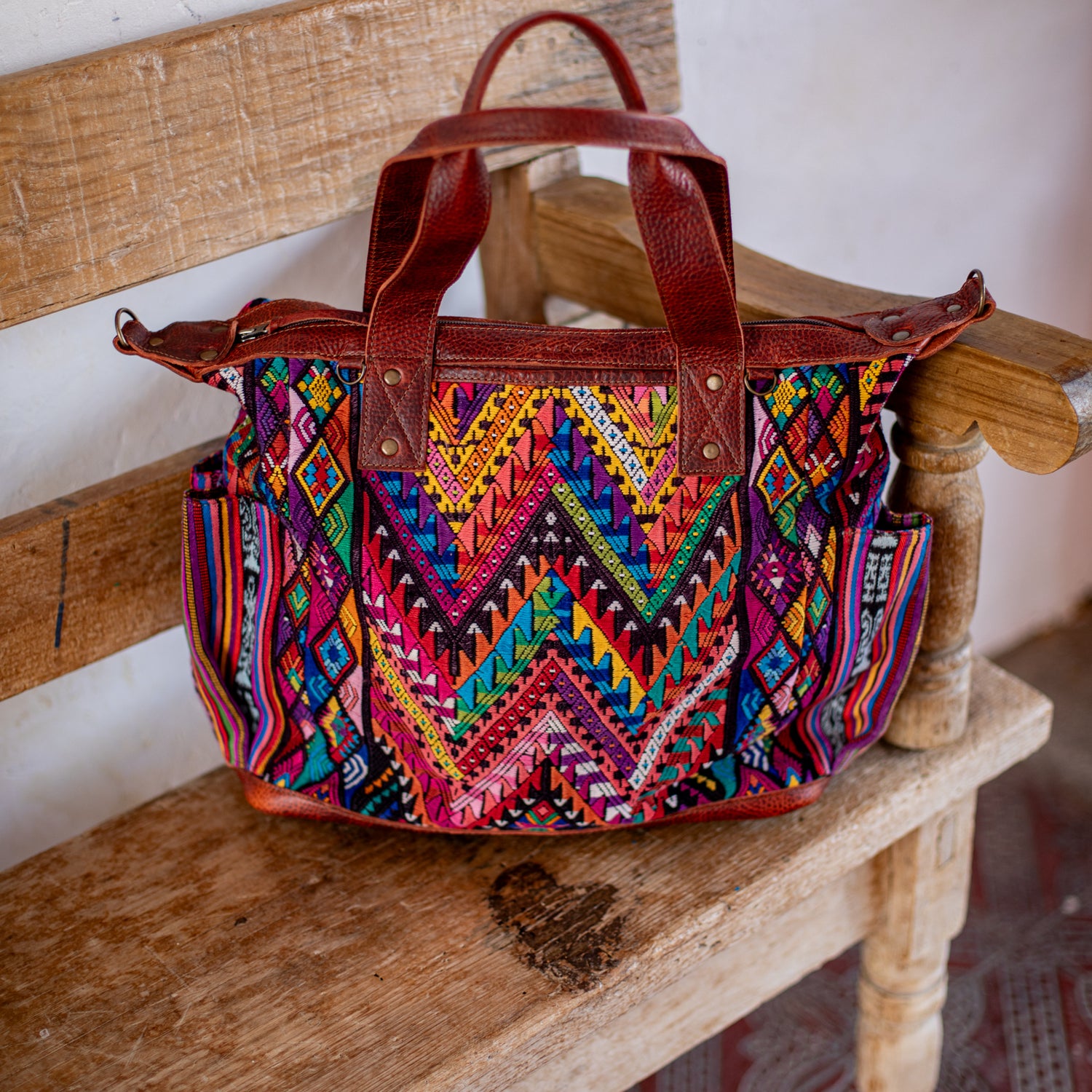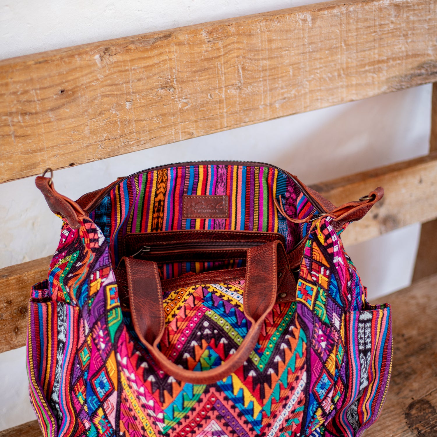 Many unique Maya symbols can be found in our One of a Kind Collection. The fabric we use for this collection is made from upcycled vintage huipiles (traditional attire worn by women in Guatemala) that were handwoven by Artisans up to 10 years ago, and they have lived a full life before being incorporated into your leather bag!