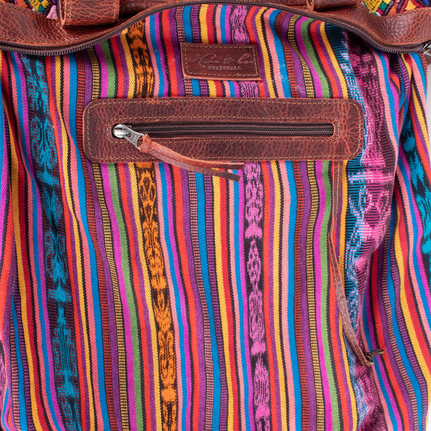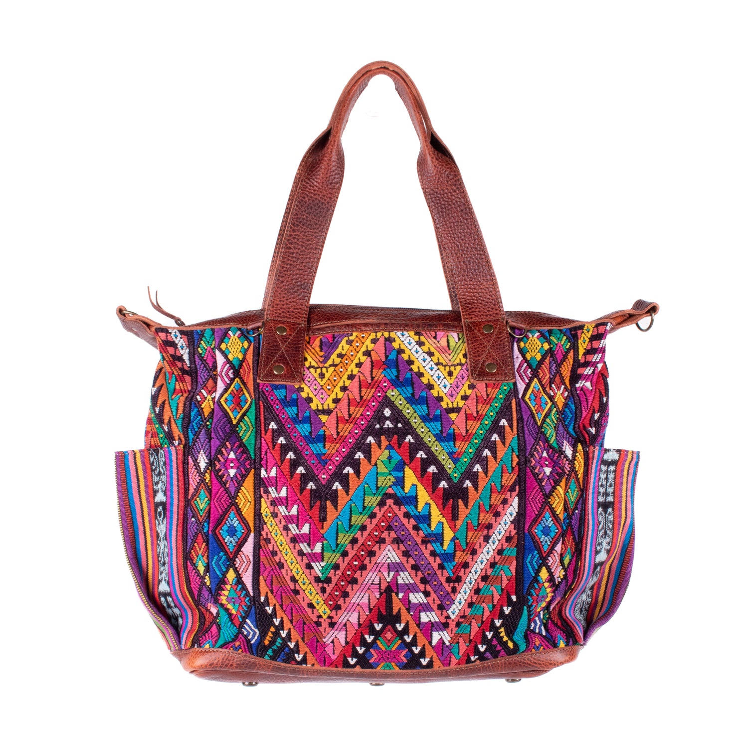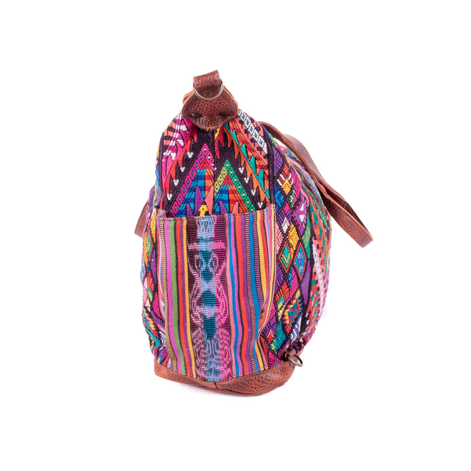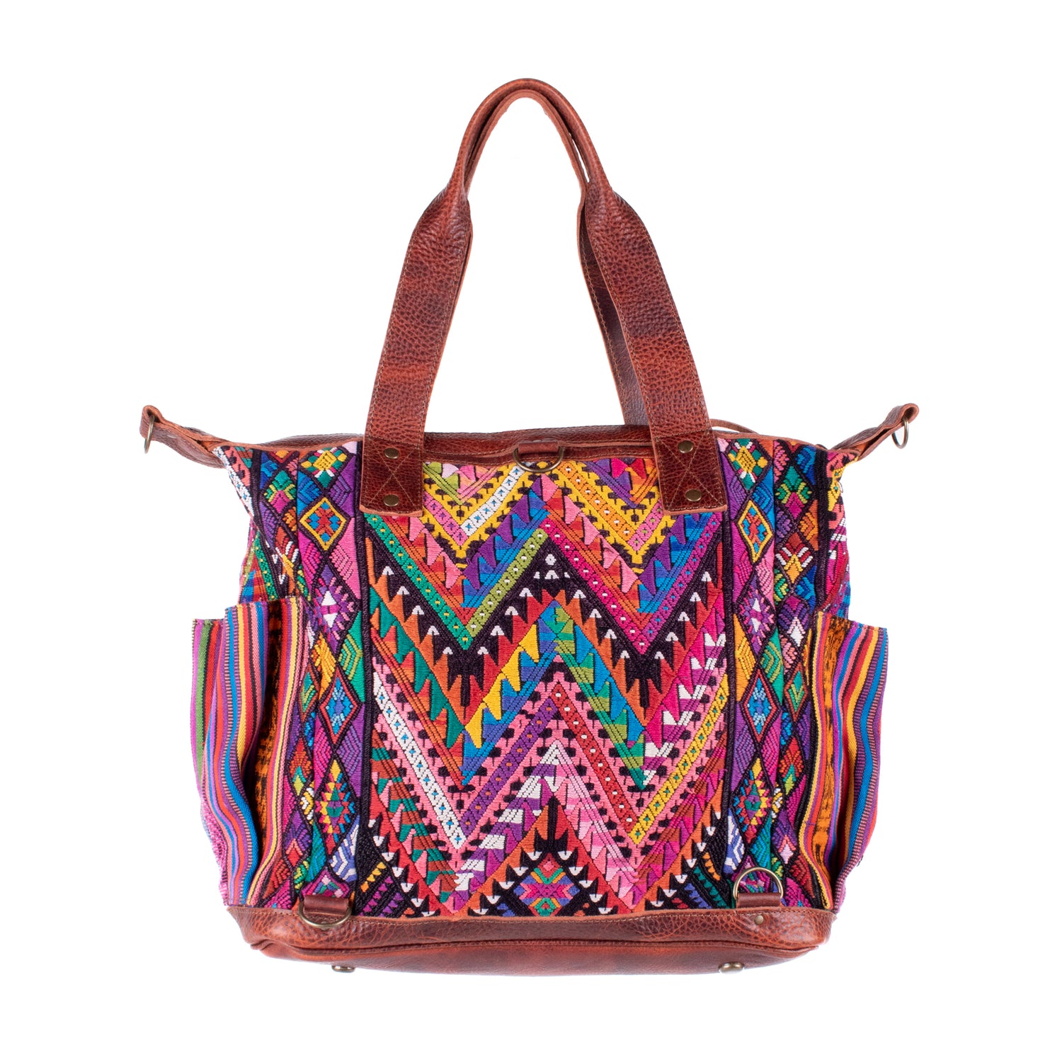 Many unique Maya symbols can be found in our One of a Kind Collection. The fabric we use for this collection is made from upcycled vintage huipiles (traditional attire worn by women in Guatemala) that were handwoven by Artisans up to 10 years ago, and they have lived a full life before being incorporated into your leather bag!