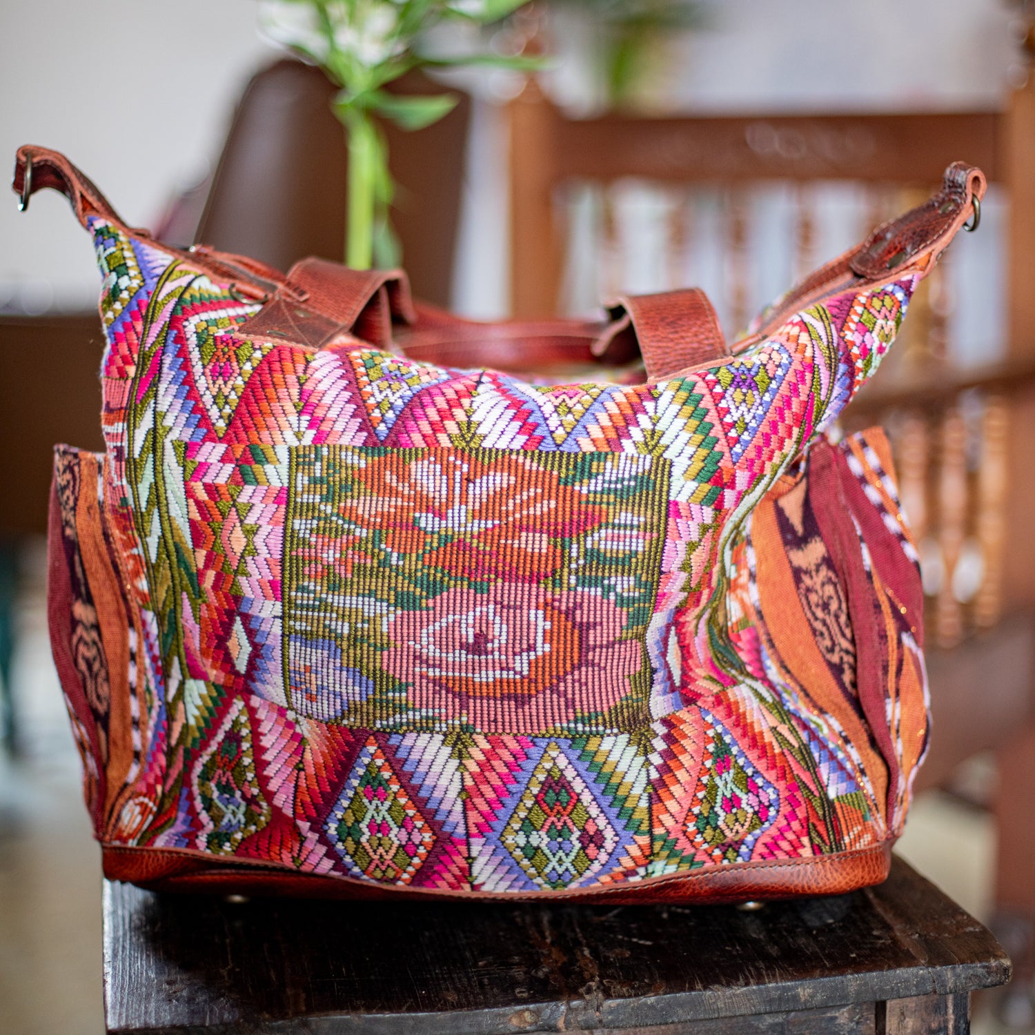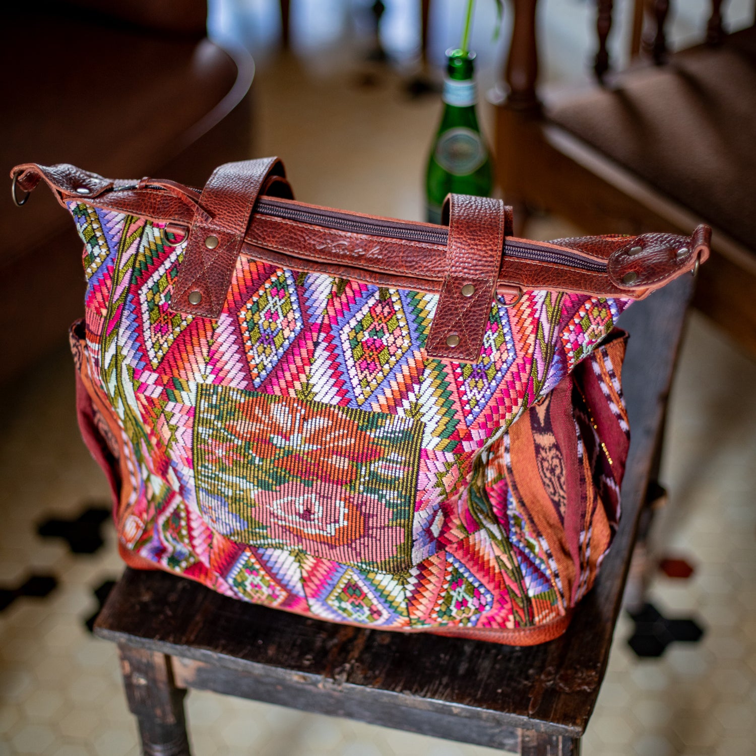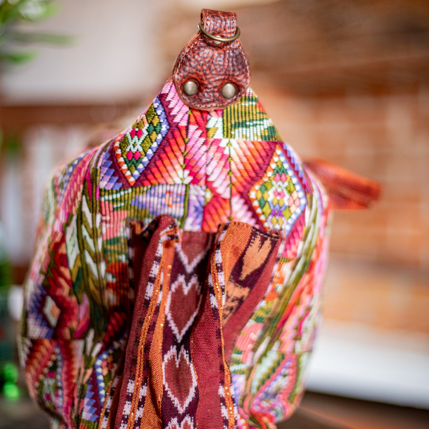 Many unique Maya symbols can be found in our One of a Kind Collection. The fabric we use for this collection is made from upcycled vintage huipiles (traditional attire worn by women in Guatemala) that were handwoven by Artisans up to 10 years ago, and they have lived a full life before being incorporated into your leather bag!