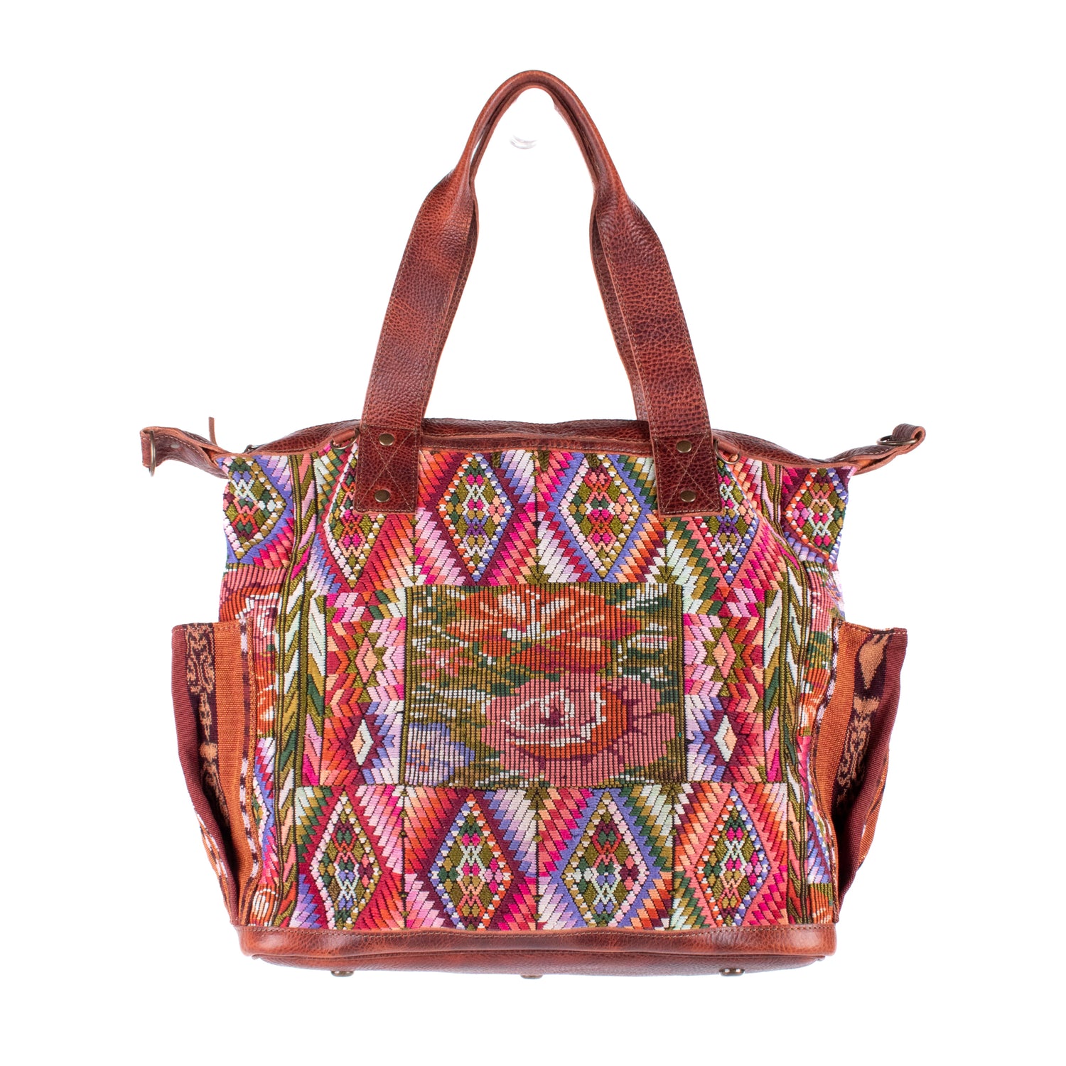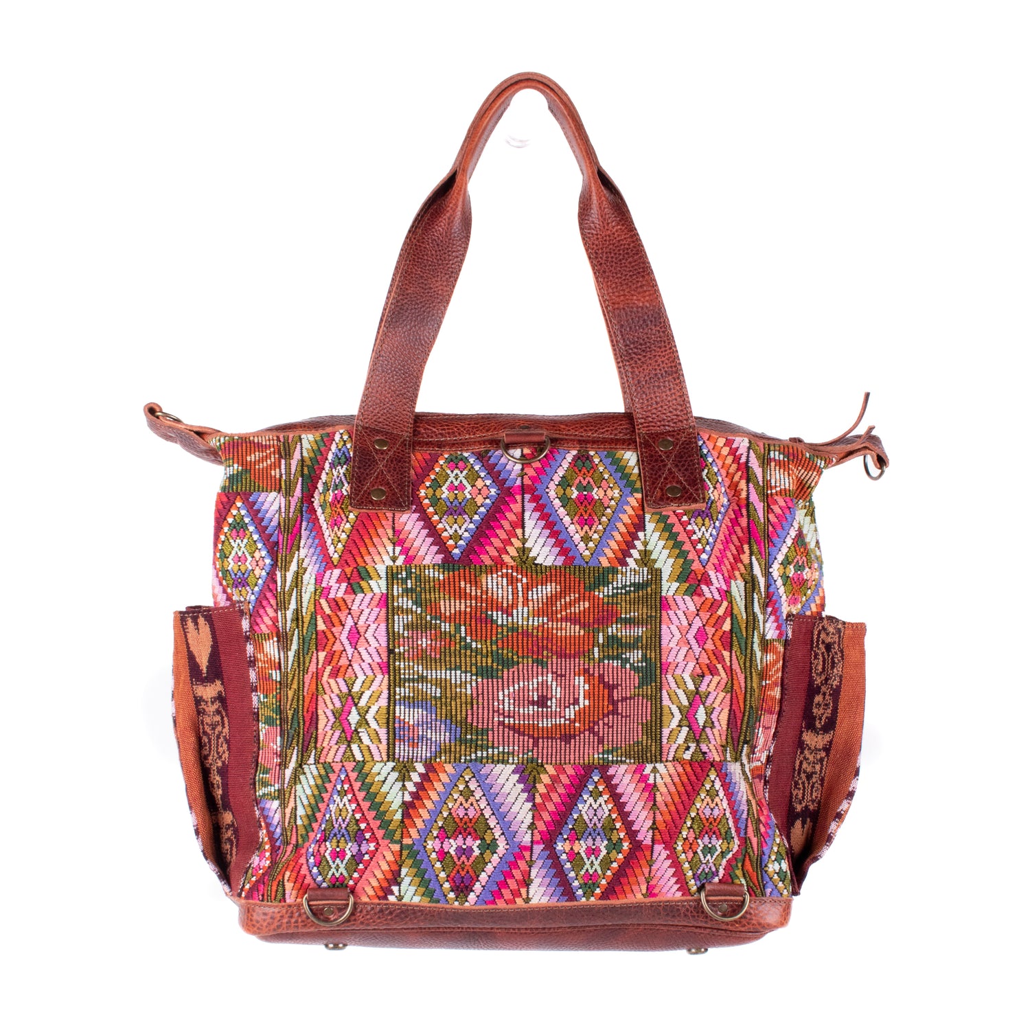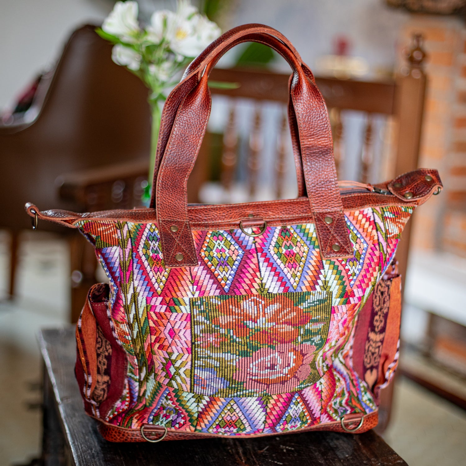 Many unique Maya symbols can be found in our One of a Kind Collection. The fabric we use for this collection is made from upcycled vintage huipiles (traditional attire worn by women in Guatemala) that were handwoven by Artisans up to 10 years ago, and they have lived a full life before being incorporated into your leather bag!