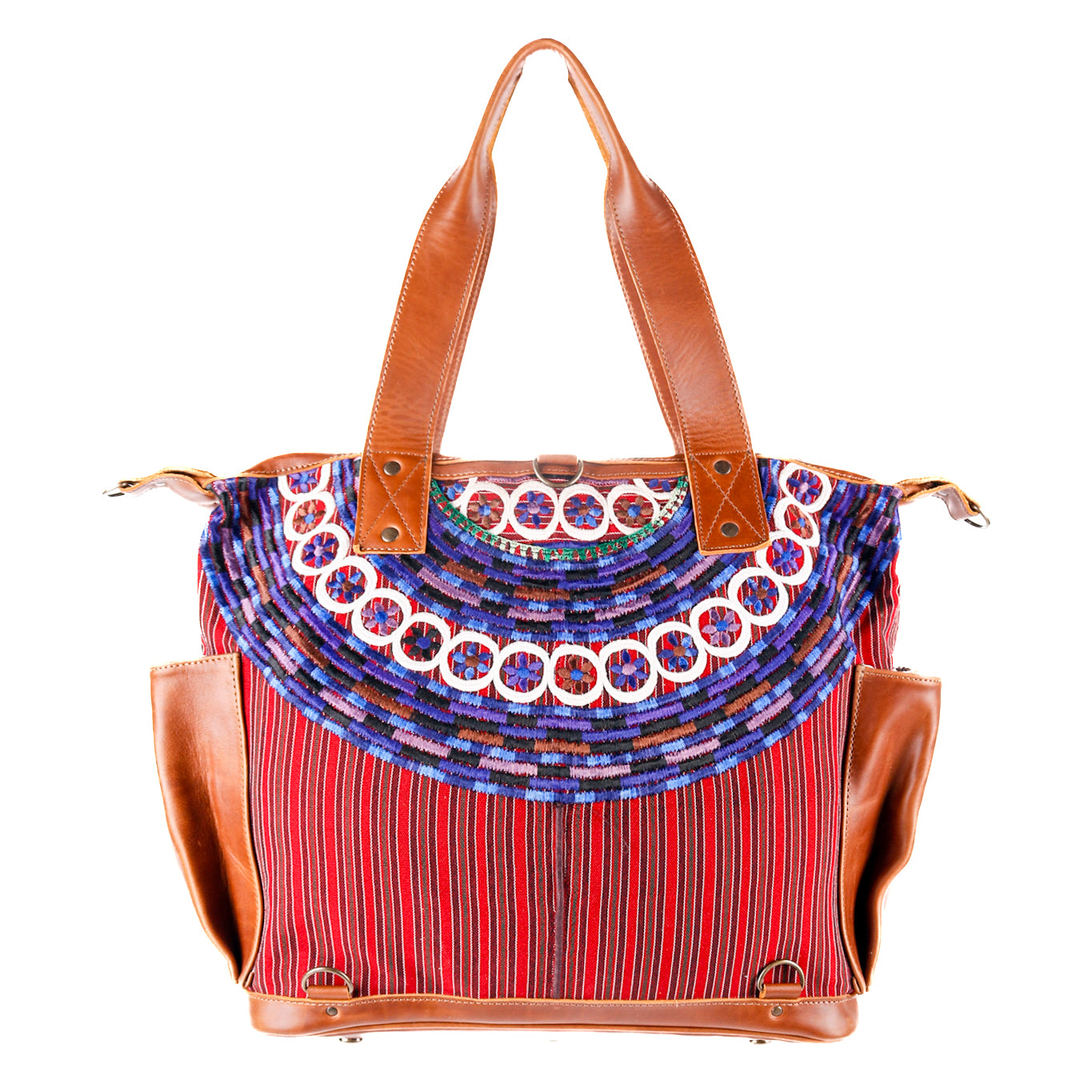 Many unique Maya symbols can be found in our One of a Kind Collection. The fabric we use for this collection is made from upcycled vintage huipiles (traditional attire worn by women in Guatemala) that were handwoven by Artisans up to 10 years ago, and they have lived a full life before being incorporated into your leather bag!