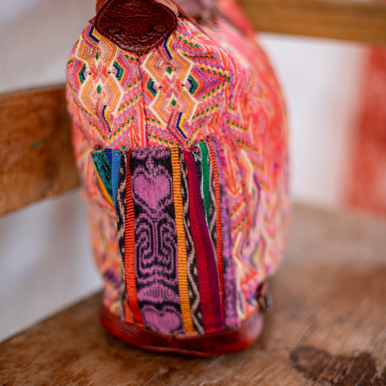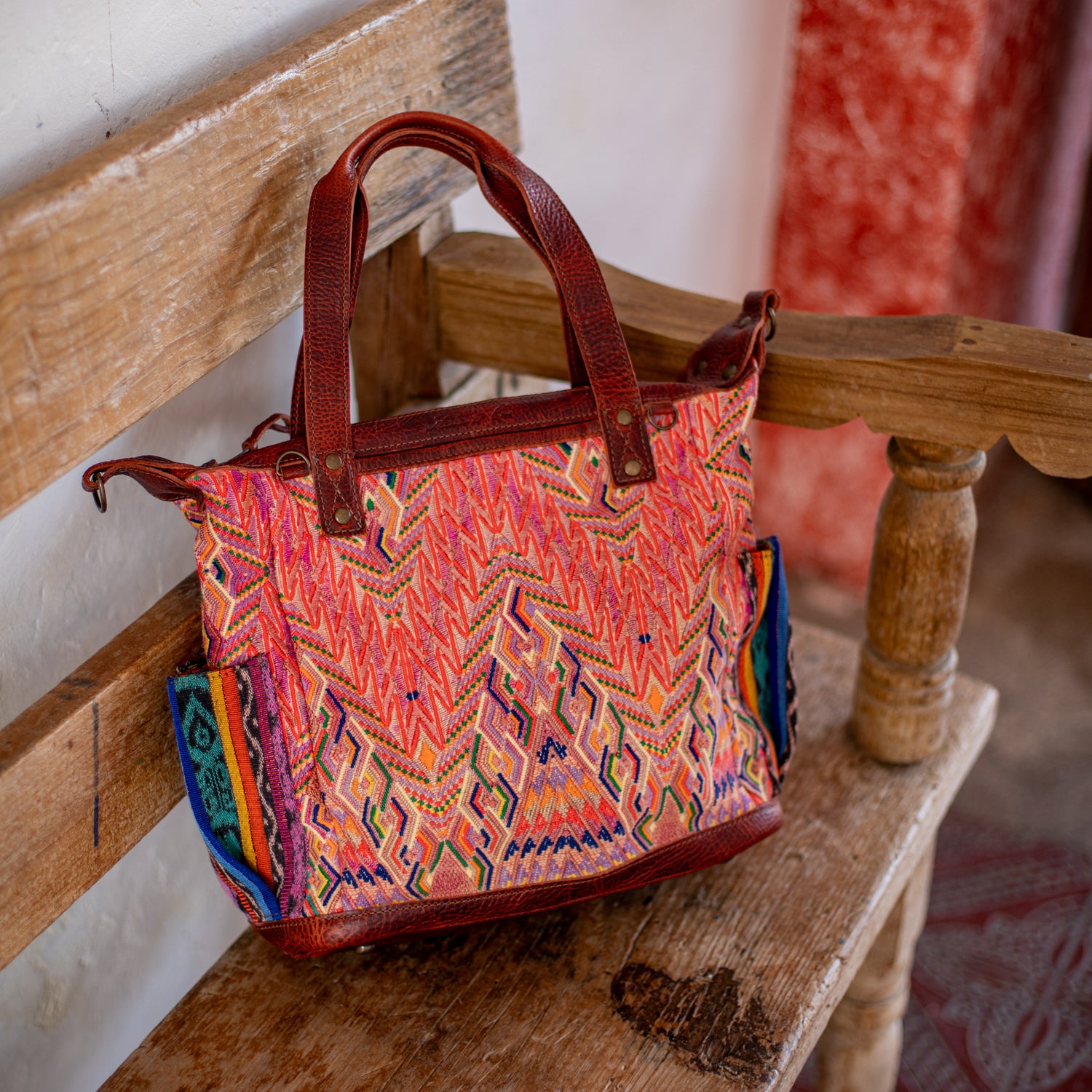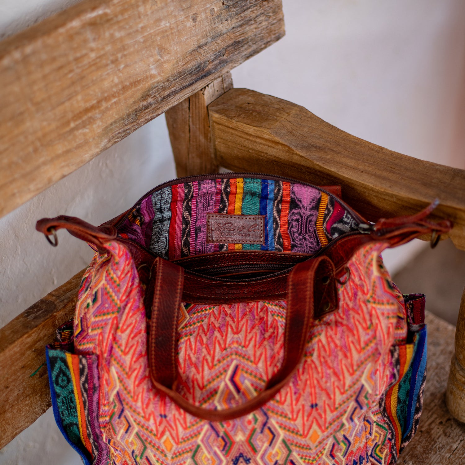 Many unique Maya symbols can be found in our One of a Kind Collection. The fabric we use for this collection is made from upcycled vintage huipiles (traditional attire worn by women in Guatemala) that were handwoven by Artisans up to 10 years ago, and they have lived a full life before being incorporated into your leather bag!