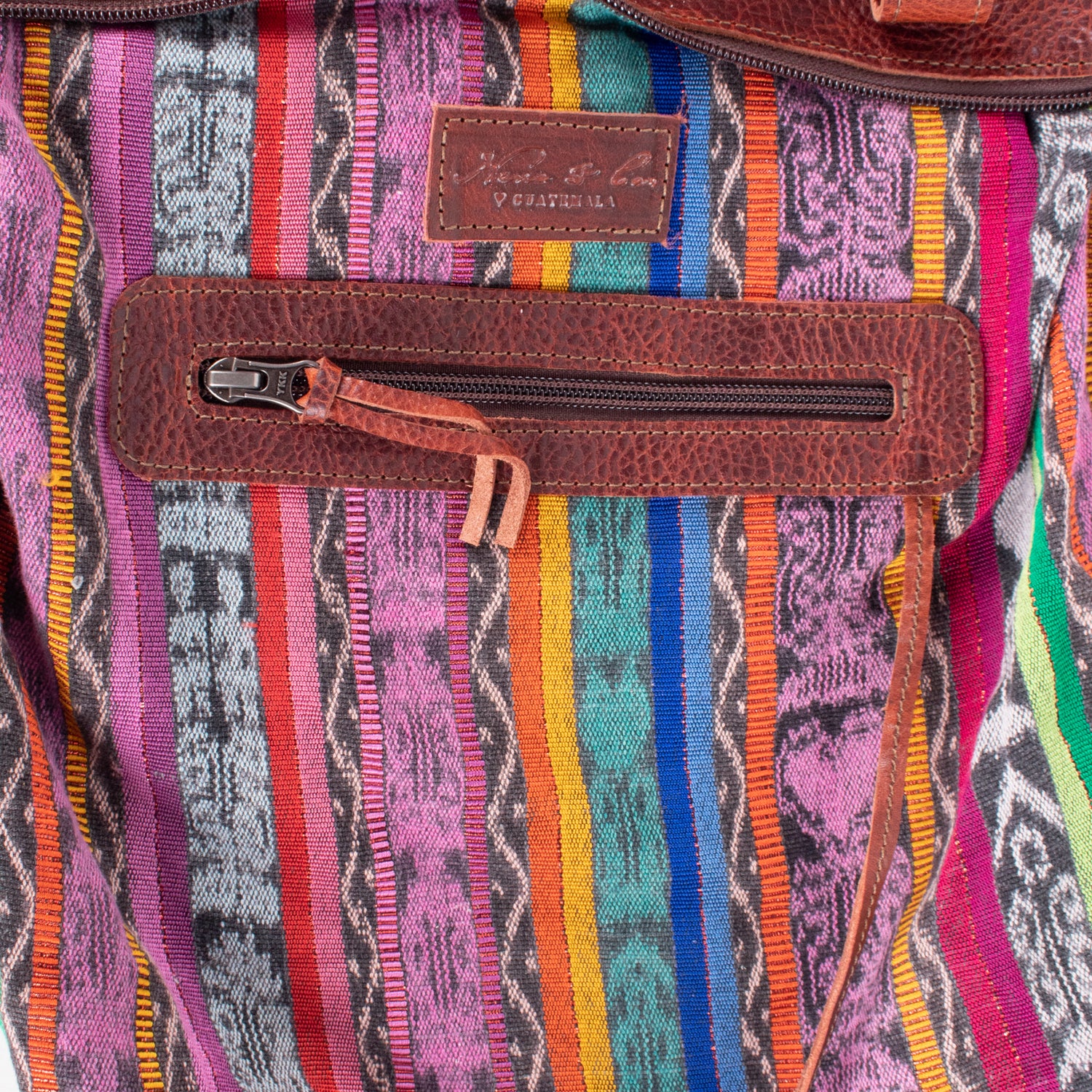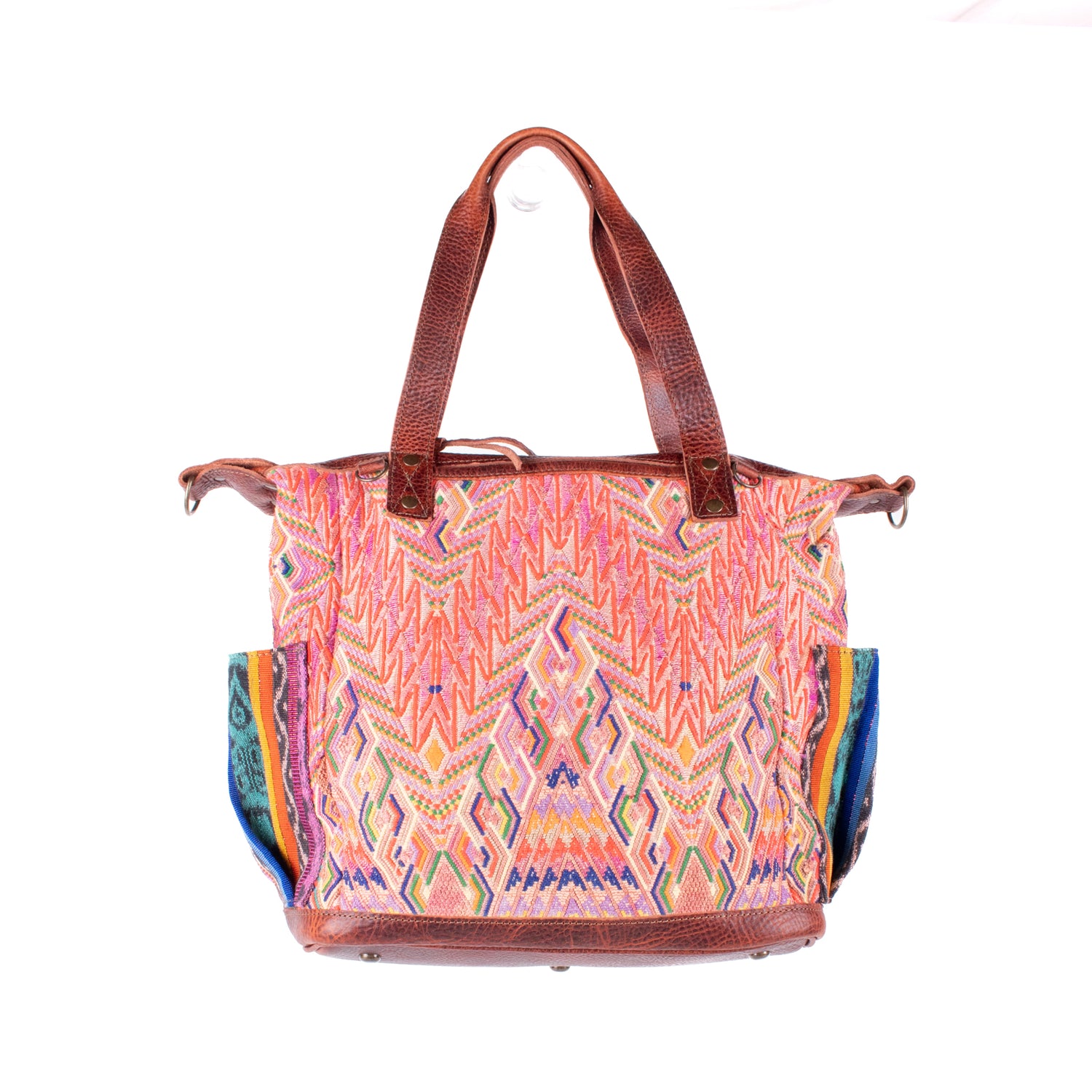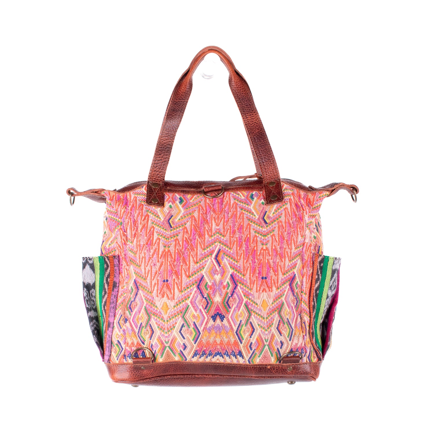Many unique Maya symbols can be found in our One of a Kind Collection. The fabric we use for this collection is made from upcycled vintage huipiles (traditional attire worn by women in Guatemala) that were handwoven by Artisans up to 10 years ago, and they have lived a full life before being incorporated into your leather bag!