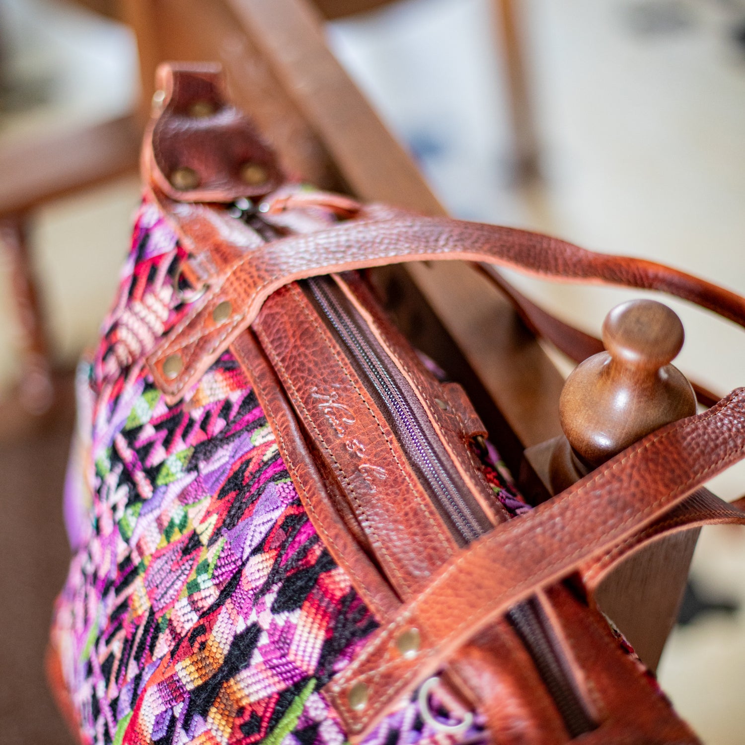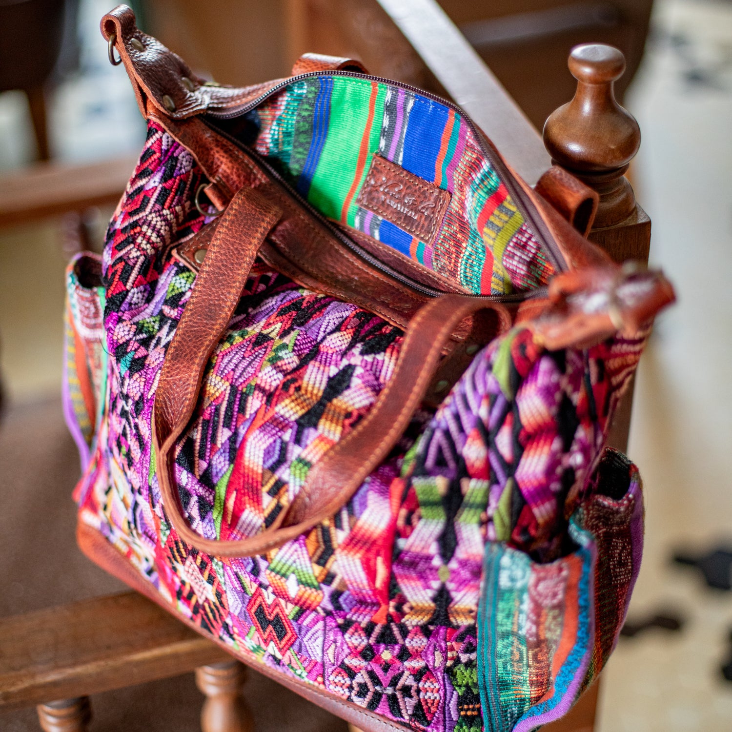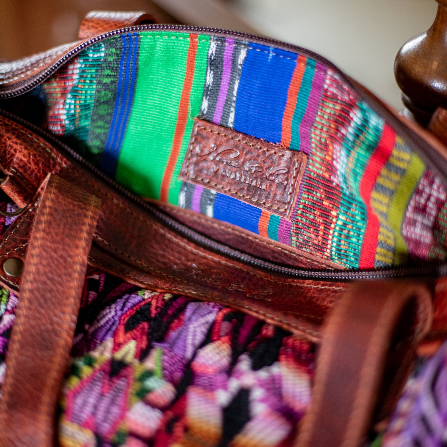 We make every effort to provide our customers with the best-handcrafted and high-quality bags. Please note that all our processes to make the bags are done by hand, from curing, cutting, and treating the leather to using up-cycled huipils. Our bags have natural characteristics and qualities that should not be considered as flaws or as damage because they do not interfere with the functionality of the bag. We up-cycle vintage Maya clothing to make beautiful one-of-a-kind products. Many times you will find snags in the pattern. This is normal. Should your patterned huipil snag you can snip the loose threads with scissors. Do not pull them.