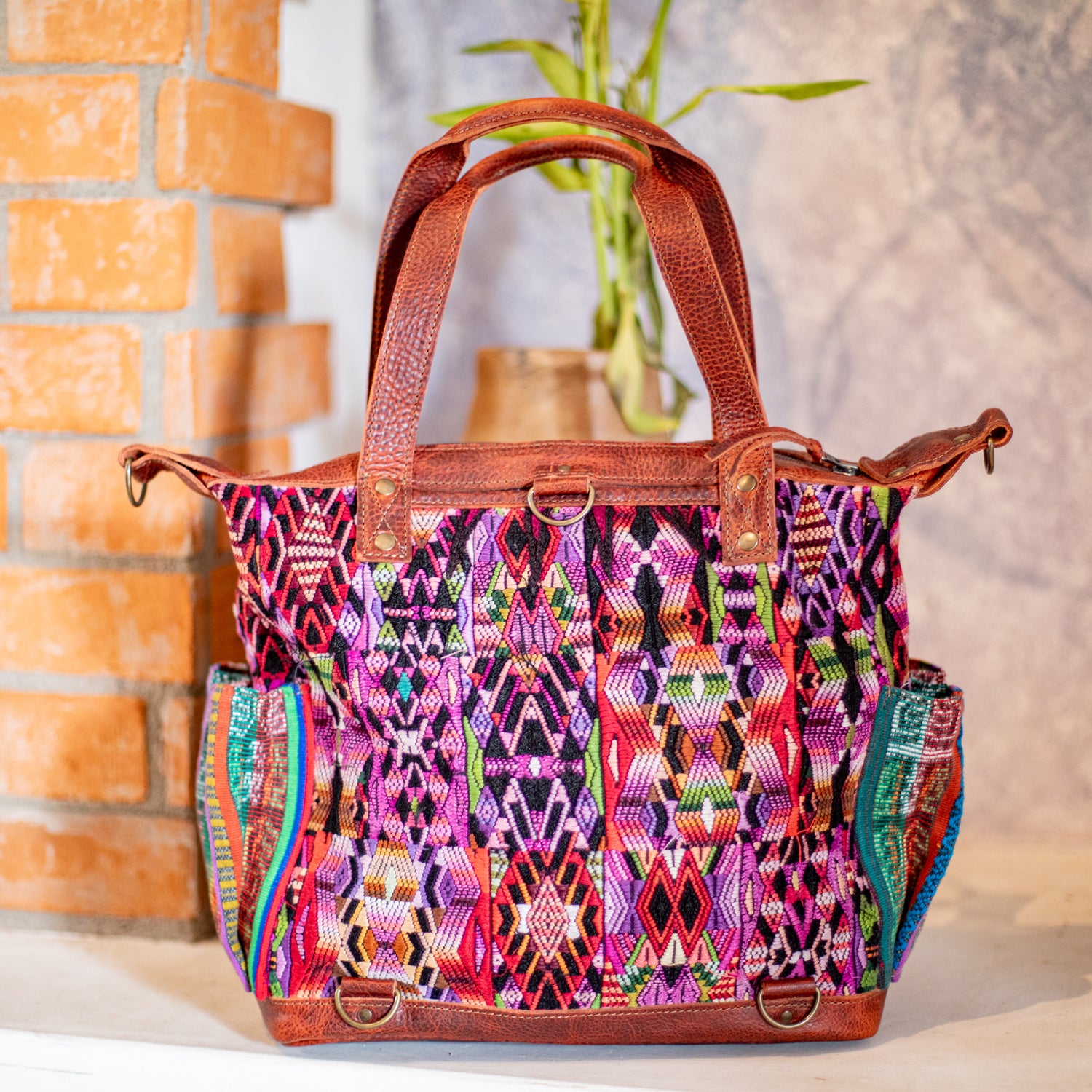 Many unique Maya symbols can be found in our One of a Kind Collection. The fabric we use for this collection is made from upcycled vintage huipiles (traditional attire worn by women in Guatemala) that were handwoven by Artisans up to 10 years ago, and they have lived a full life before being incorporated into your leather bag!