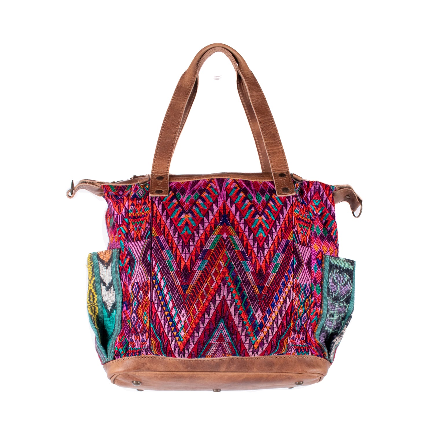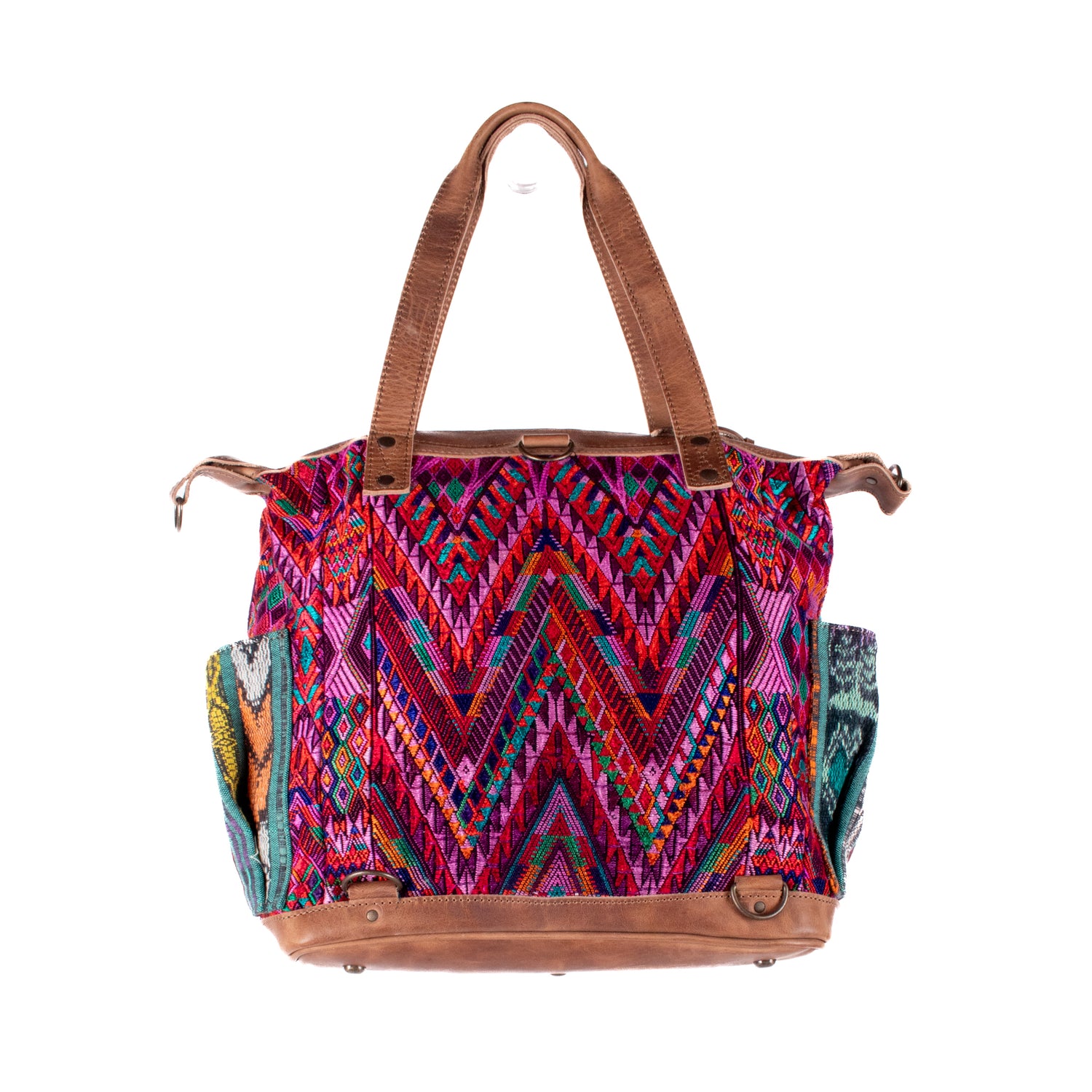 Many unique Maya symbols can be found in our One of a Kind Collection. The fabric we use for this collection is made from upcycled vintage huipiles (traditional attire worn by women in Guatemala) that were handwoven by Artisans up to 10 years ago, and they have lived a full life before being incorporated into your leather bag!