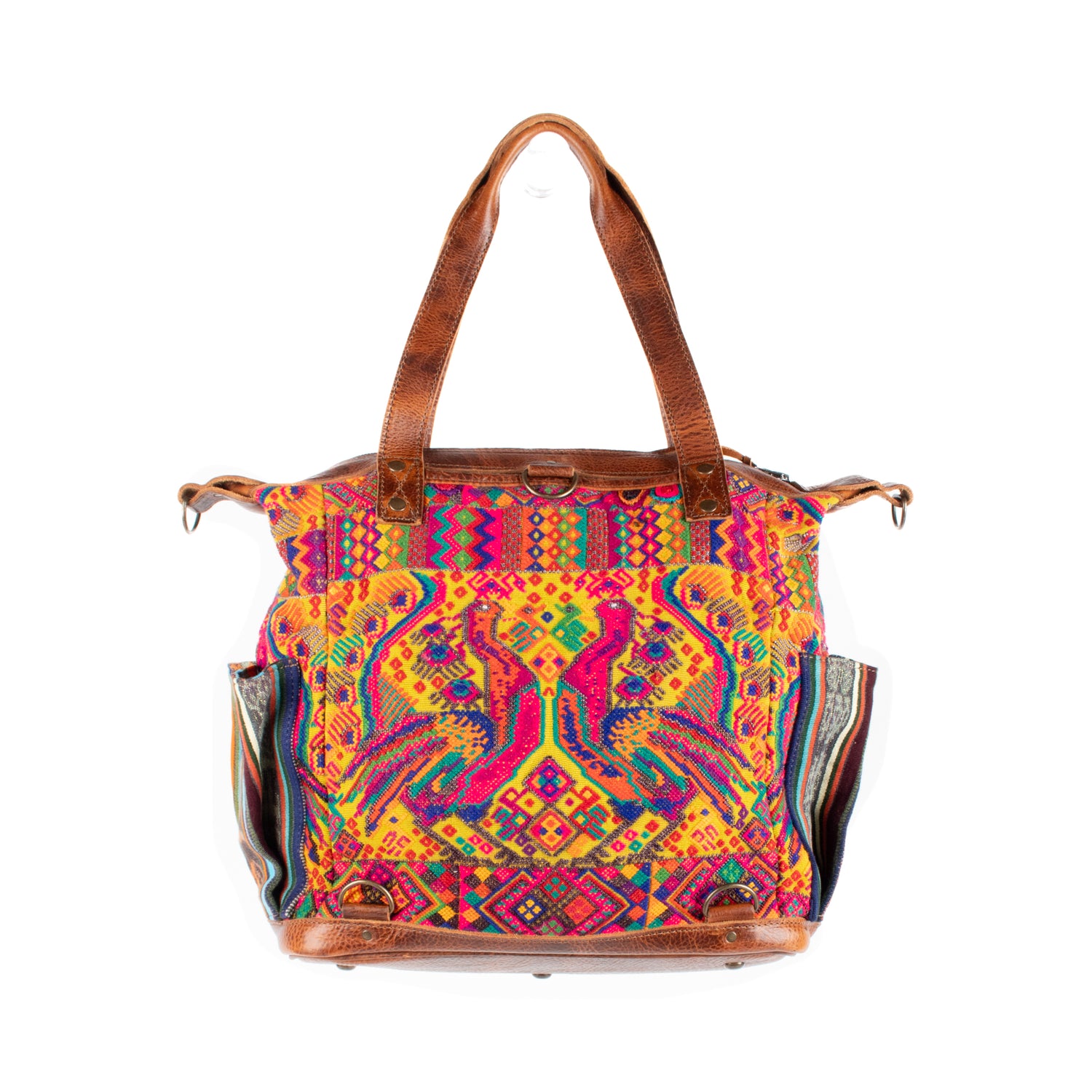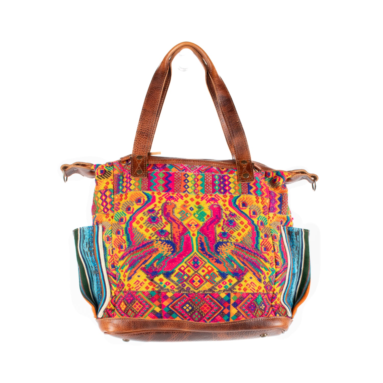 Many unique Maya symbols can be found in our One of a Kind Collection. The fabric we use for this collection is made from upcycled vintage huipiles (traditional attire worn by women in Guatemala) that were handwoven by Artisans up to 10 years ago, and they have lived a full life before being incorporated into your leather bag!