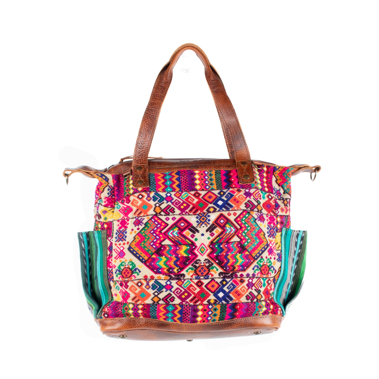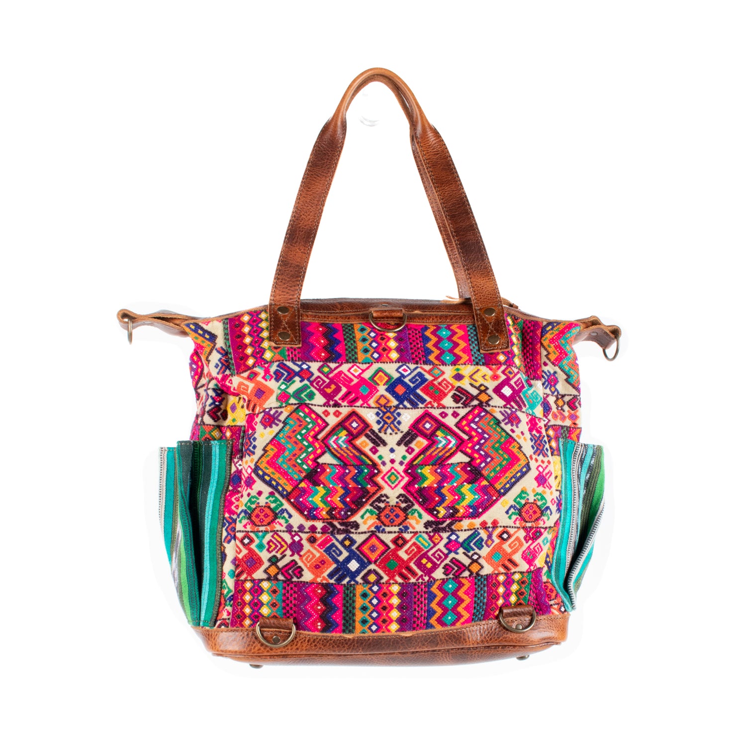 Many unique Maya symbols can be found in our One of a Kind Collection. The fabric we use for this collection is made from upcycled vintage huipiles (traditional attire worn by women in Guatemala) that were handwoven by Artisans up to 10 years ago, and they have lived a full life before being incorporated into your leather bag!