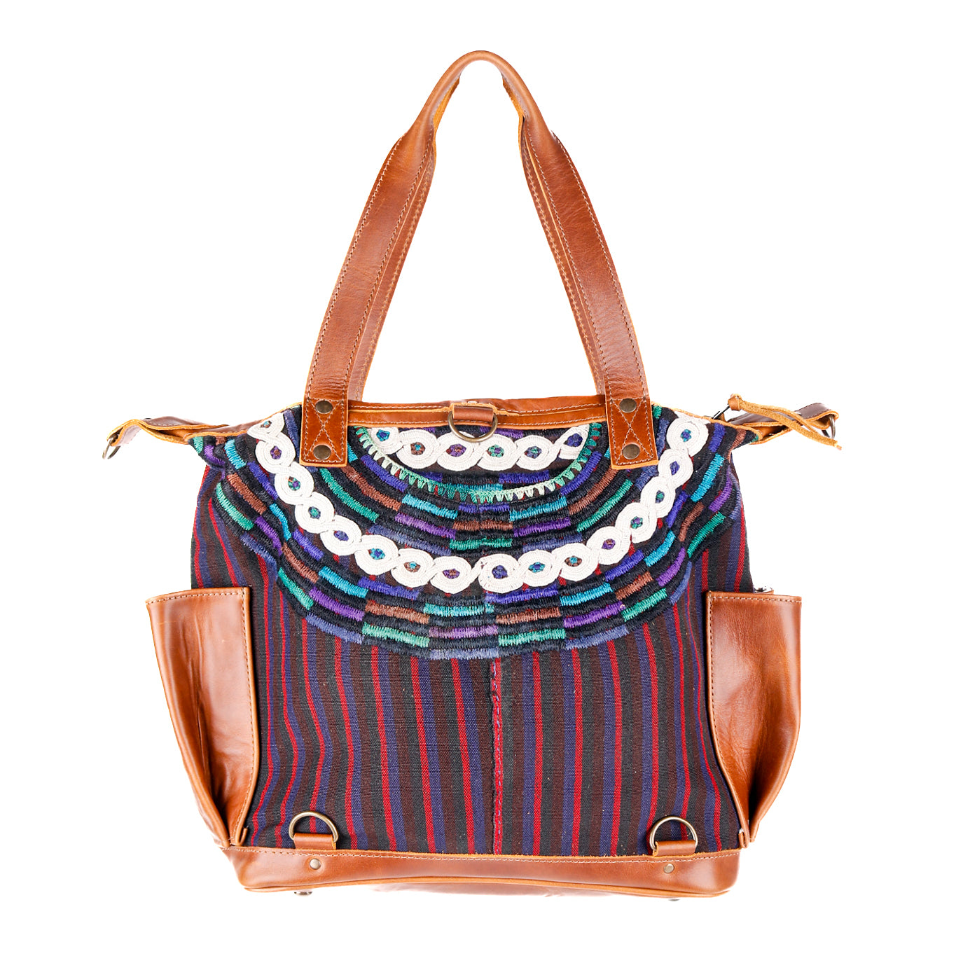 Many unique Maya symbols can be found in our One of a Kind Collection. The fabric we use for this collection is made from upcycled vintage huipiles (traditional attire worn by women in Guatemala) that were handwoven by Artisans up to 10 years ago, and they have lived a full life before being incorporated into your leather bag!