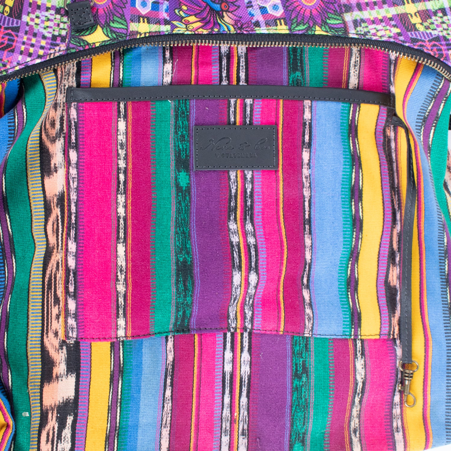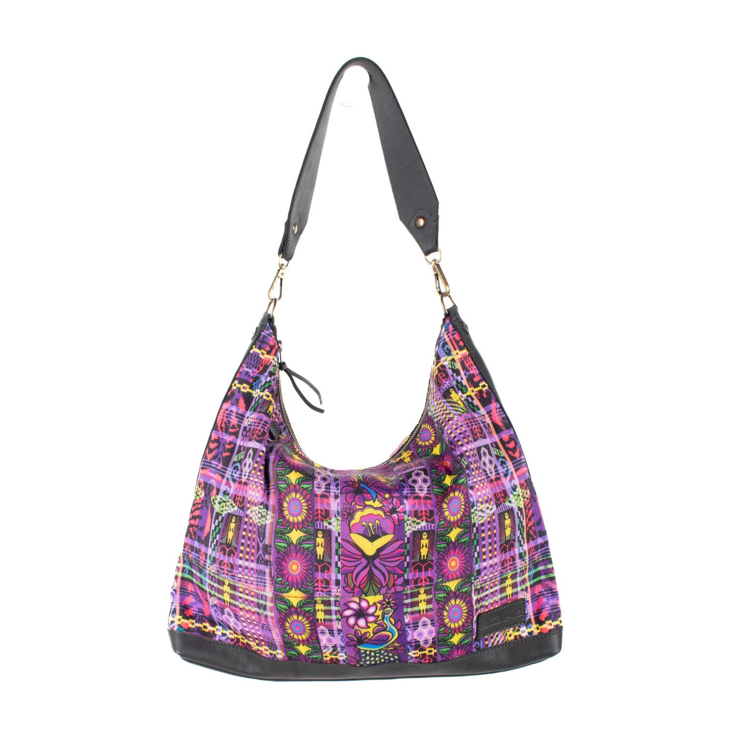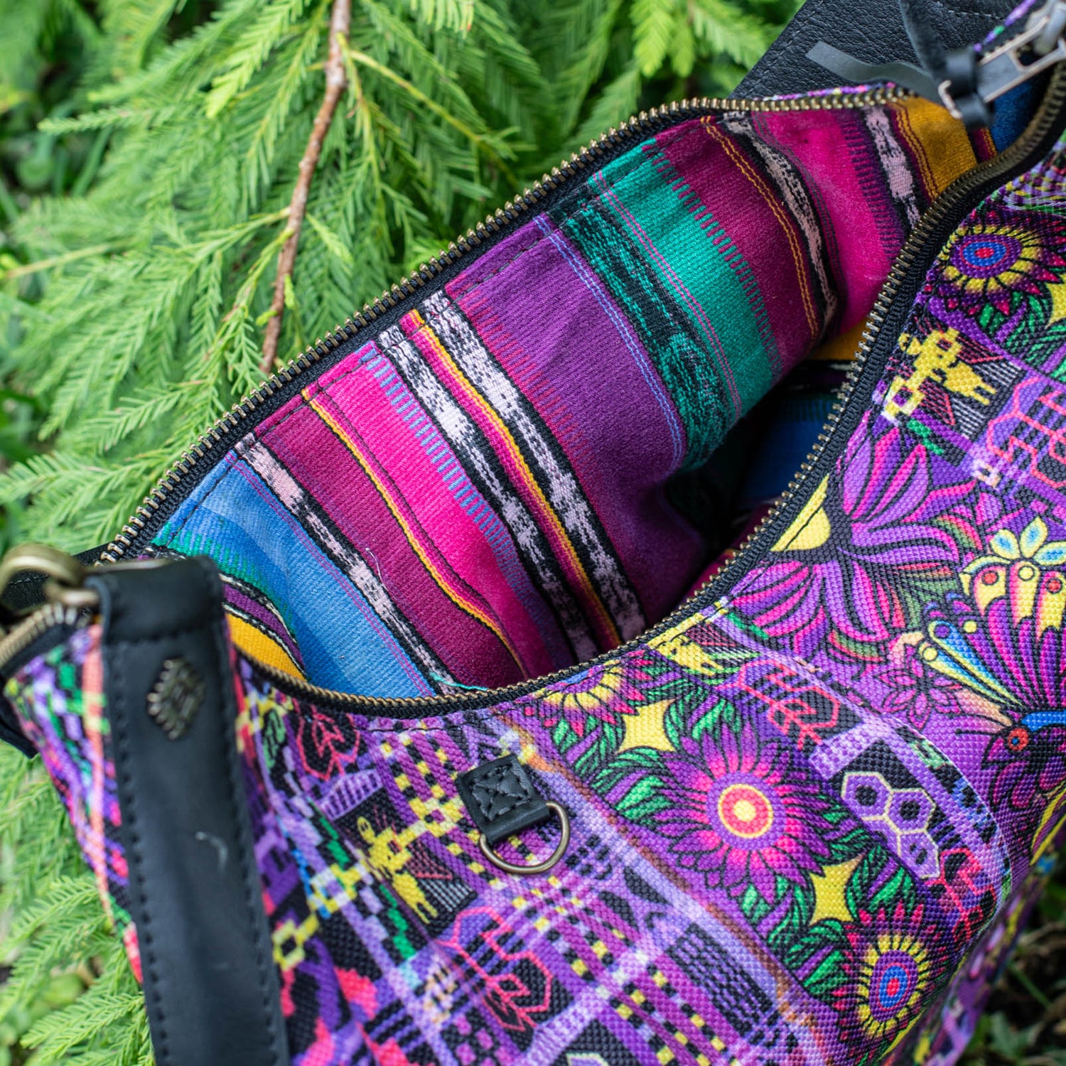 Many unique Maya symbols can be found in our One of a Kind Collection. The fabric we use for this collection is made from upcycled vintage huipiles (traditional attire worn by women in Guatemala) that were handwoven by Artisans up to 10 years ago, and they have lived a full life before being incorporated into your leather bag!