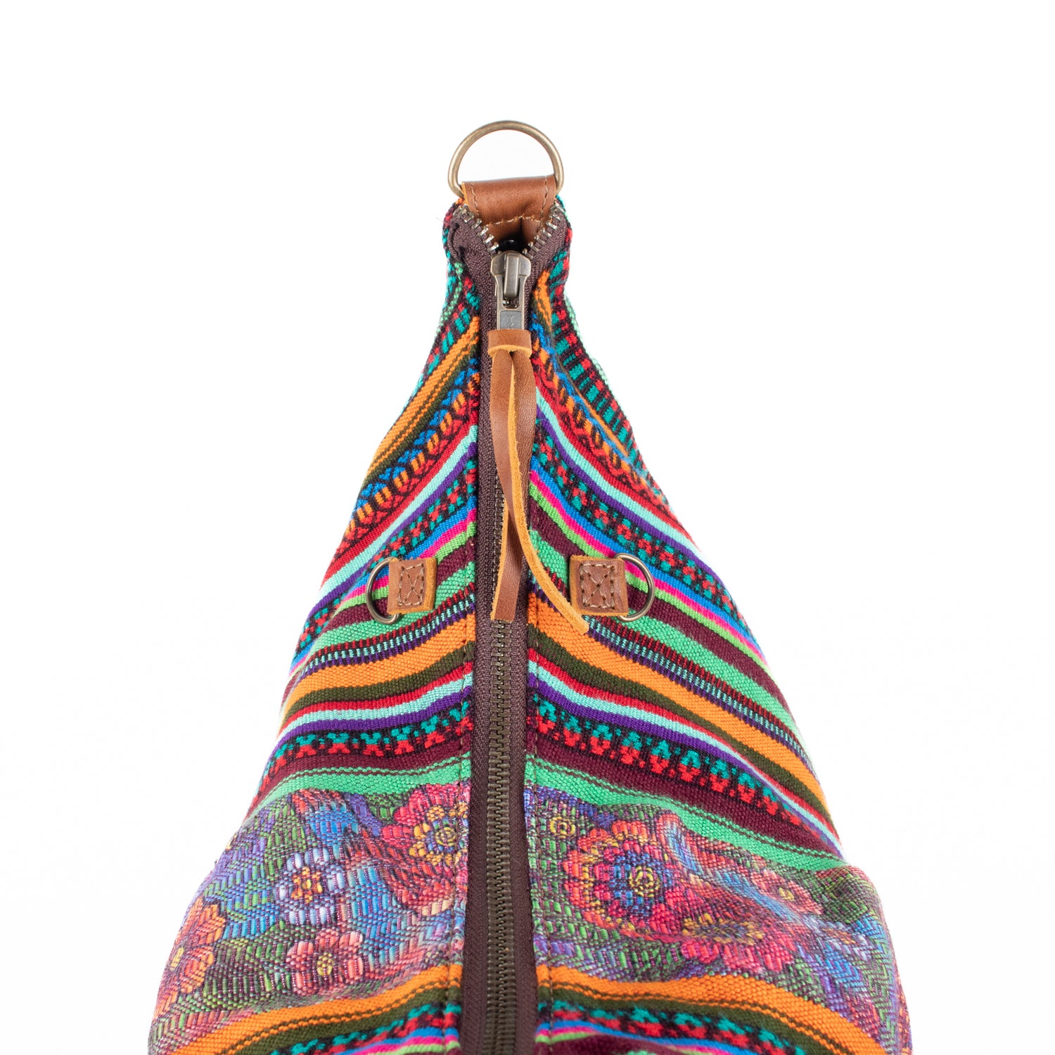 Many unique Maya symbols can be found in our One of a Kind Collection. The fabric we use for this collection is made from upcycled vintage huipiles (traditional attire worn by women in Guatemala) that were handwoven by Artisans up to 10 years ago, and they have lived a full life before being incorporated into your leather bag!