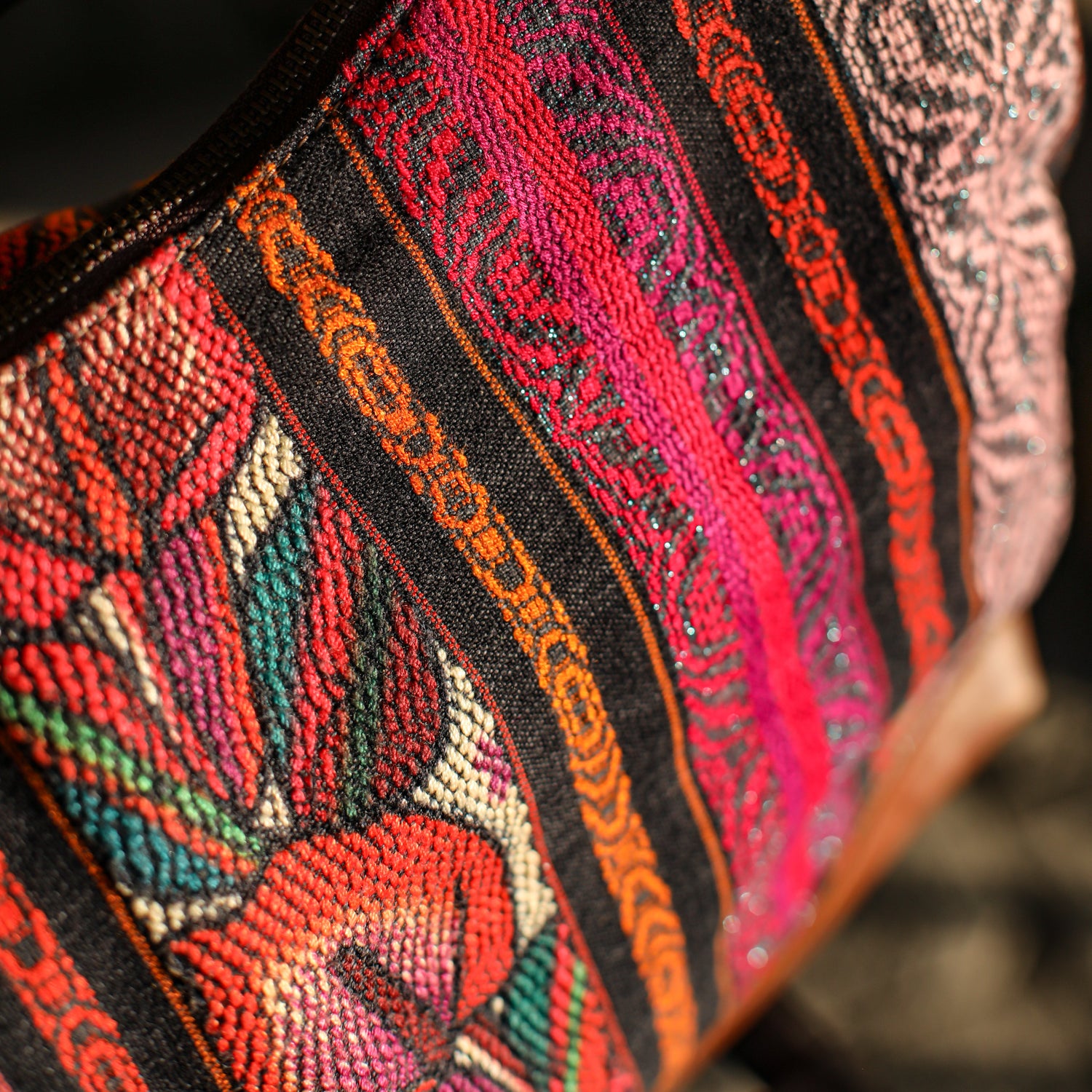 Many unique Maya symbols can be found in our One of a Kind Collection. The fabric we use for this collection is made from upcycled vintage huipiles (traditional attire worn by women in Guatemala) that were handwoven by Artisans up to 10 years ago, and they have lived a full life before being incorporated into your leather bag!