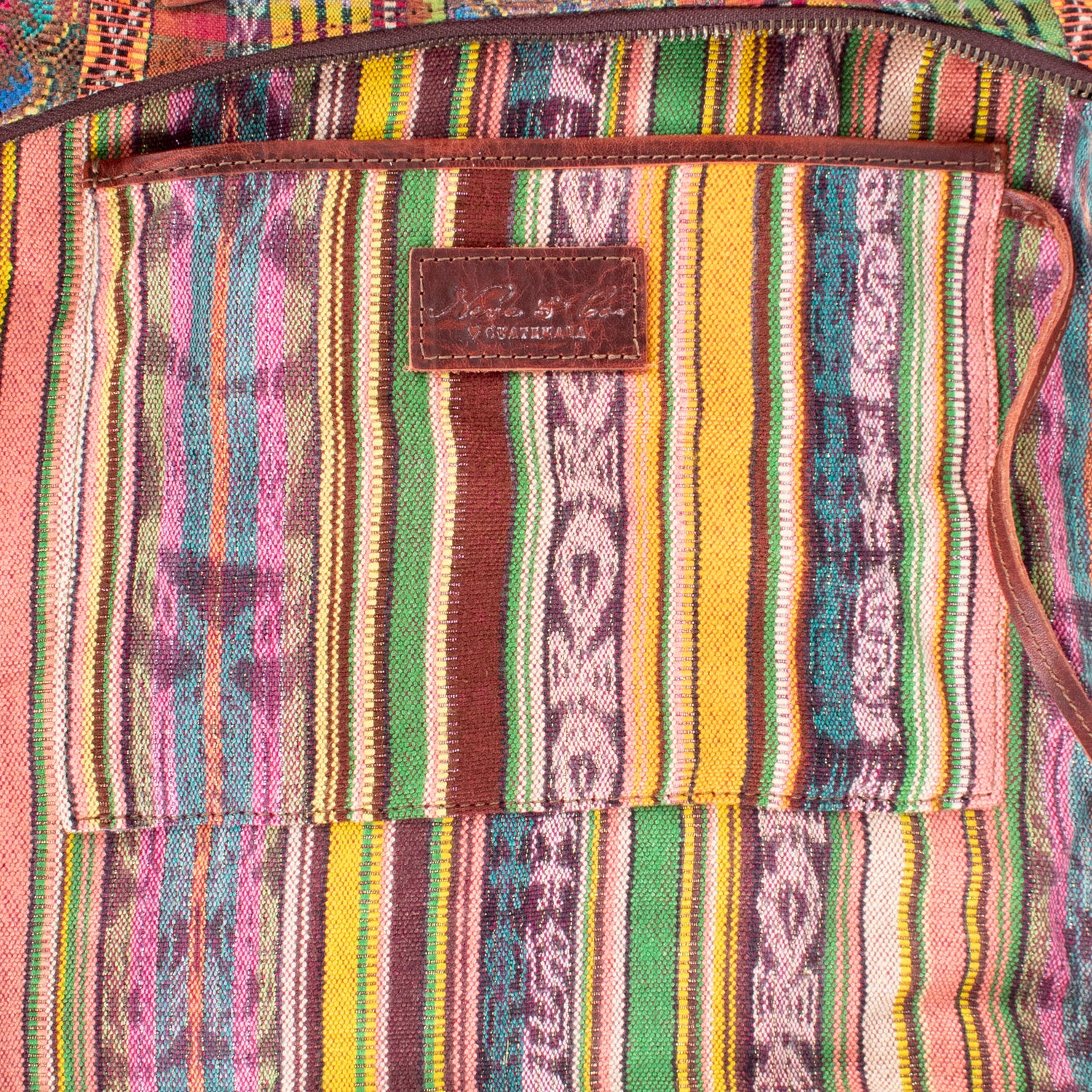 Many unique Maya symbols can be found in our One of a Kind Collection. The fabric we use for this collection is made from upcycled vintage huipiles (traditional attire worn by women in Guatemala) that were handwoven by Artisans up to 10 years ago, and they have lived a full life before being incorporated into your leather bag!