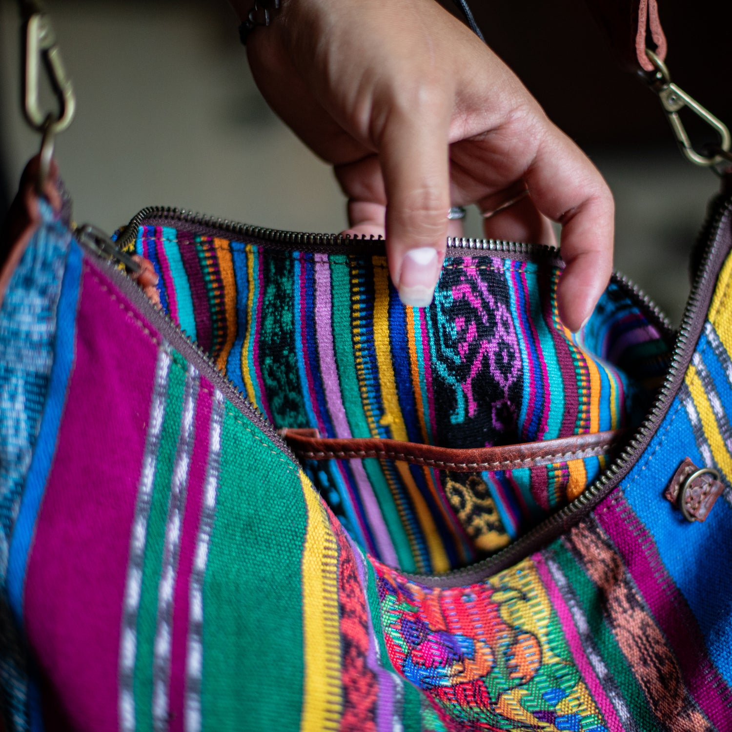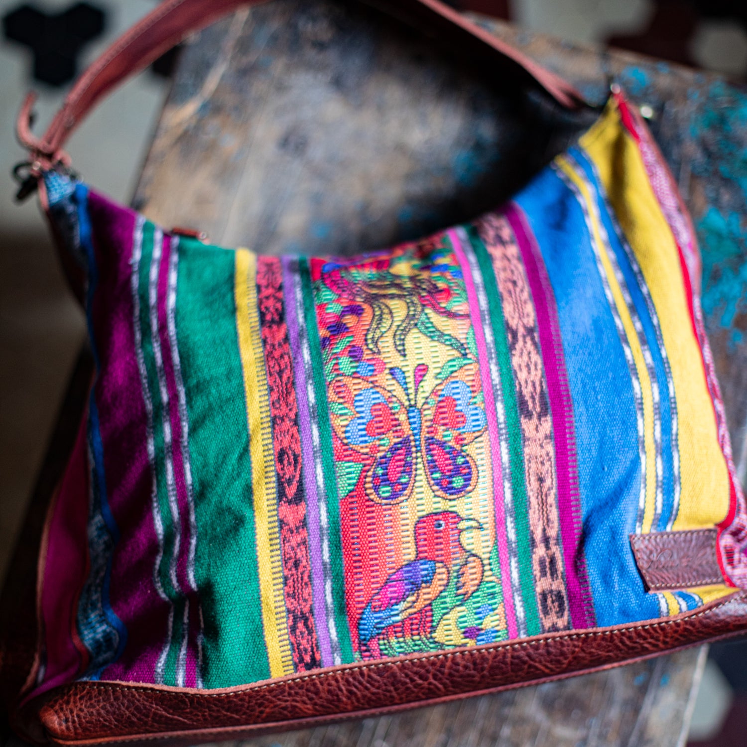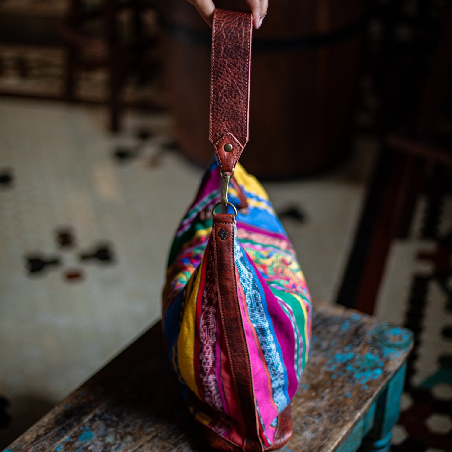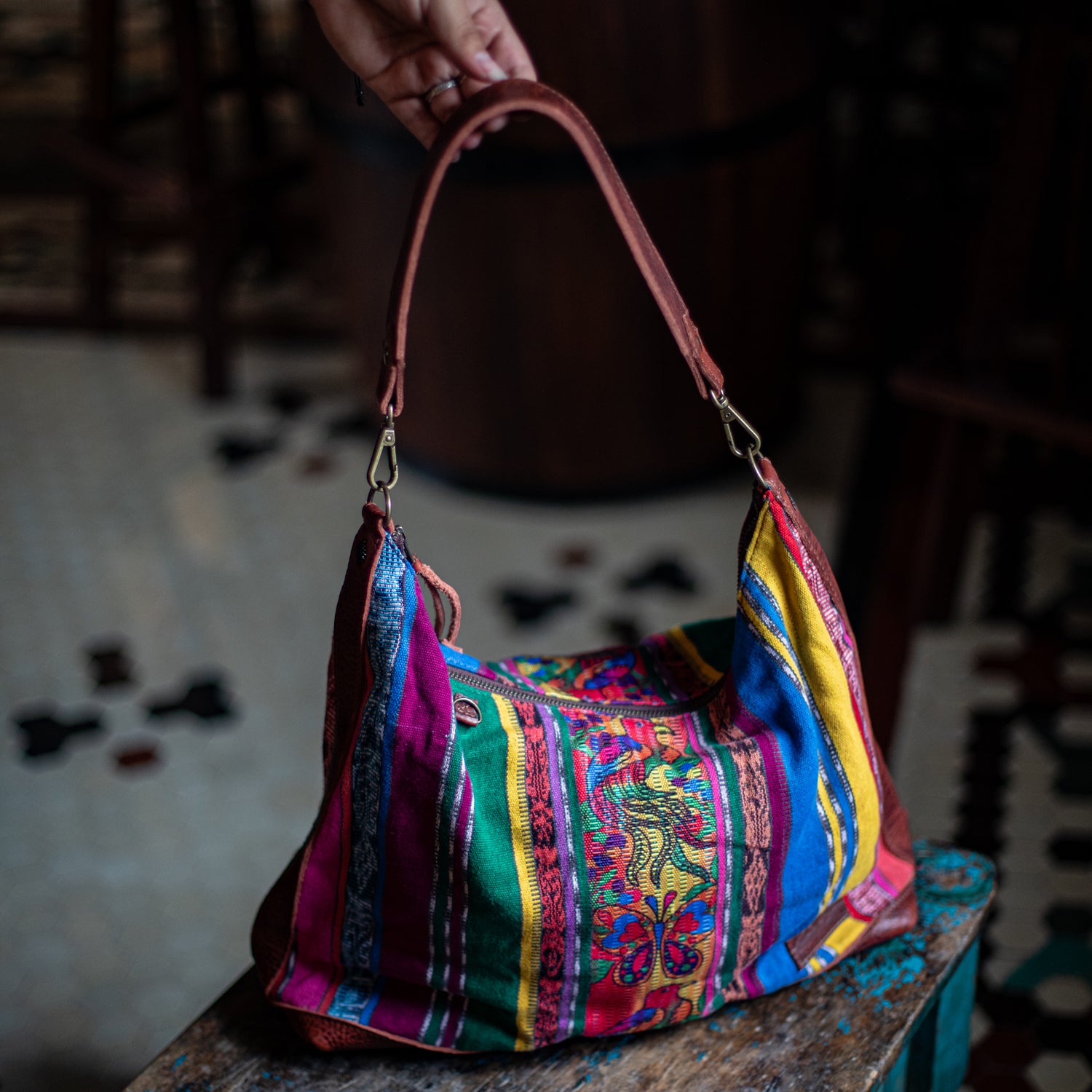 We make every effort to provide our customers with the best-handcrafted and high-quality bags. Please note that all our processes to make the bags are done by hand, from curing, cutting, and treating the leather to using up-cycled huipils. Our bags have natural characteristics and qualities that should not be considered as flaws or as damage because they do not interfere with the functionality of the bag. We up-cycle vintage Maya clothing to make beautiful one-of-a-kind products. Many times you will find snags in the pattern. This is normal. Should your patterned huipil snag you can snip the loose threads with scissors. Do not pull them.