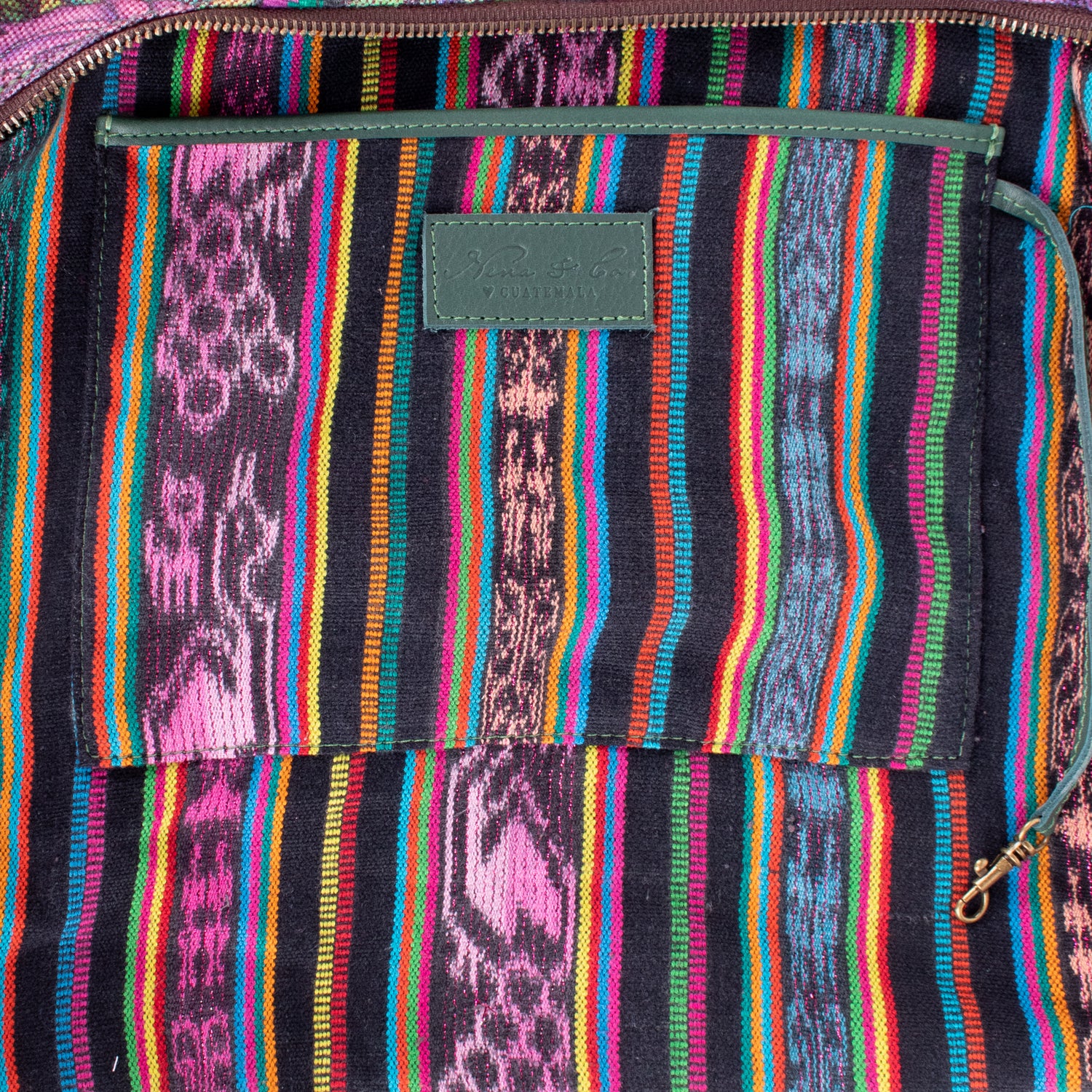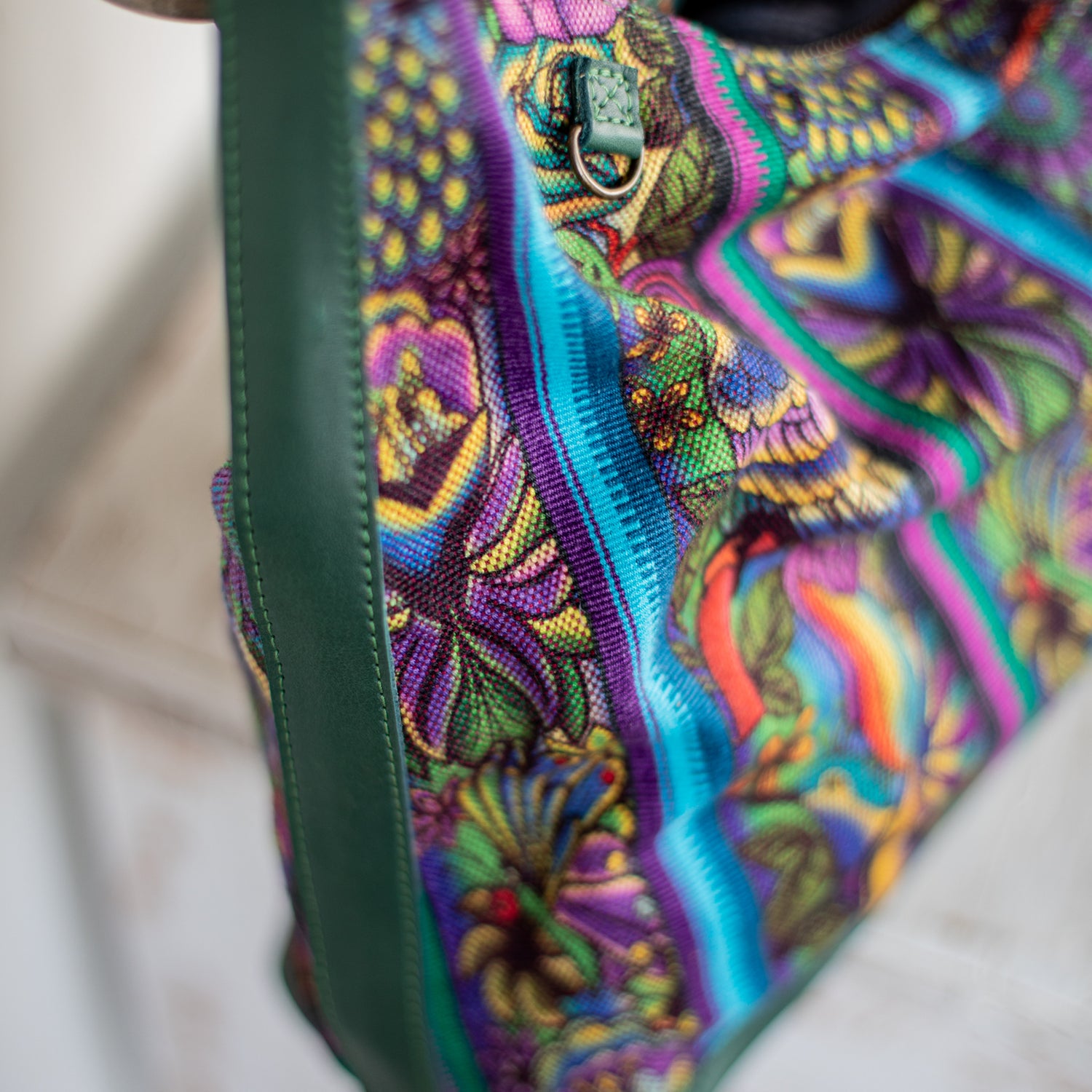 Many unique Maya symbols can be found in our One of a Kind Collection. The fabric we use for this collection is made from upcycled vintage huipiles (traditional attire worn by women in Guatemala) that were handwoven by Artisans up to 10 years ago, and they have lived a full life before being incorporated into your leather bag!