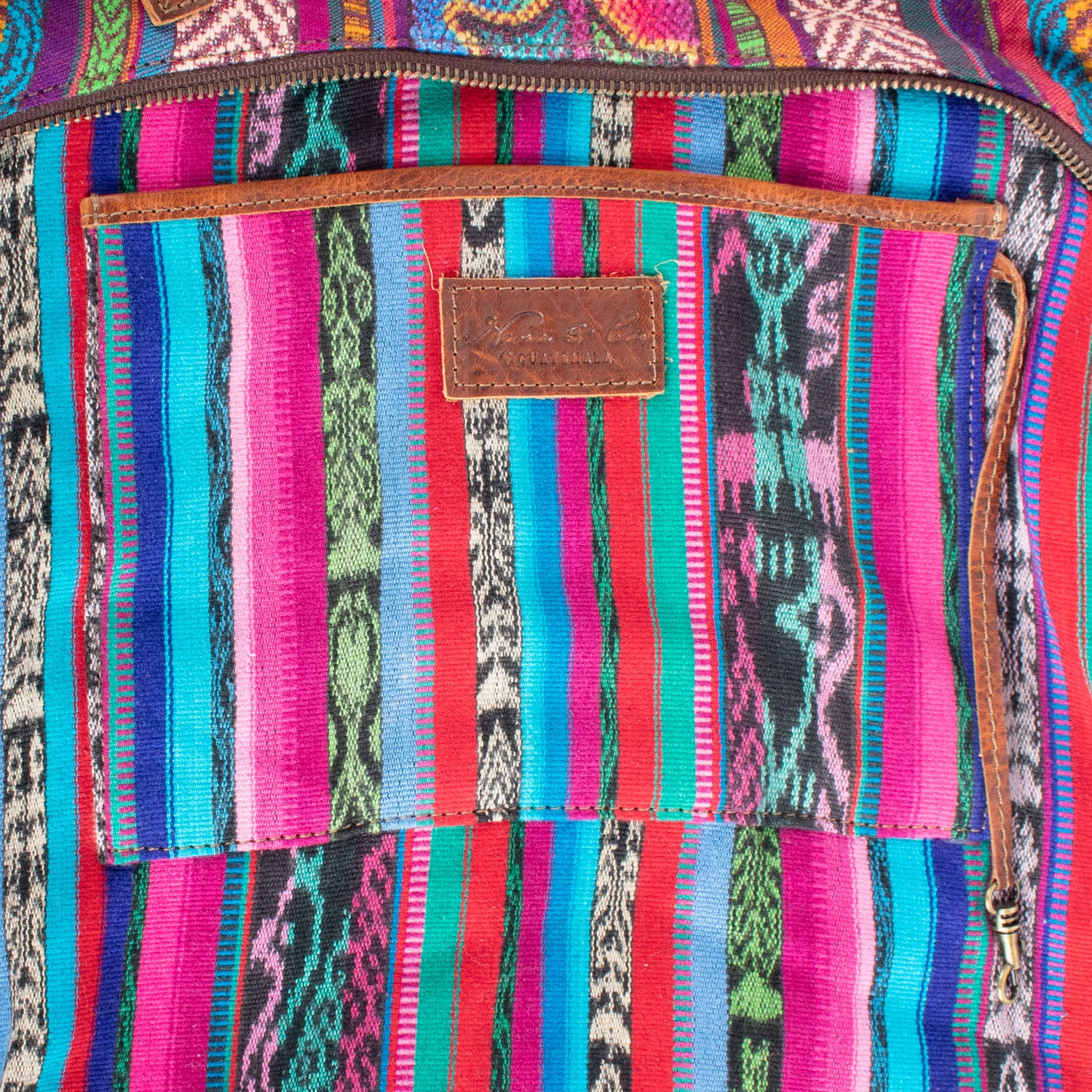Many unique Maya symbols can be found in our One of a Kind Collection. The fabric we use for this collection is made from upcycled vintage huipiles (traditional attire worn by women in Guatemala) that were handwoven by Artisans up to 10 years ago, and they have lived a full life before being incorporated into your leather bag!