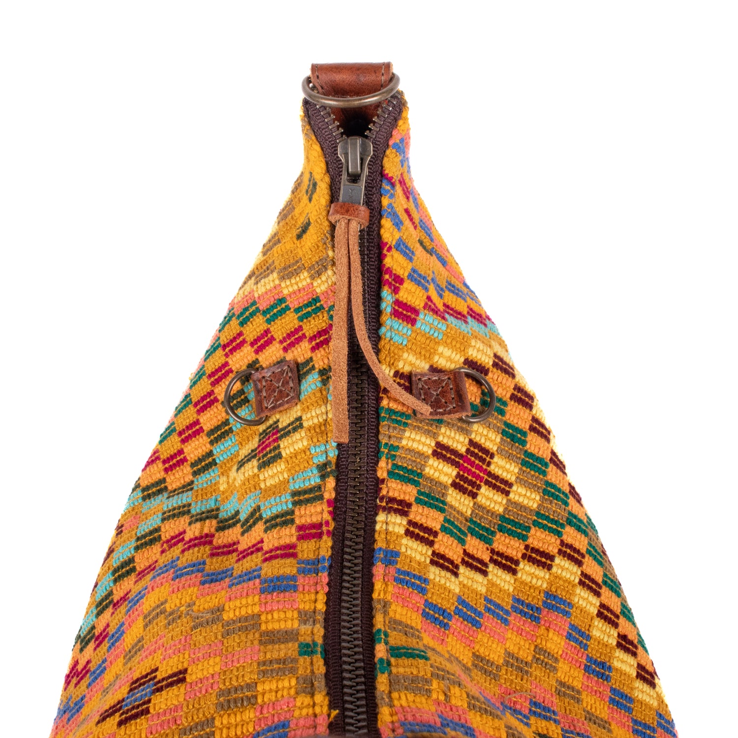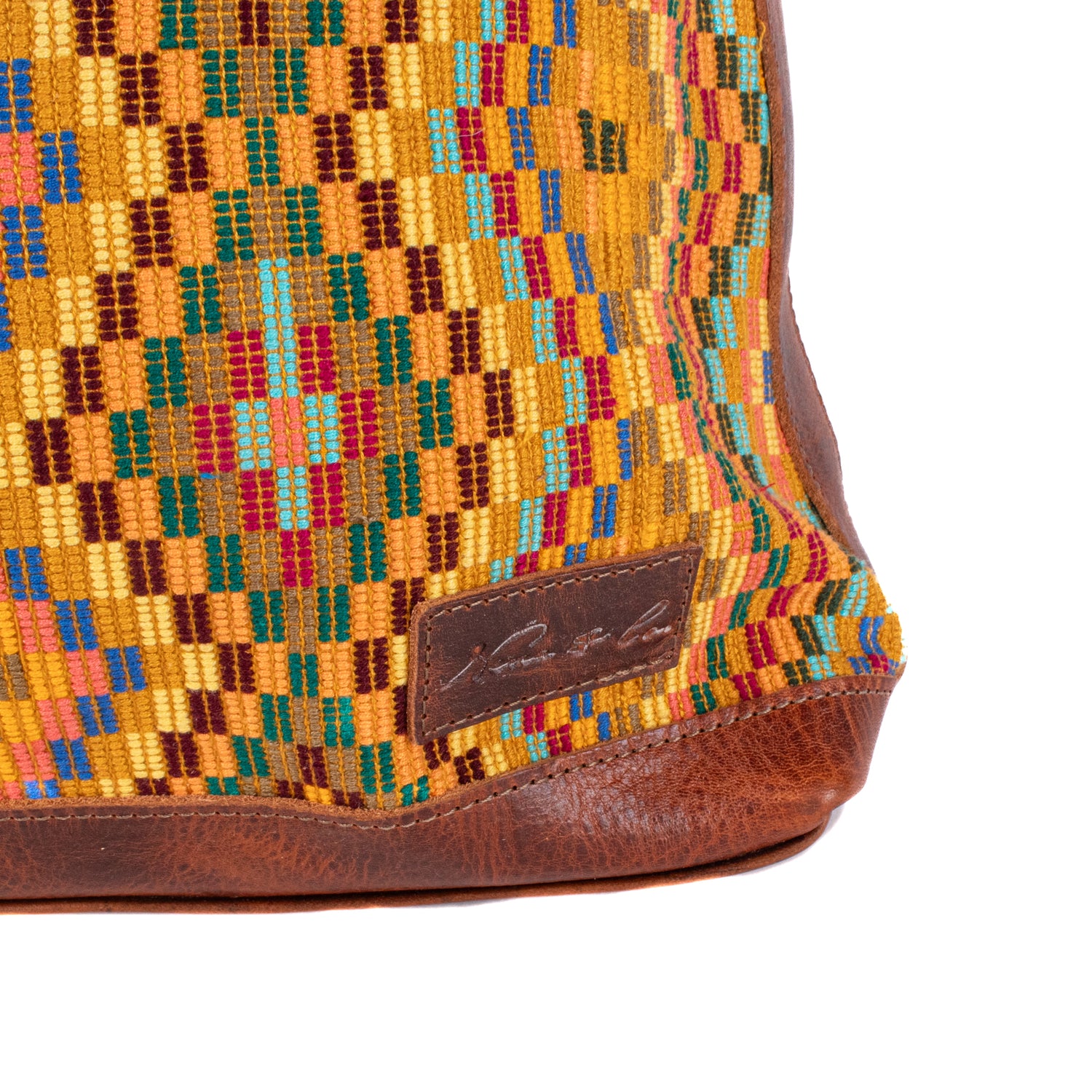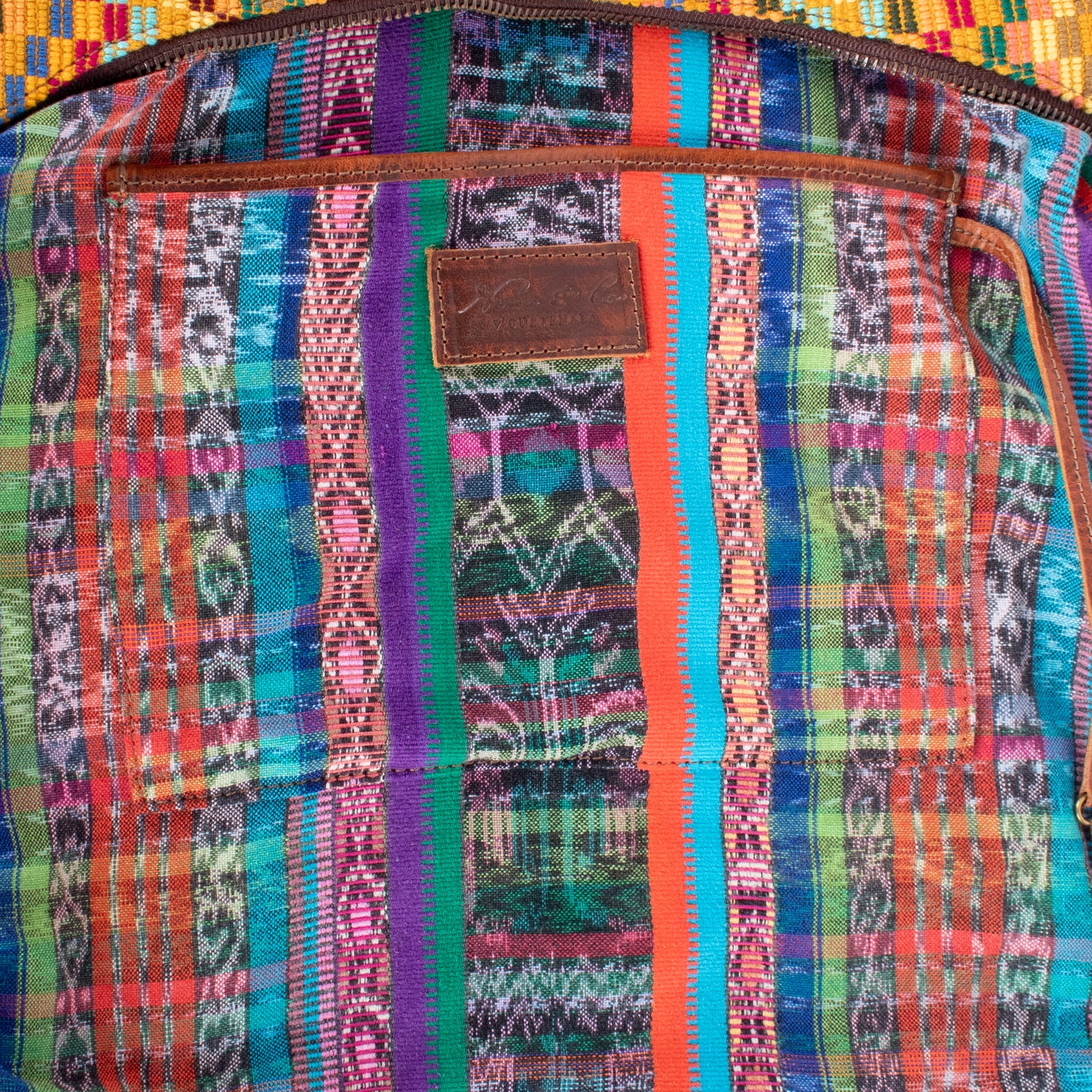 Many unique Maya symbols can be found in our One of a Kind Collection. The fabric we use for this collection is made from upcycled vintage huipiles (traditional attire worn by women in Guatemala) that were handwoven by Artisans up to 10 years ago, and they have lived a full life before being incorporated into your leather bag!