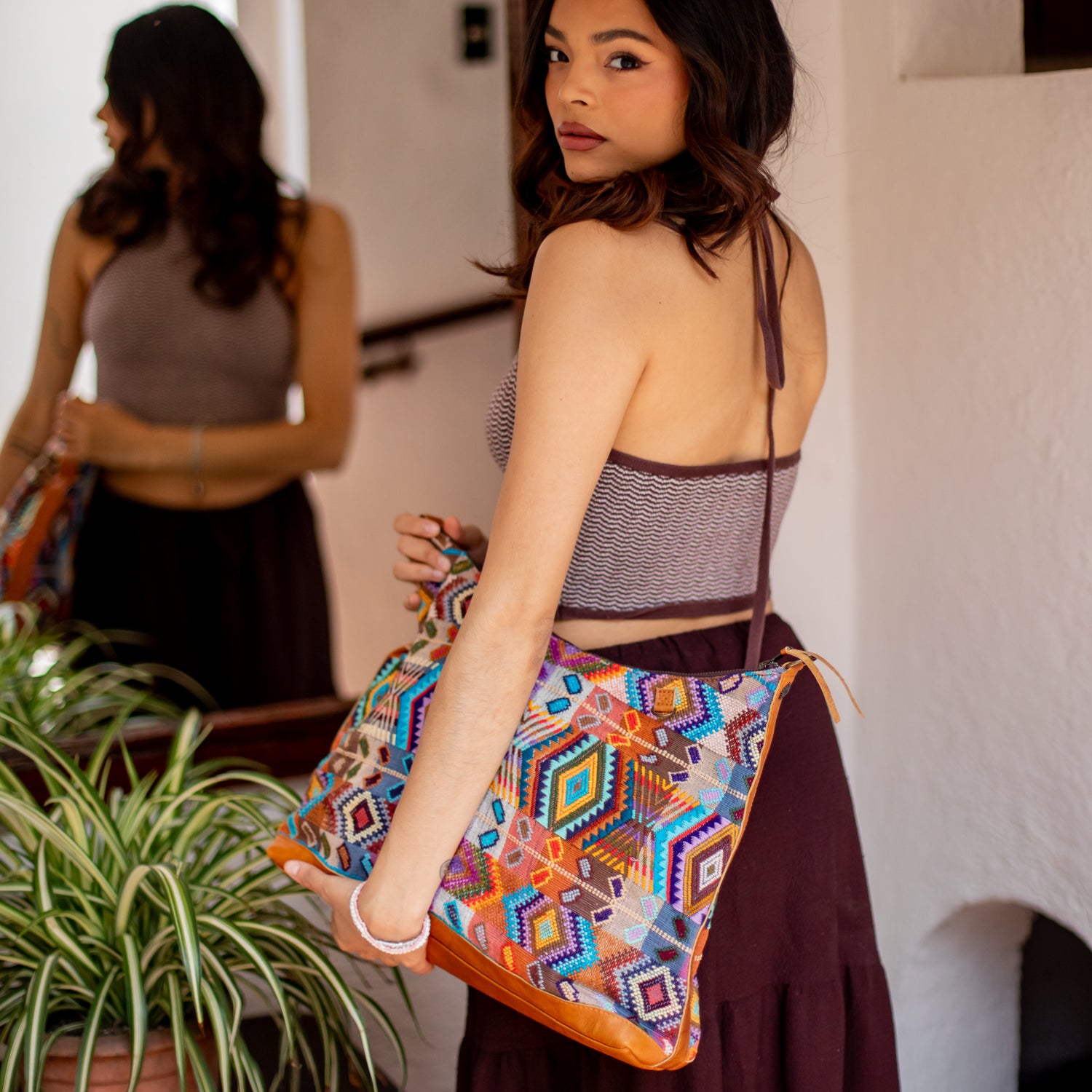 Many unique Maya symbols can be found in our One of a Kind Collection. The fabric we use for this collection is made from upcycled vintage huipiles (traditional attire worn by women in Guatemala) that were handwoven by Artisans up to 10 years ago, and they have lived a full life before being incorporated into your leather bag!