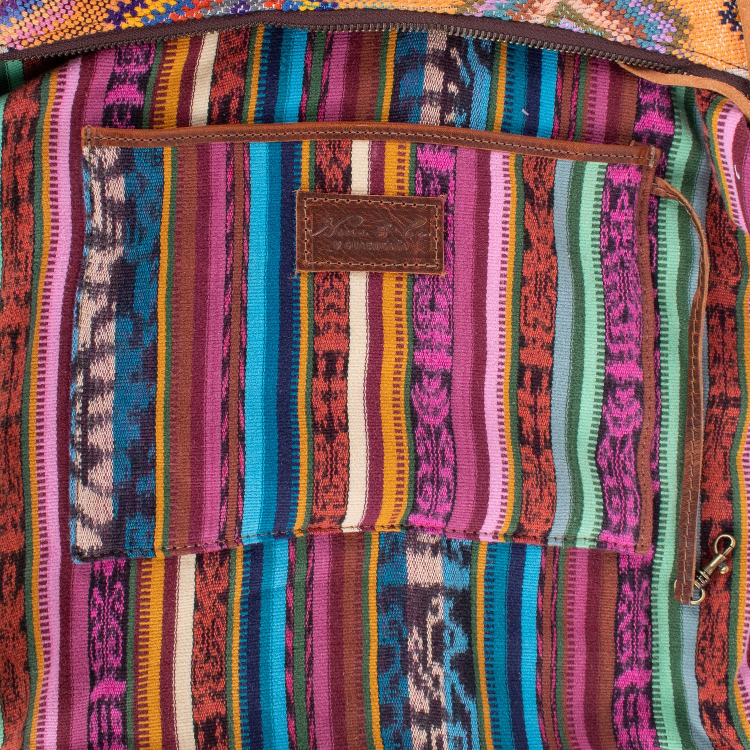 Many unique Maya symbols can be found in our One of a Kind Collection. The fabric we use for this collection is made from upcycled vintage huipiles (traditional attire worn by women in Guatemala) that were handwoven by Artisans up to 10 years ago, and they have lived a full life before being incorporated into your leather bag!