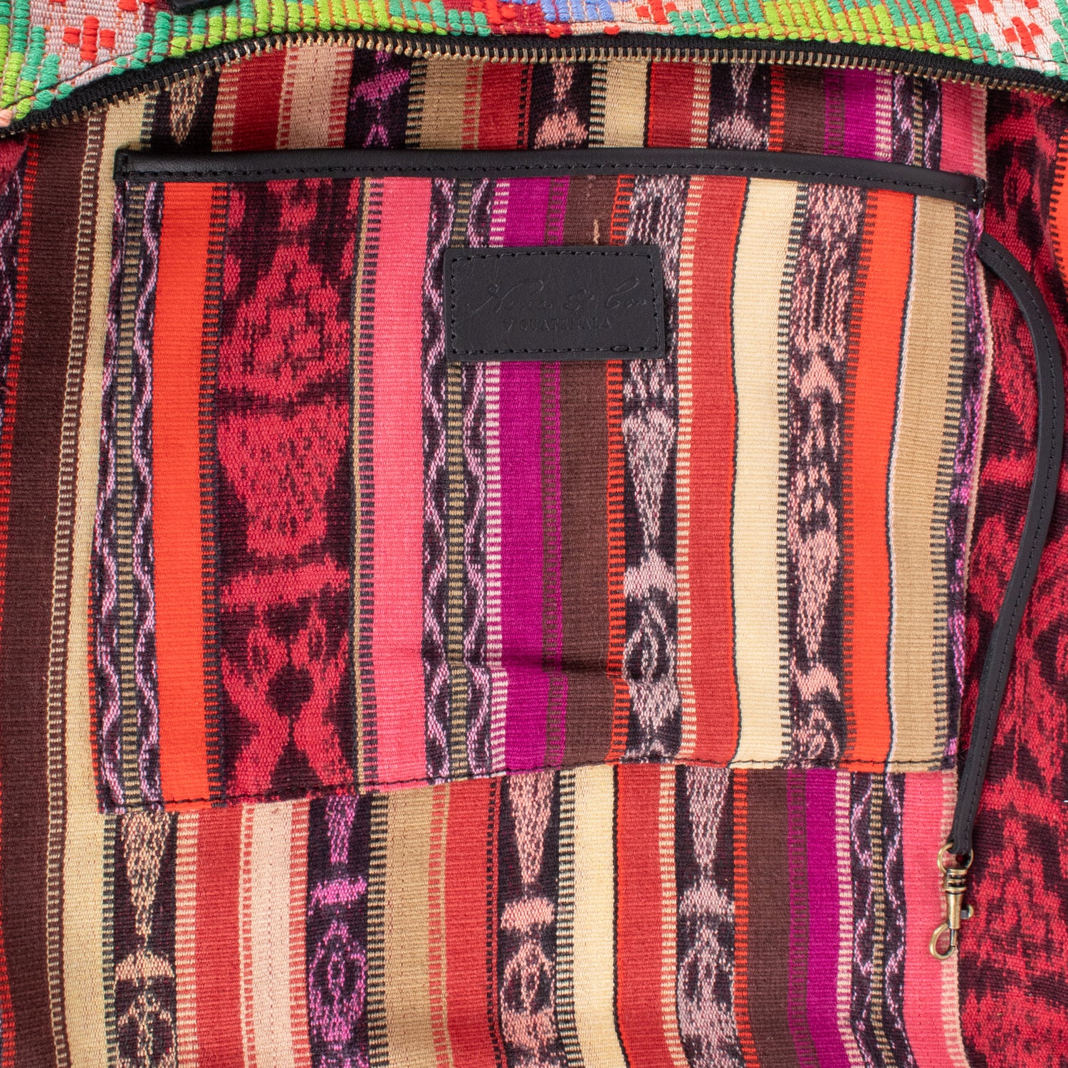 Many unique Maya symbols can be found in our One of a Kind Collection. The fabric we use for this collection is made from upcycled vintage huipiles (traditional attire worn by women in Guatemala) that were handwoven by Artisans up to 10 years ago, and they have lived a full life before being incorporated into your leather bag!