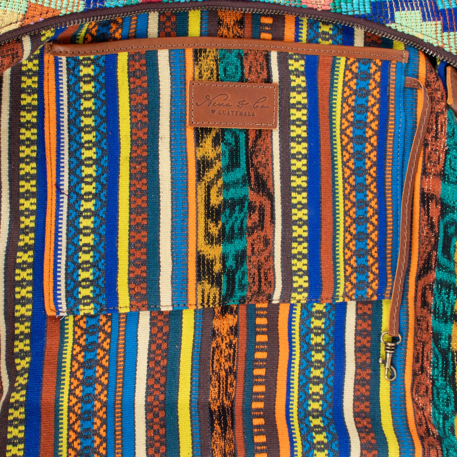 Many unique Maya symbols can be found in our One of a Kind Collection. The fabric we use for this collection is made from upcycled vintage huipiles (traditional attire worn by women in Guatemala) that were handwoven by Artisans up to 10 years ago, and they have lived a full life before being incorporated into your leather bag!