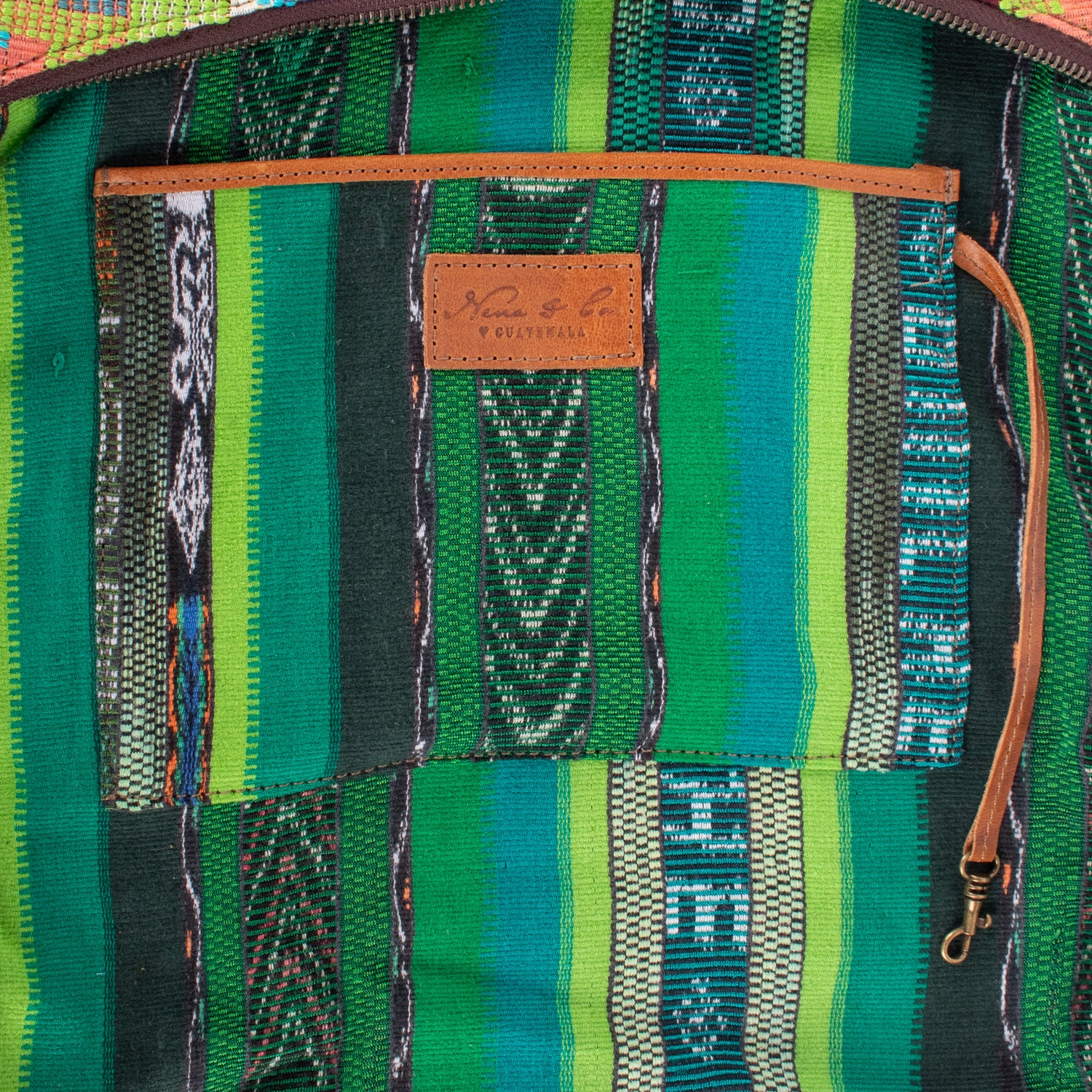 Many unique Maya symbols can be found in our One of a Kind Collection. The fabric we use for this collection is made from upcycled vintage huipiles (traditional attire worn by women in Guatemala) that were handwoven by Artisans up to 10 years ago, and they have lived a full life before being incorporated into your leather bag!