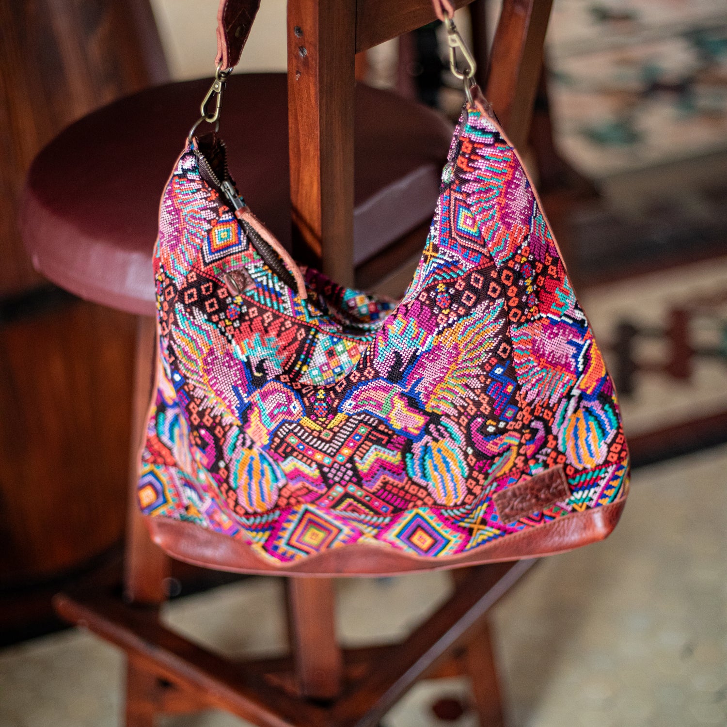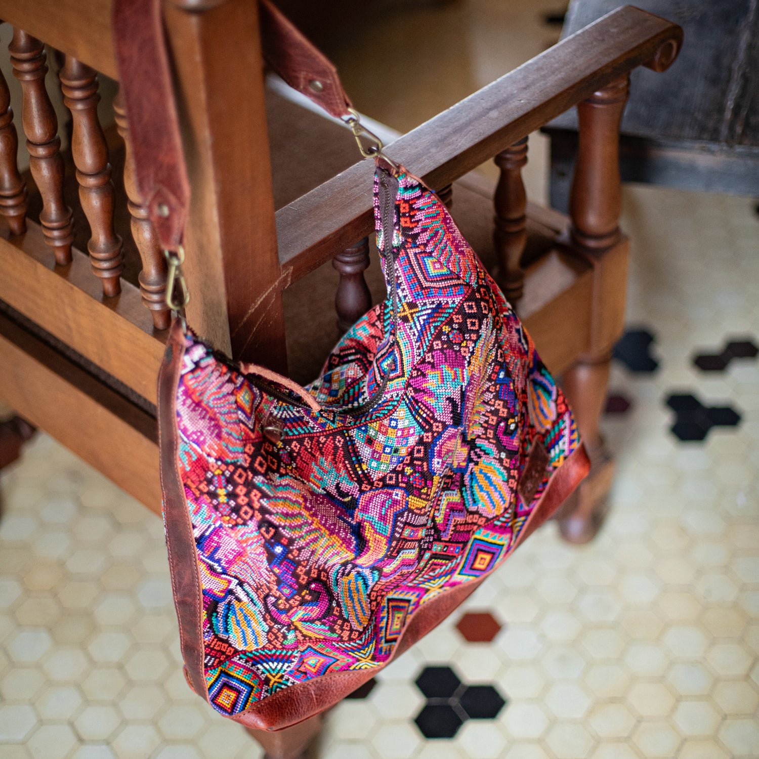 We make every effort to provide our customers with the best-handcrafted and high-quality bags. Please note that all our processes to make the bags are done by hand, from curing, cutting, and treating the leather to using up-cycled huipils. Our bags have natural characteristics and qualities that should not be considered as flaws or as damage because they do not interfere with the functionality of the bag. We up-cycle vintage Maya clothing to make beautiful one-of-a-kind products. Many times you will find snags in the pattern. This is normal. Should your patterned huipil snag you can snip the loose threads with scissors. Do not pull them.