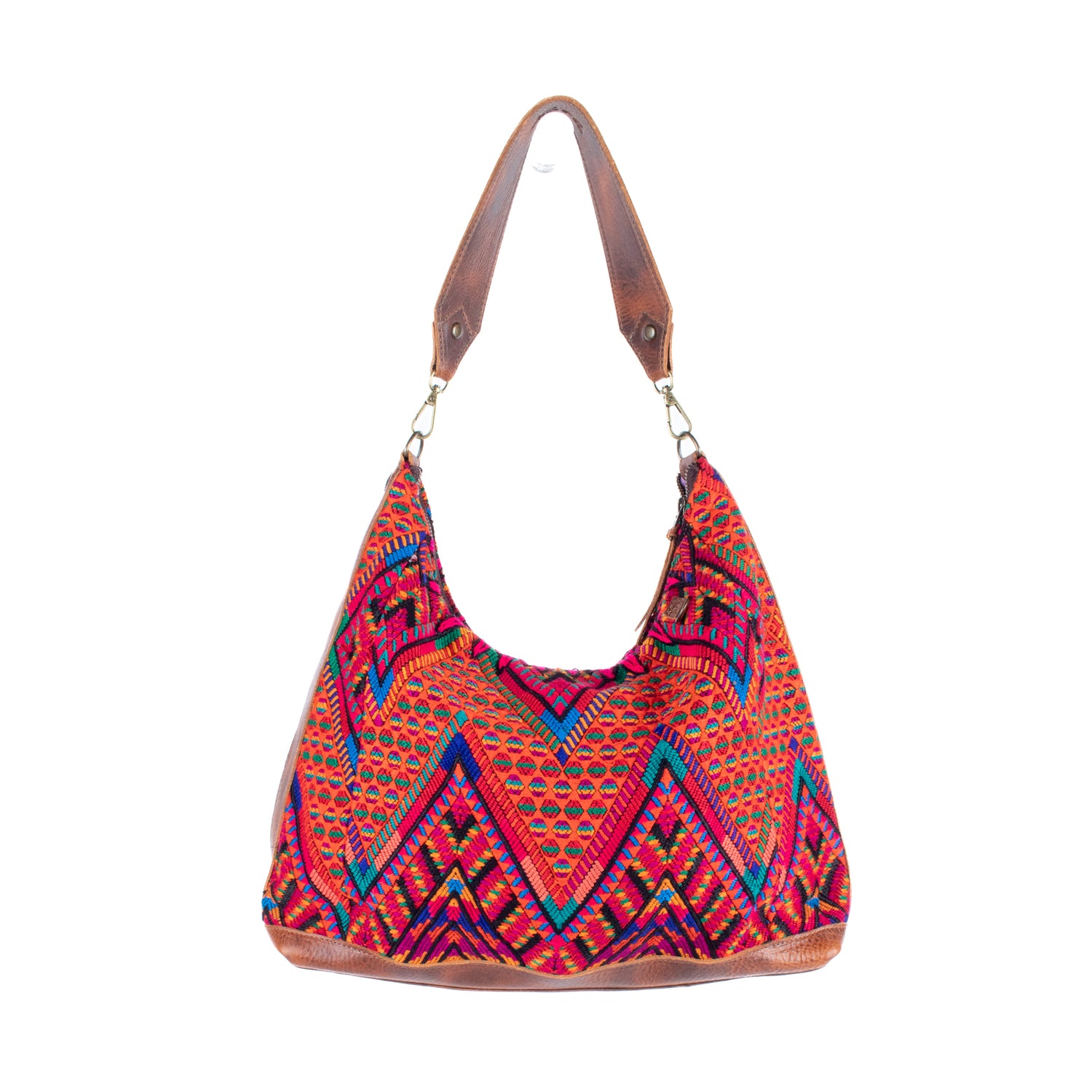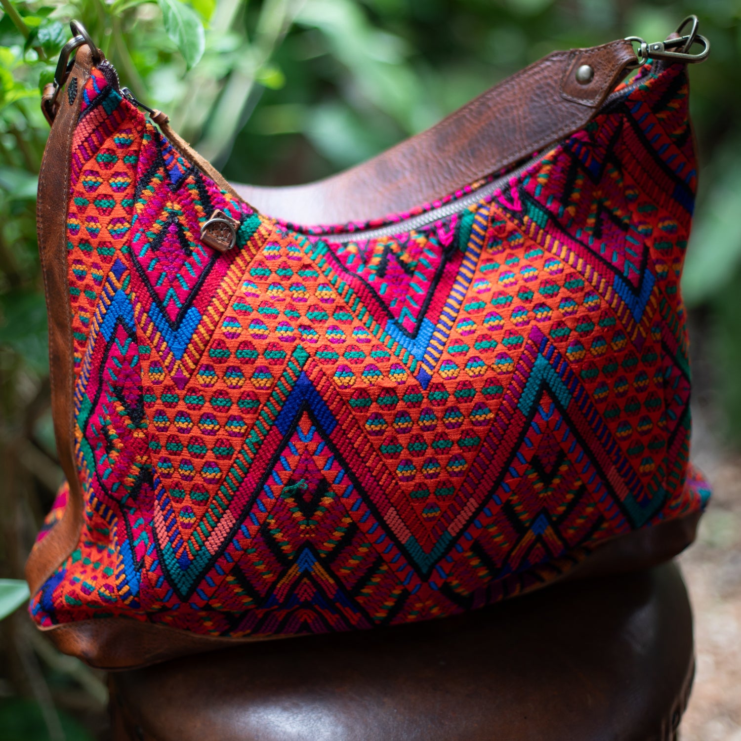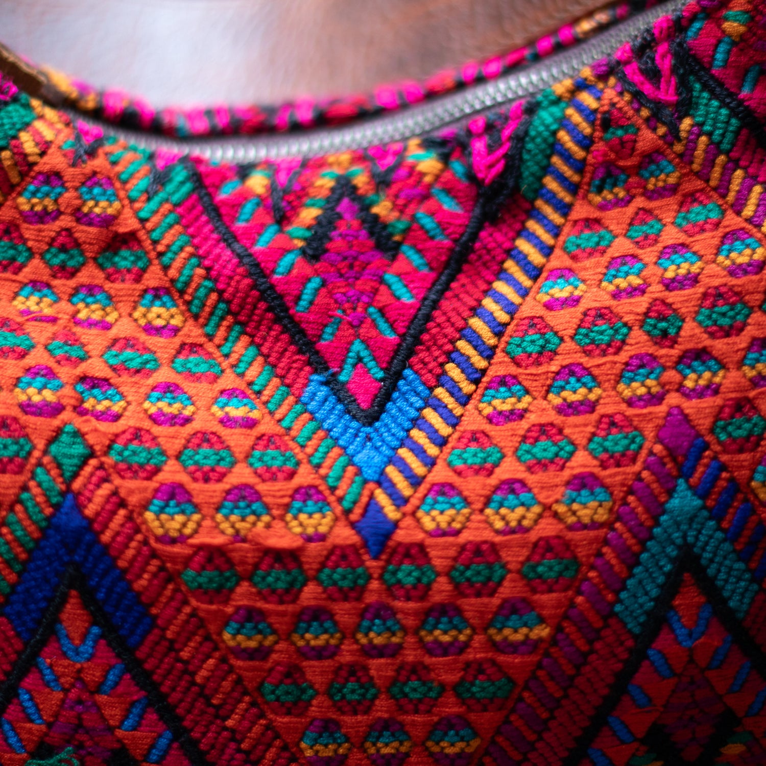 Many unique Maya symbols can be found in our One of a Kind Collection. The fabric we use for this collection is made from upcycled vintage huipiles (traditional attire worn by women in Guatemala) that were handwoven by Artisans up to 10 years ago, and they have lived a full life before being incorporated into your leather bag!