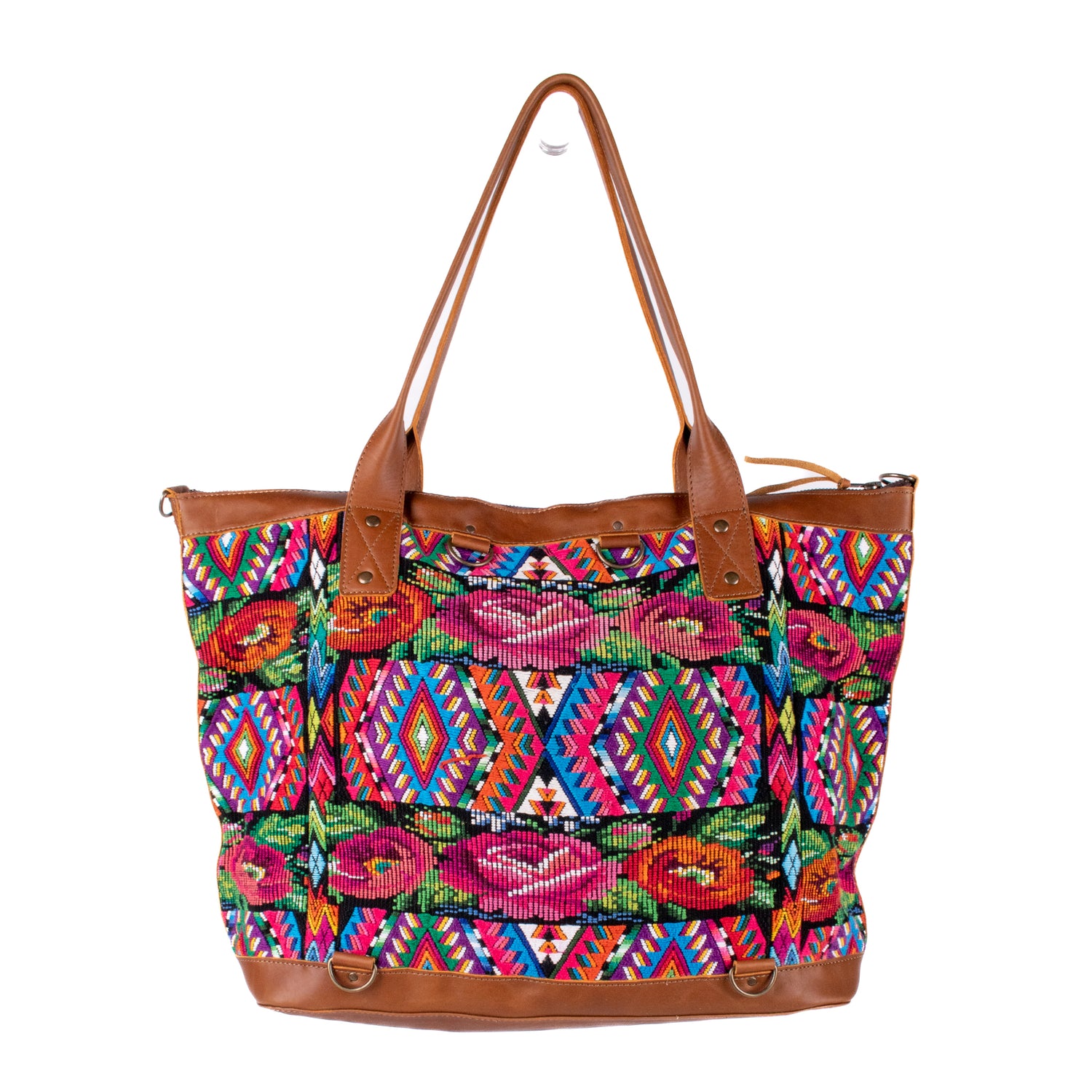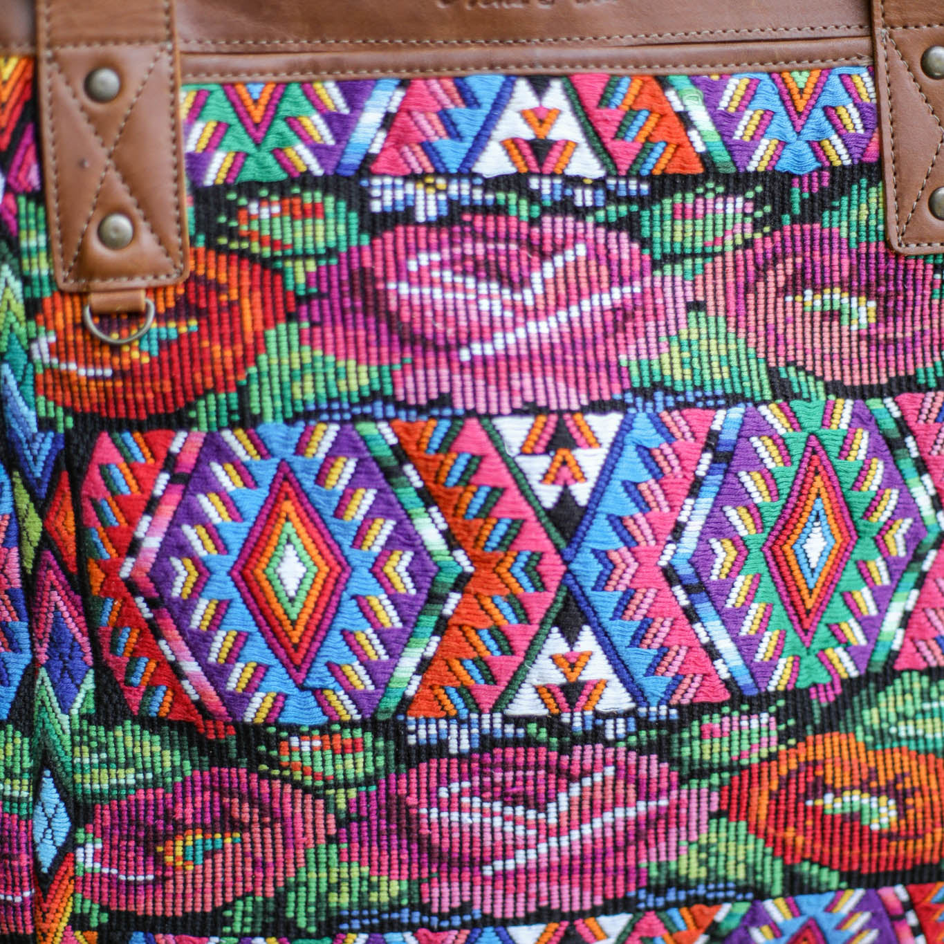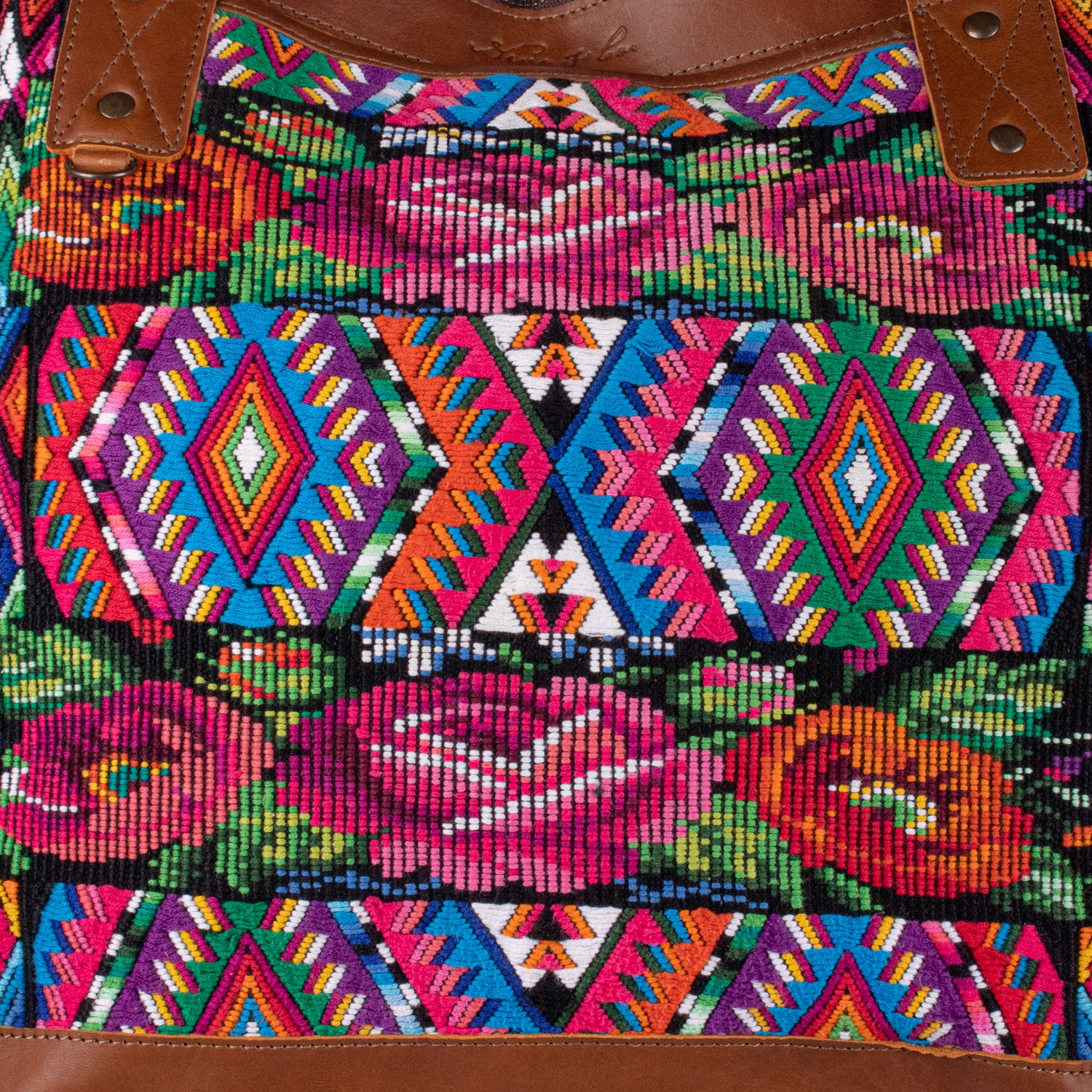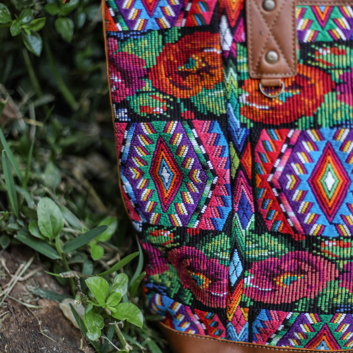 Many unique Maya symbols can be found in our One of a Kind Collection. The fabric we use for this collection is made from upcycled vintage huipiles (traditional attire worn by women in Guatemala) that were handwoven by Artisans up to 10 years ago, and they have lived a full life before being incorporated into your leather bag!