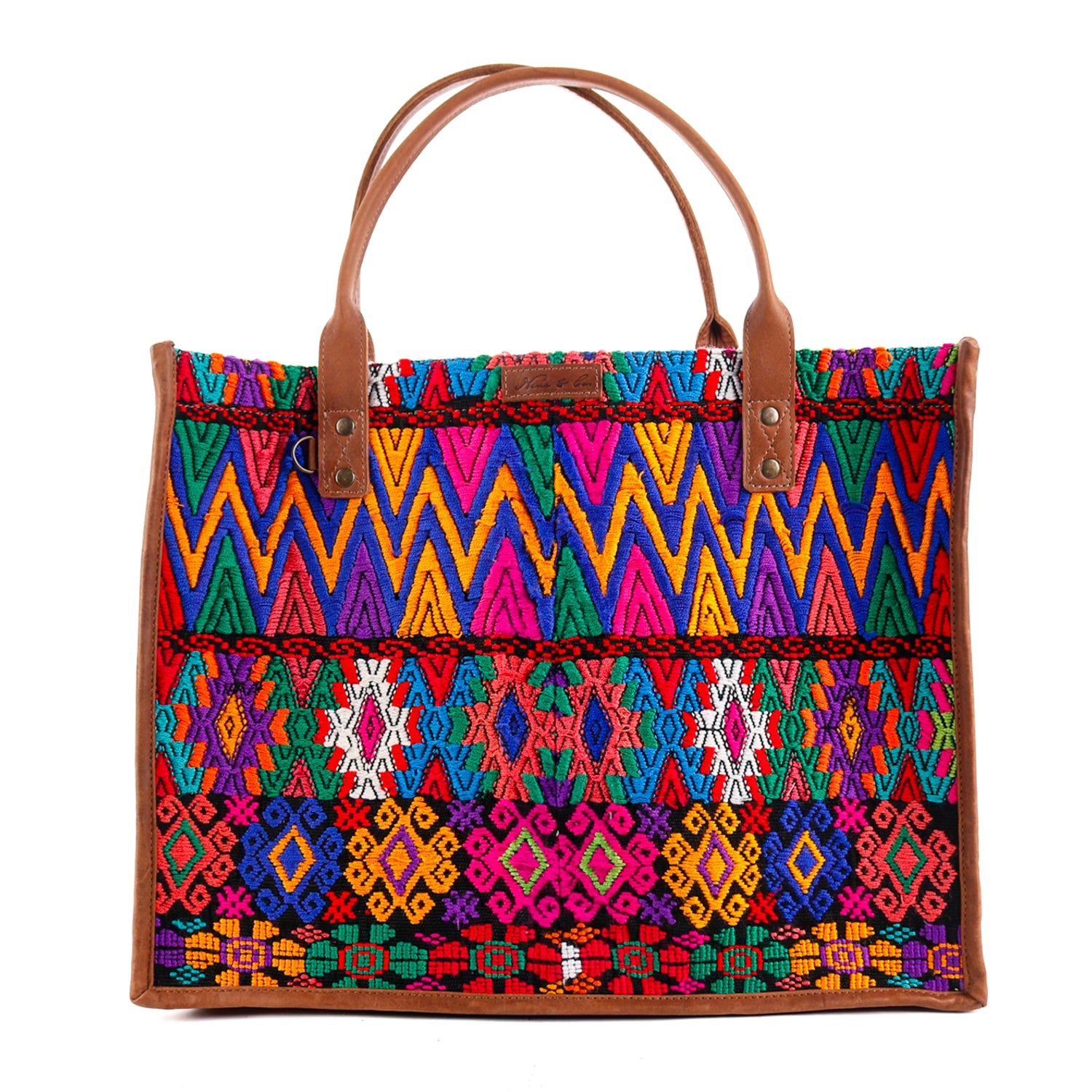Many unique Maya symbols can be found in our One of a Kind Collection. The fabric we use for this collection is made from upcycled vintage huipiles (traditional attire worn by women in Guatemala) that were handwoven by Artisans up to 10 years ago, and they have lived a full life before being incorporated into your leather bag!